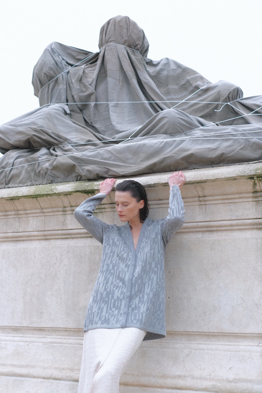 Глубокий вырез подчёркивает вертикаль силуэта, а лаконичная застежка на пуговицы сохраняет чистоту линий. Деликатная фактура добавляет сдержанной выразительности.