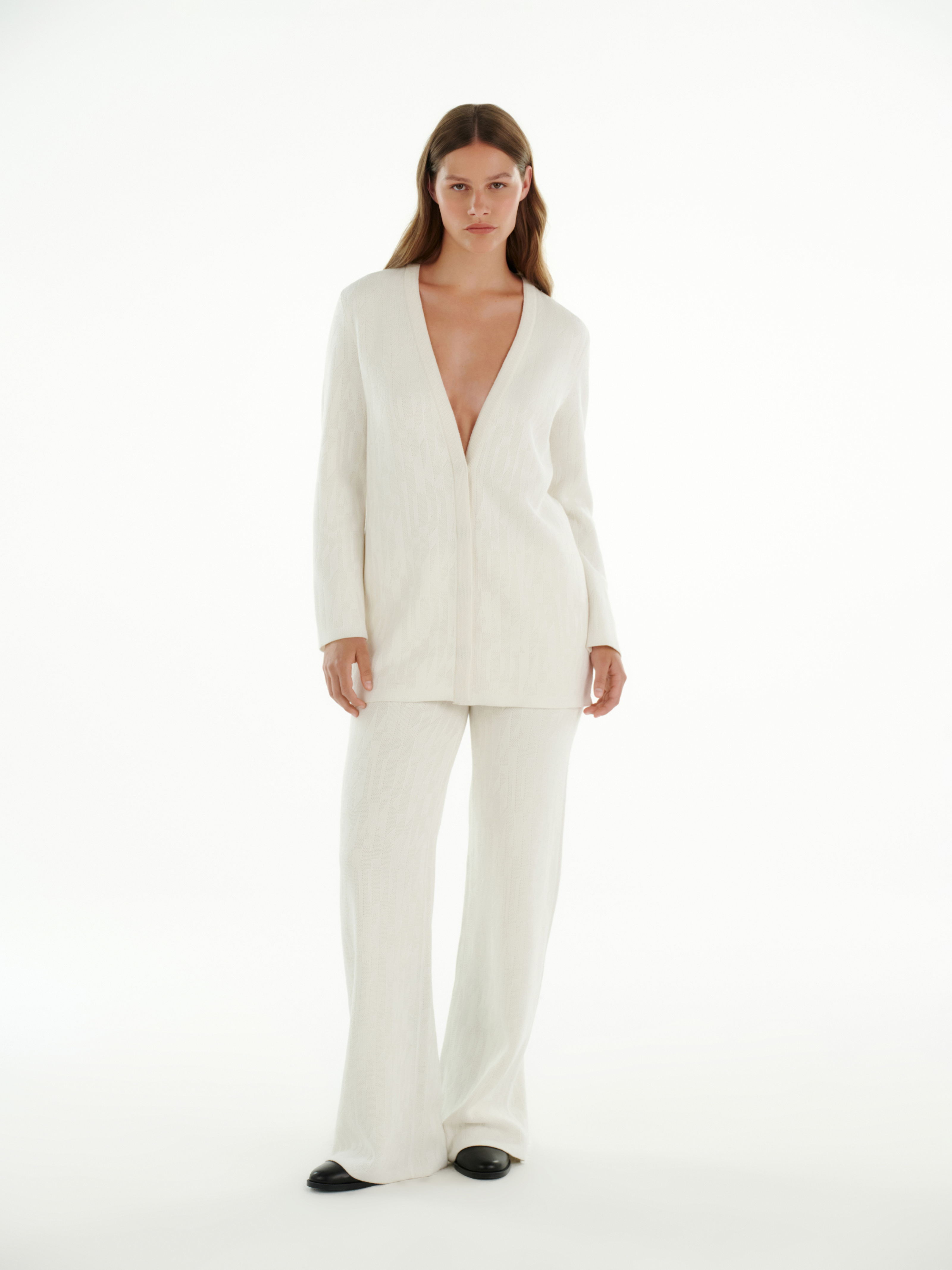 Прямые брюки из трикотажа с мериносовой шерстью и вискозой отличаются мягкой посадкой и комфортом за счёт эластичного пояса. Лаконичный крой подчёркнут едва заметным геометрическим узором, создающим глубину полотна.
