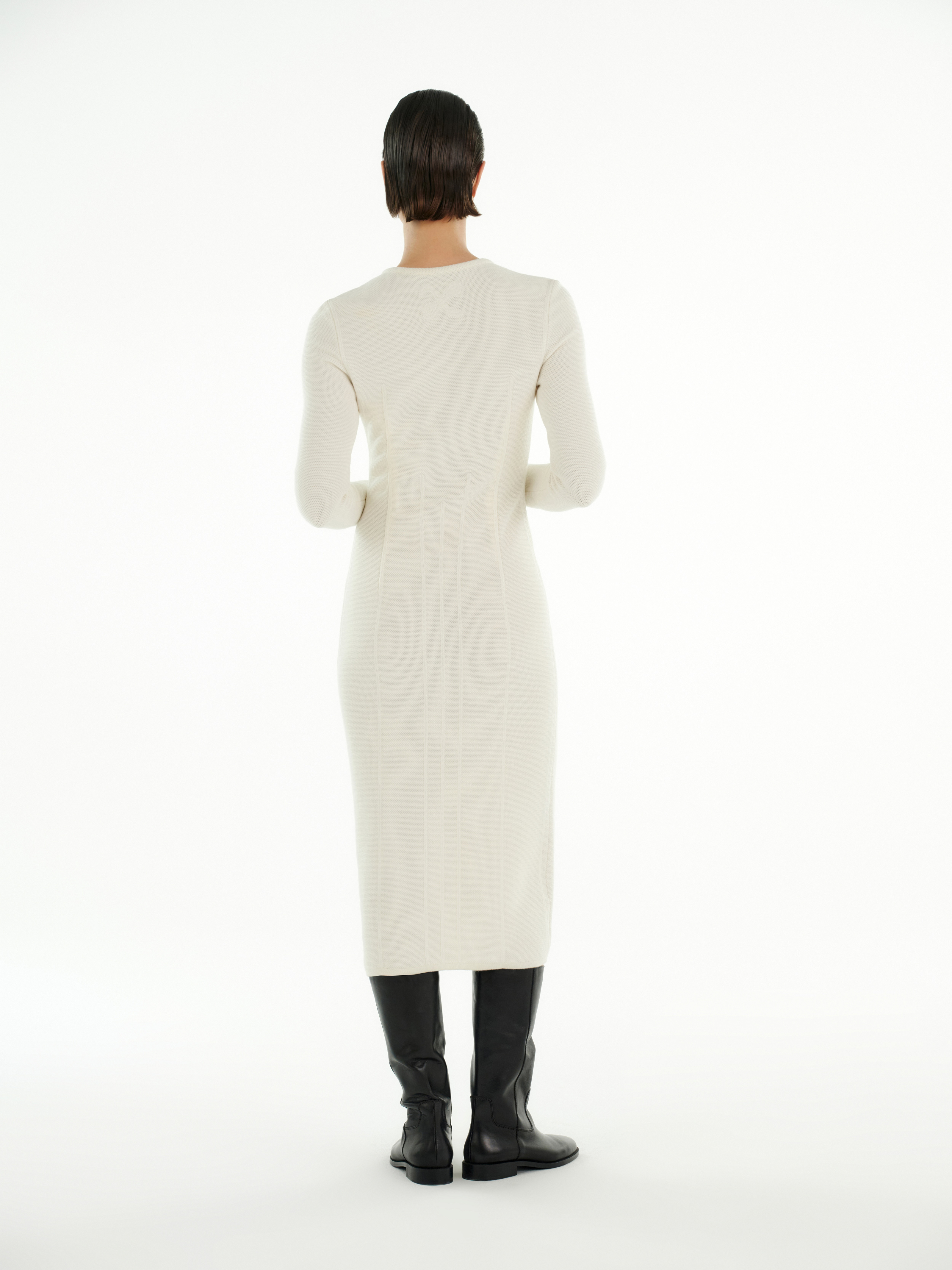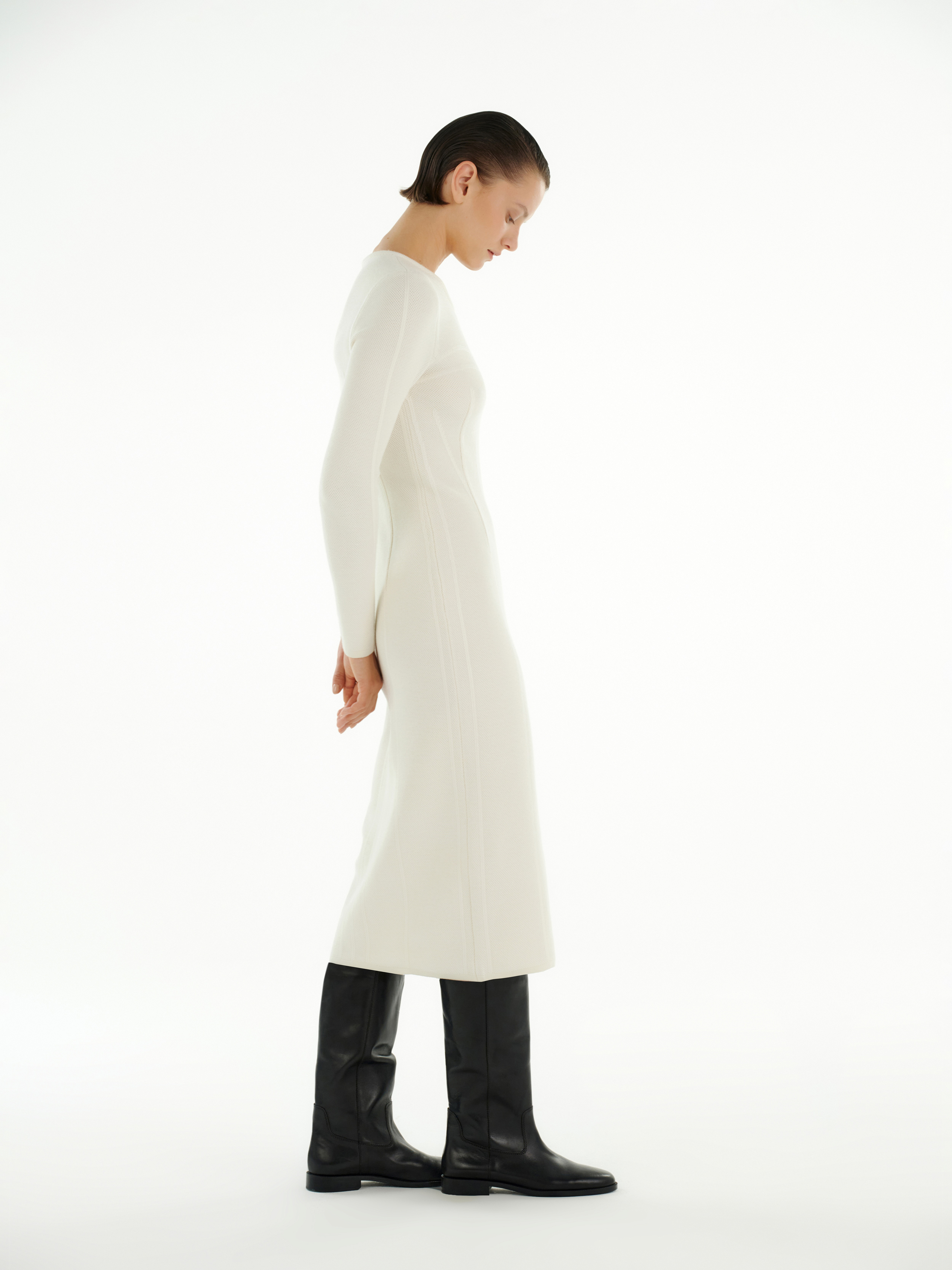 В молочном цвете платье приобретает ясность и лёгкость, усиливая минималистичный характер и делая его базовой вещью для разных сочетаний — от дневных до вечерних.