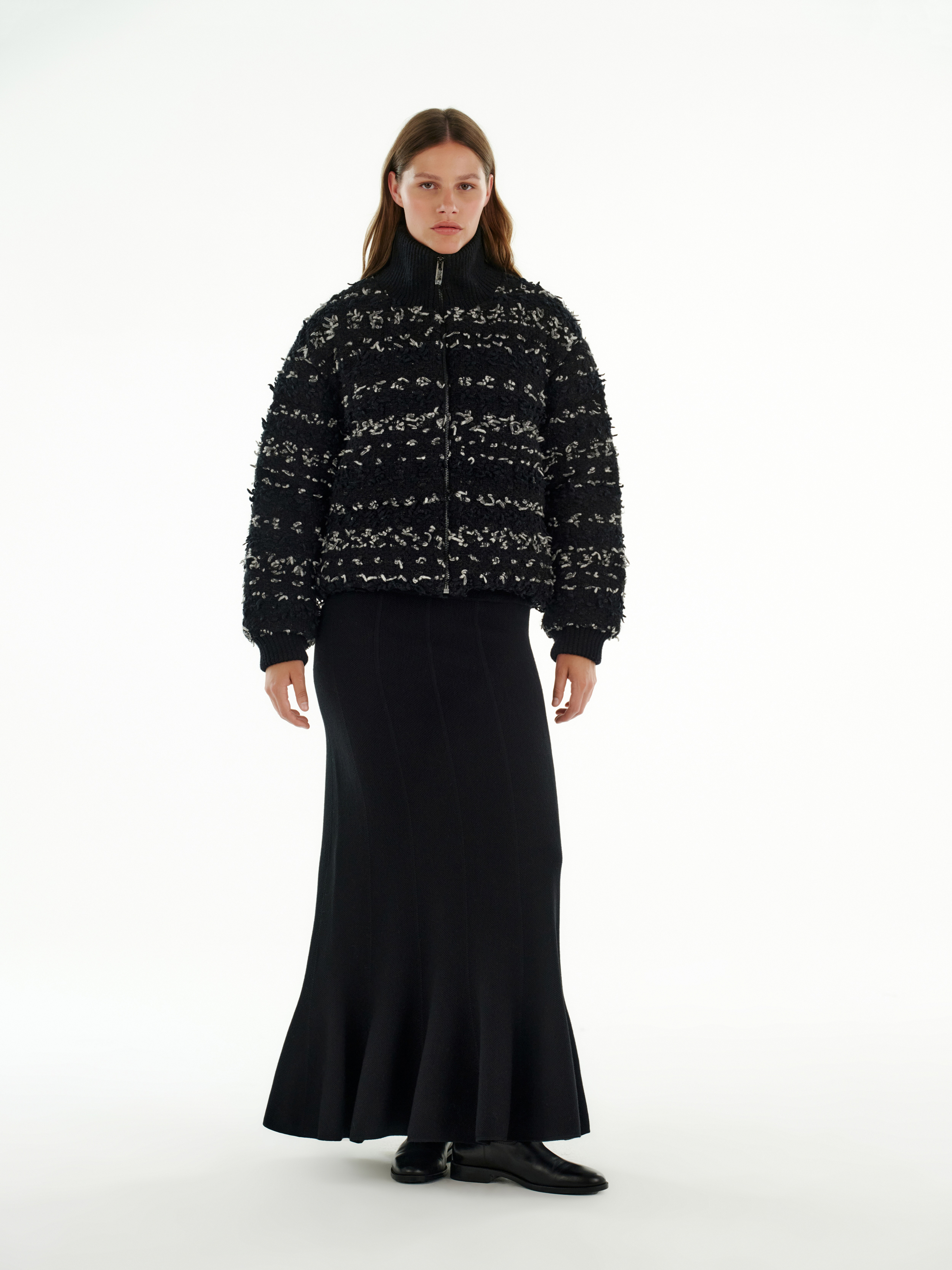Чёрный цвет усиливает графичность и делает модель универсальной: она легко сочетается как с лаконичными светлыми топами, так и с яркими акцентами или фактурными объёмными изделиями.