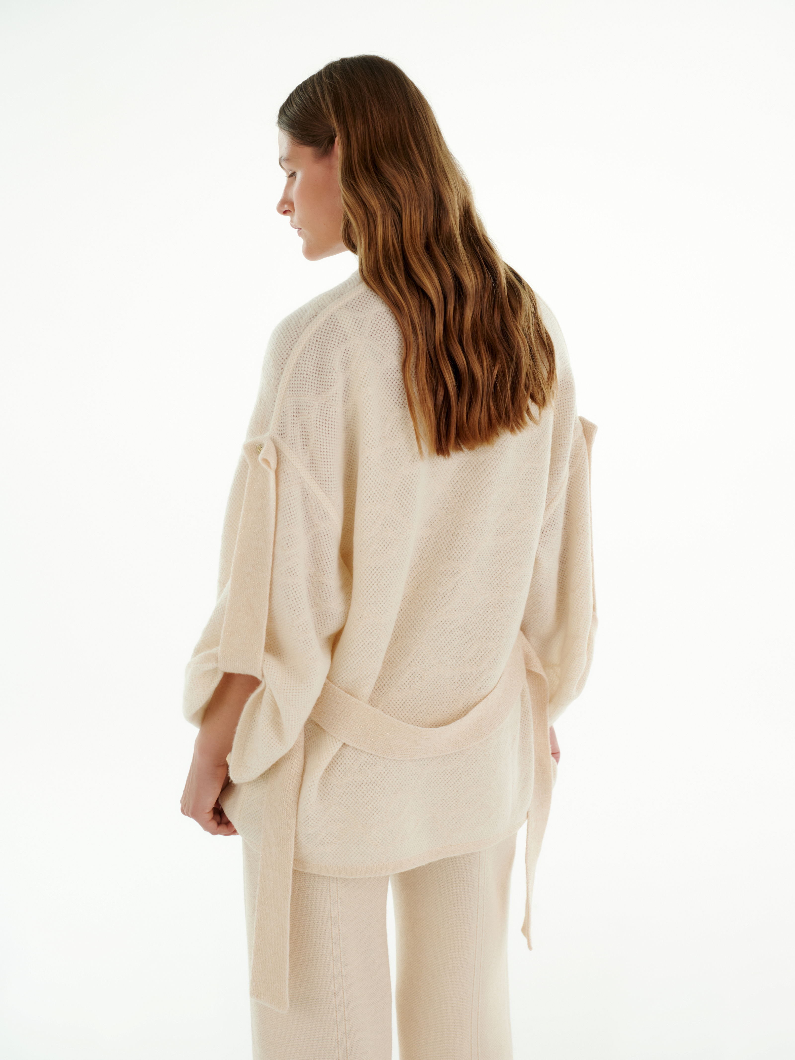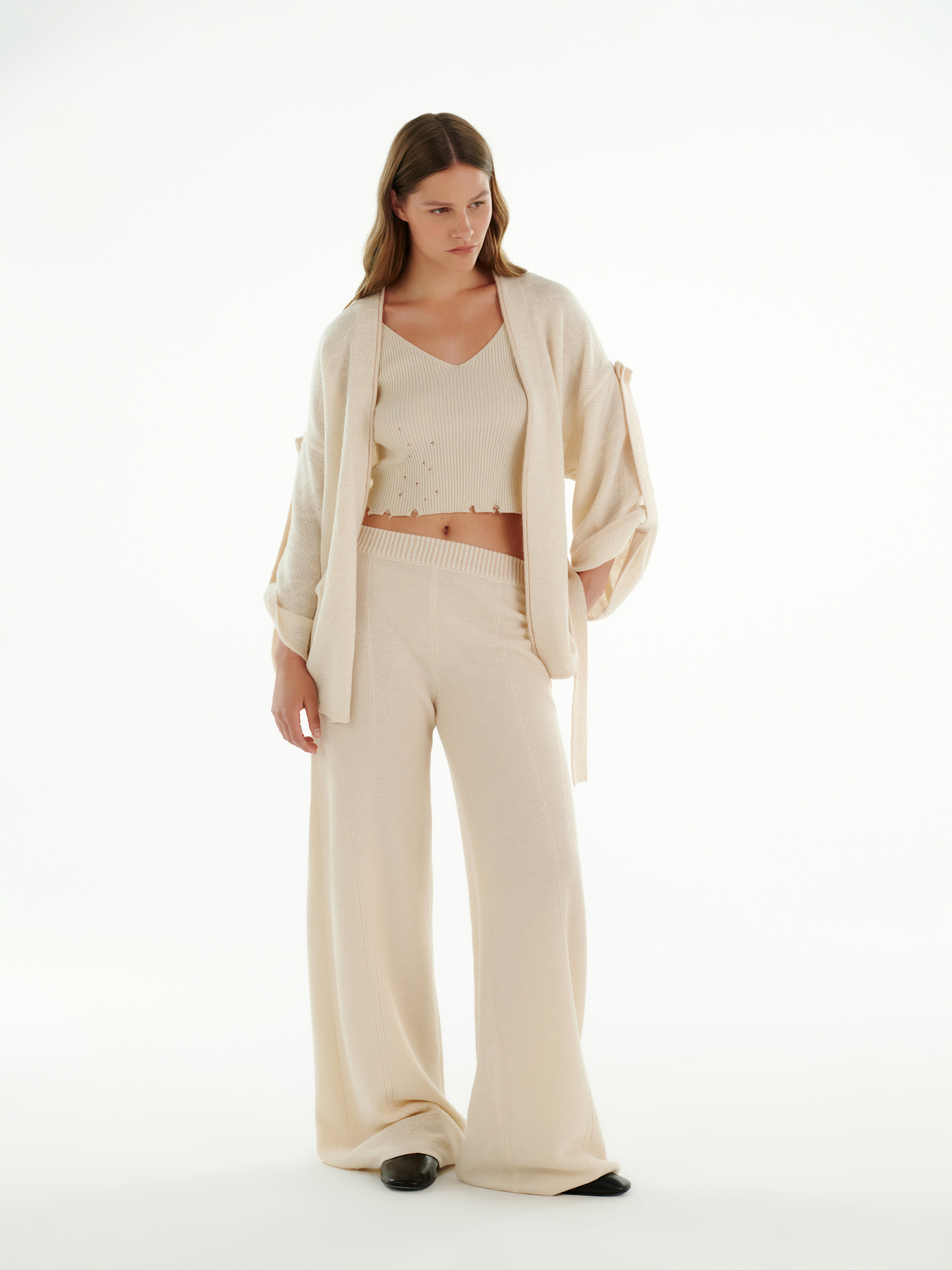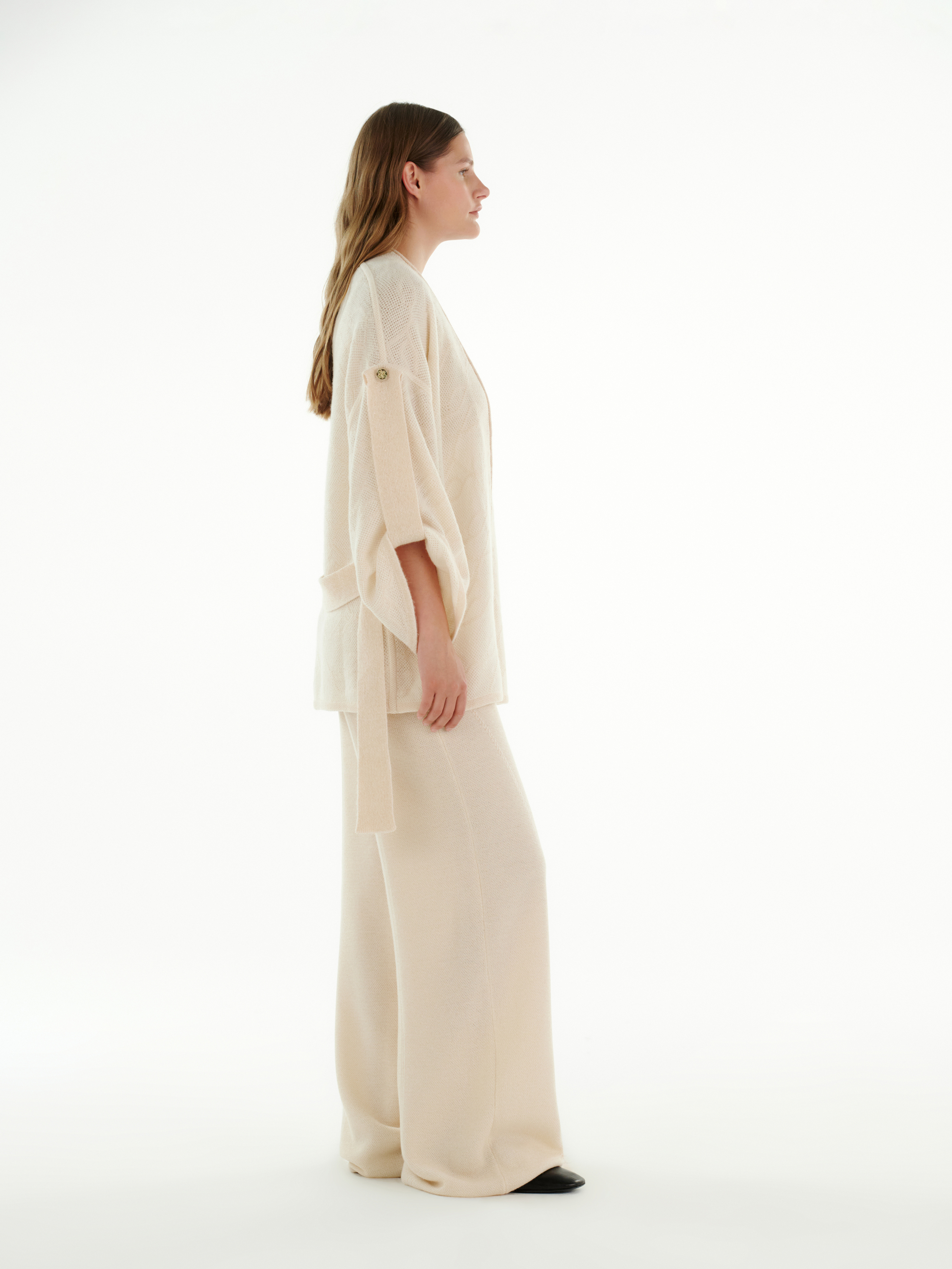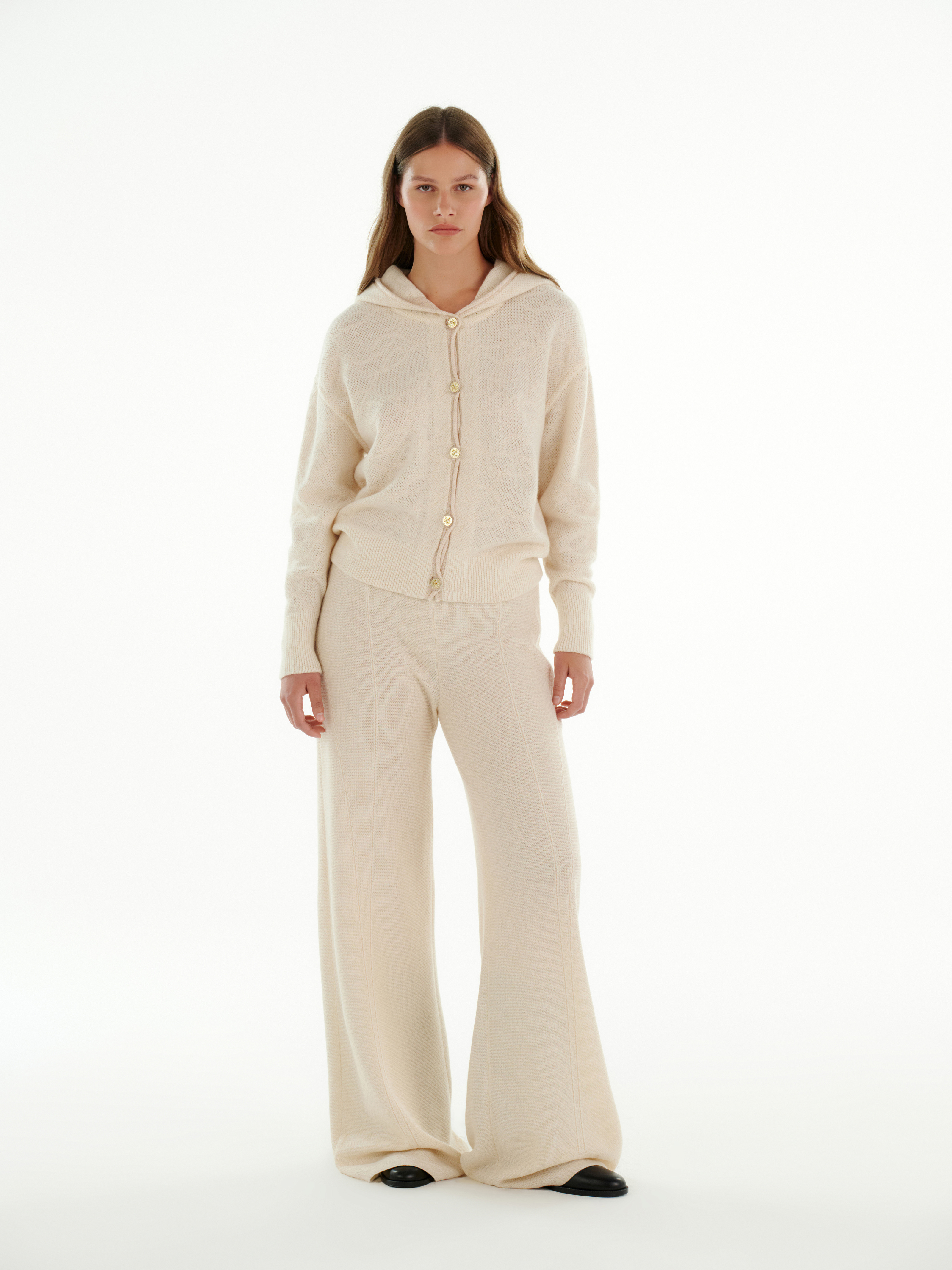 Брюки из кашемира в молочном цвете отличаются мягкой фактурой и лёгким струящимся силуэтом. Высокое содержание кашемира делает полотно особенно тёплым и нежным к коже.
