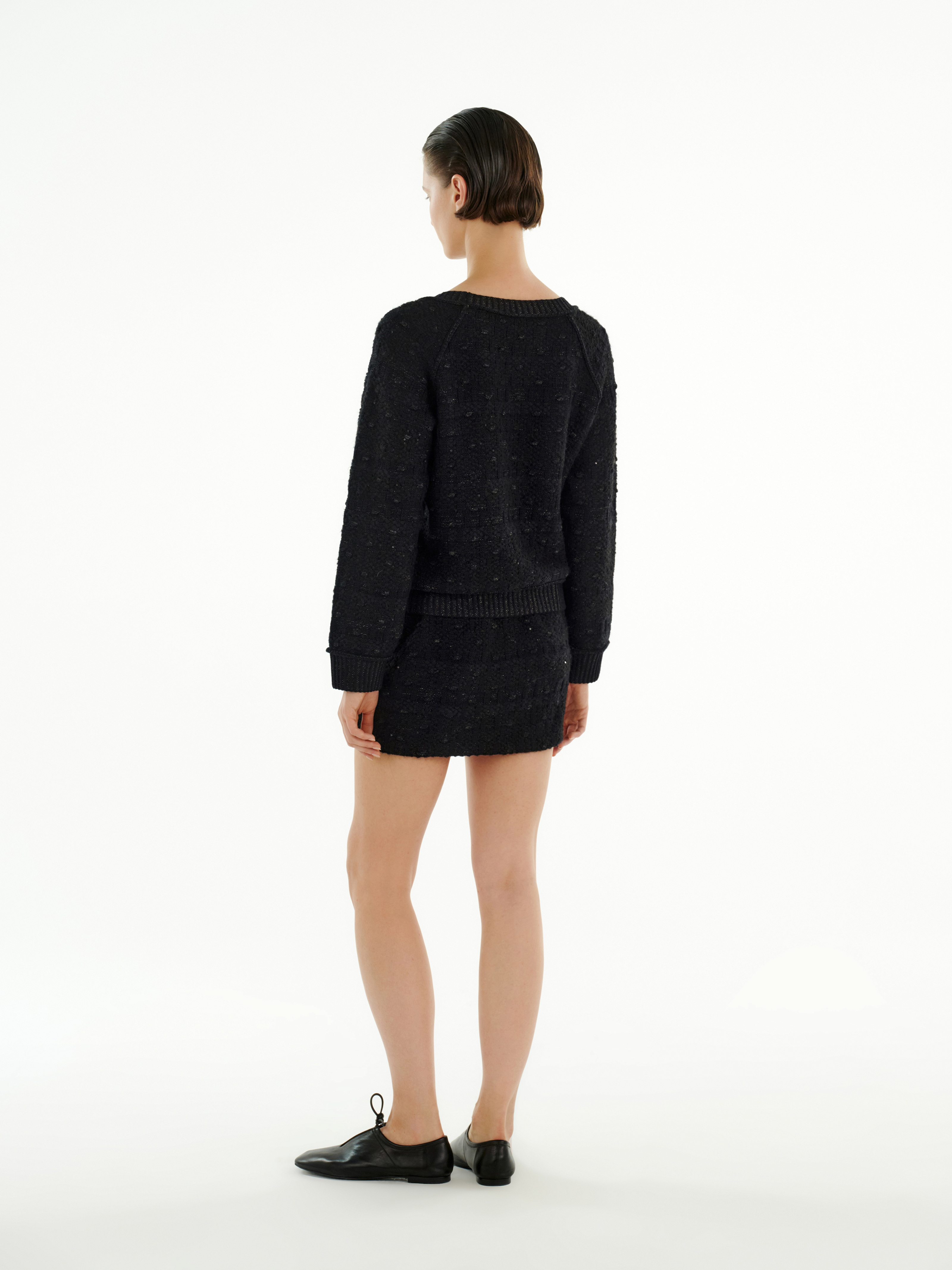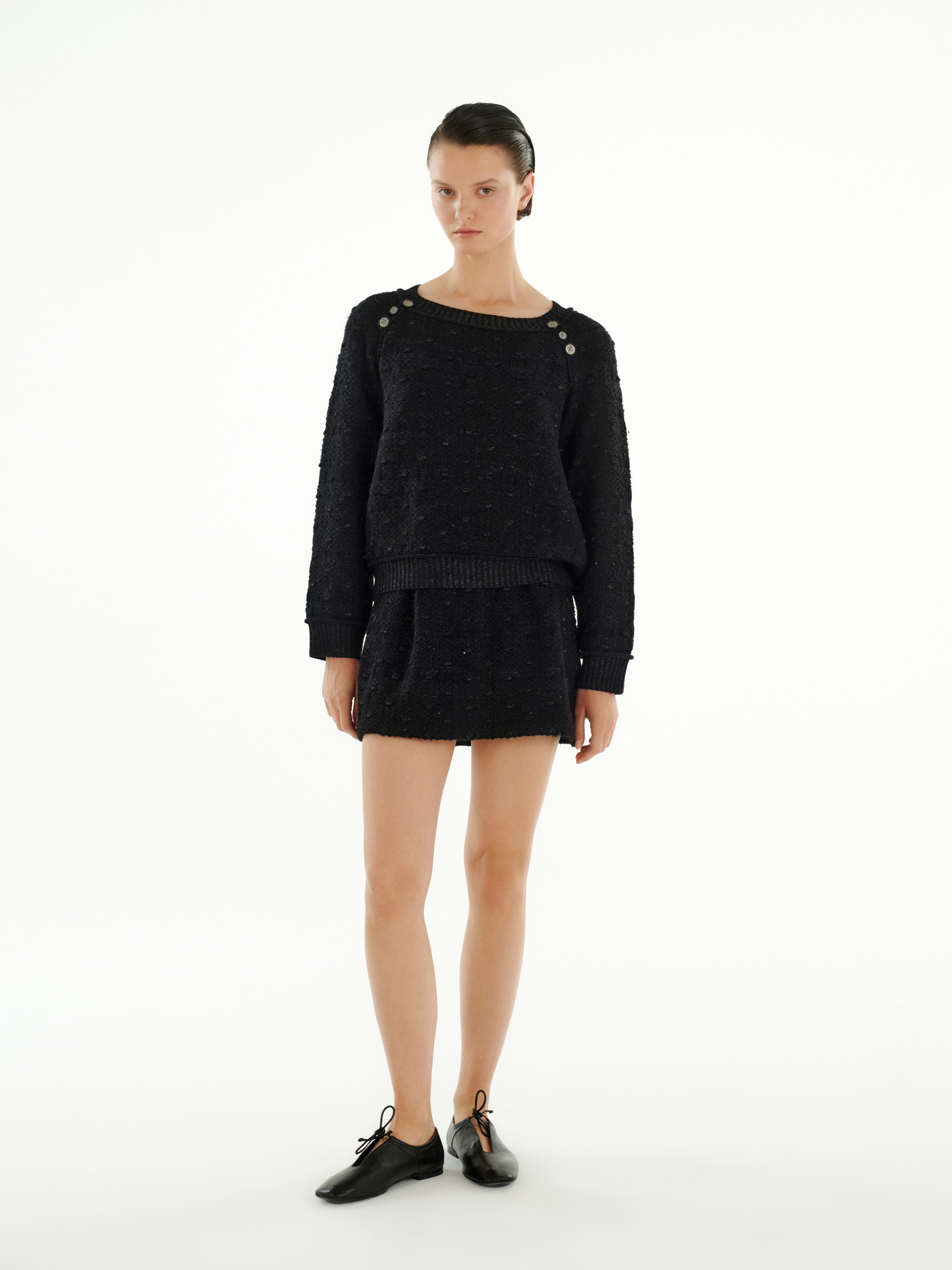 Черный джемпер из фактурного трикотажа выполнен в прямом силуэте и дополнен декоративными пуговицами по линии выреза. Лаконичная форма сочетается с выразительной поверхностью ткани, в которой мягкий мохер и шерсть мериноса создают объем и уют.