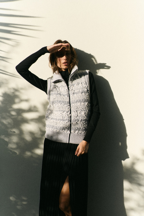 В основе изделий — меринос, кашемир, суперкид-мохер, хлопок и вискоза с добавлением металлизированных нитей. Силуэты мягкие и пластичные: приталенные платья, юбки годе, свободные брюки и кардиганы.