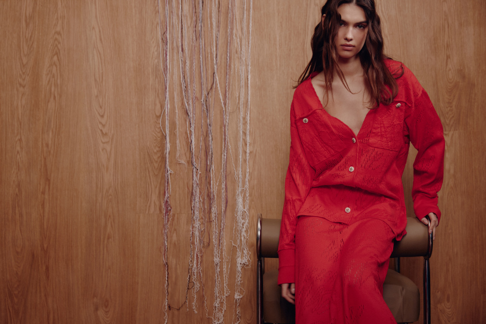 Главный источник вдохновения — пеплос, древнегреческий прообраз платья, известный своей текучестью и благородством линий. Когда-то он позволял ткани подчиняться телу, создавая естественные драпировки. Сегодня AND The Brand переосмысливает этот силуэт, соединяя архитектурную точность с мягкостью современных материалов и инновационным плетением нитей.