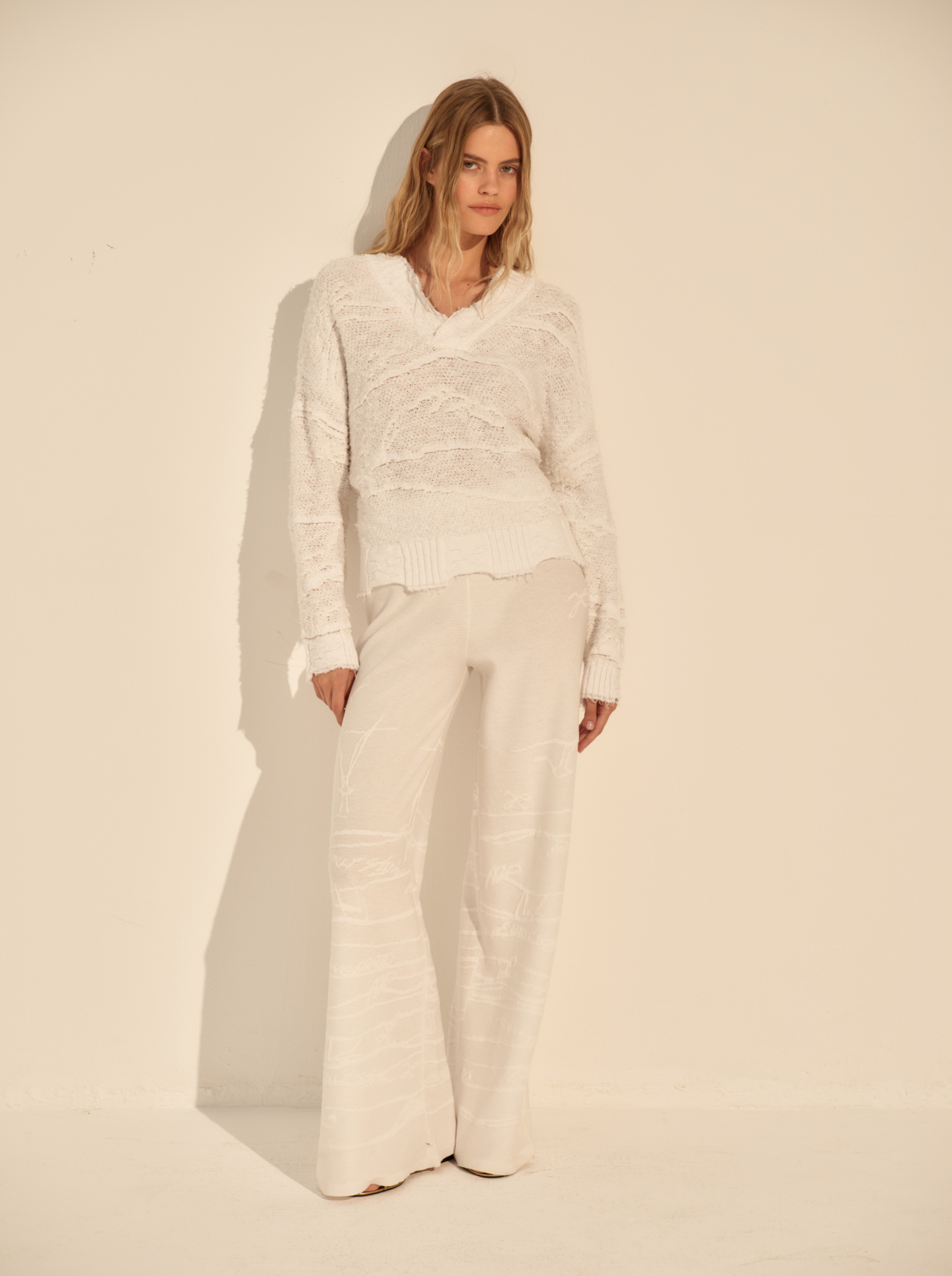 Применяются новые уникальные переплетения, которые мы разрабатываем специально для наших изделий. В хлопке и вискозе мягкость к телу сочетается с объёмным, слегка выразительным рельефом снаружи. Это сочетание различных приёмов, авторских техник, формирует особую архитектуру полотна, придавая ему выразительность и живость.