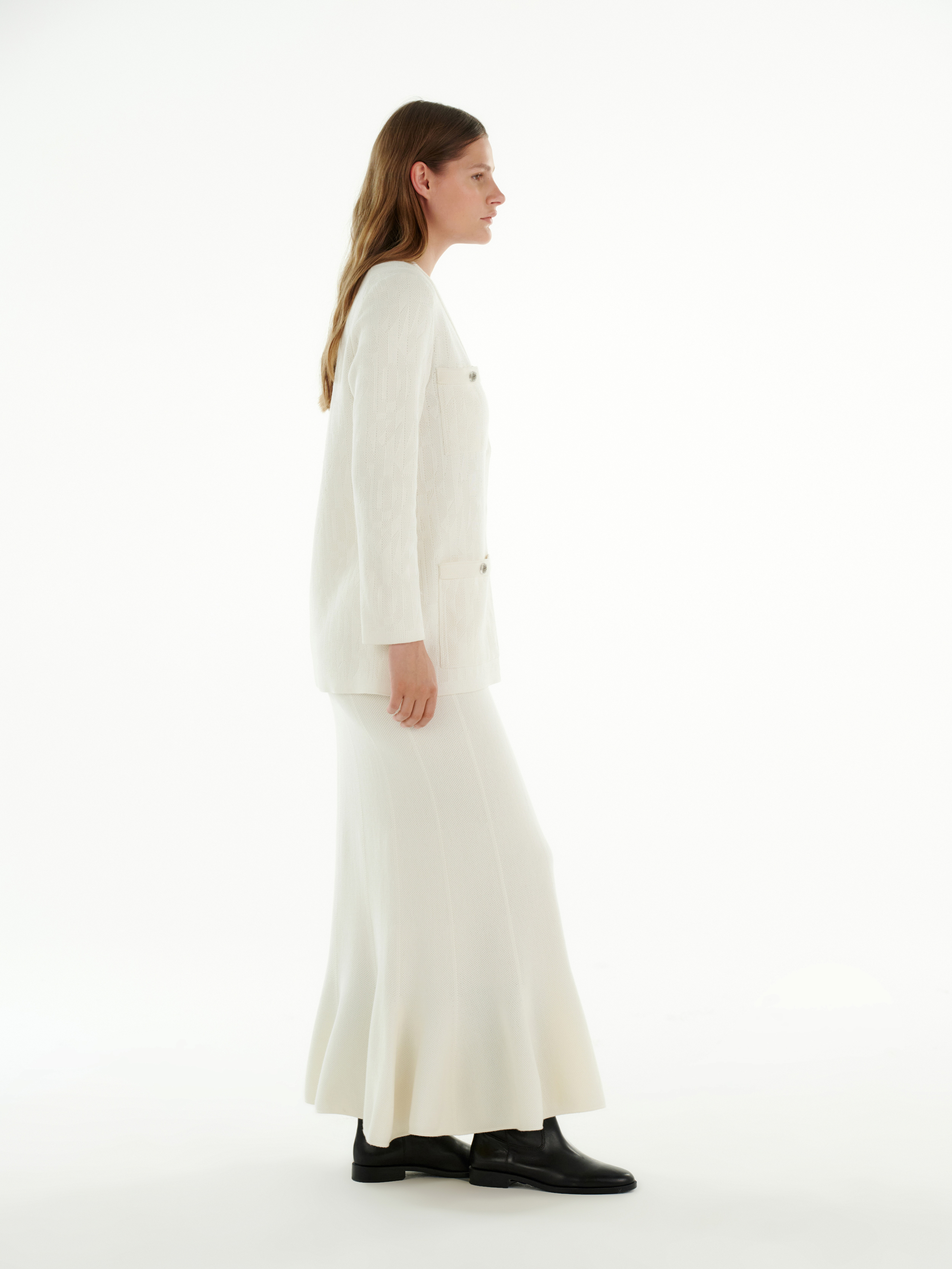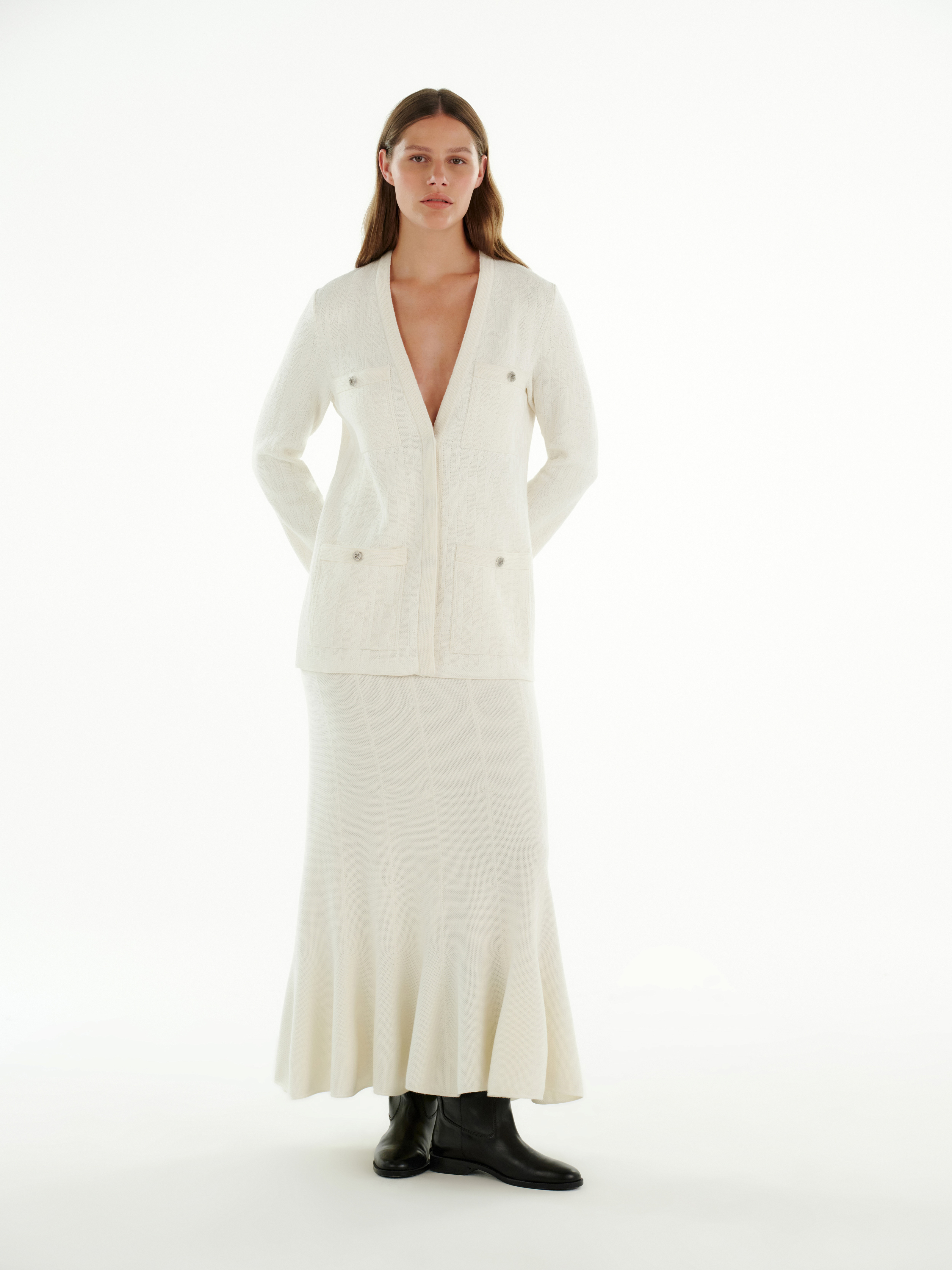 Карманы делают модель одновременно практичной и выразительной. В молочном цвете кардиган выглядит особенно элегантно, подчёркивая чистоту линий и открывая больше возможностей для сочетаний — от тонких контрастов до монохромных ансамблей.