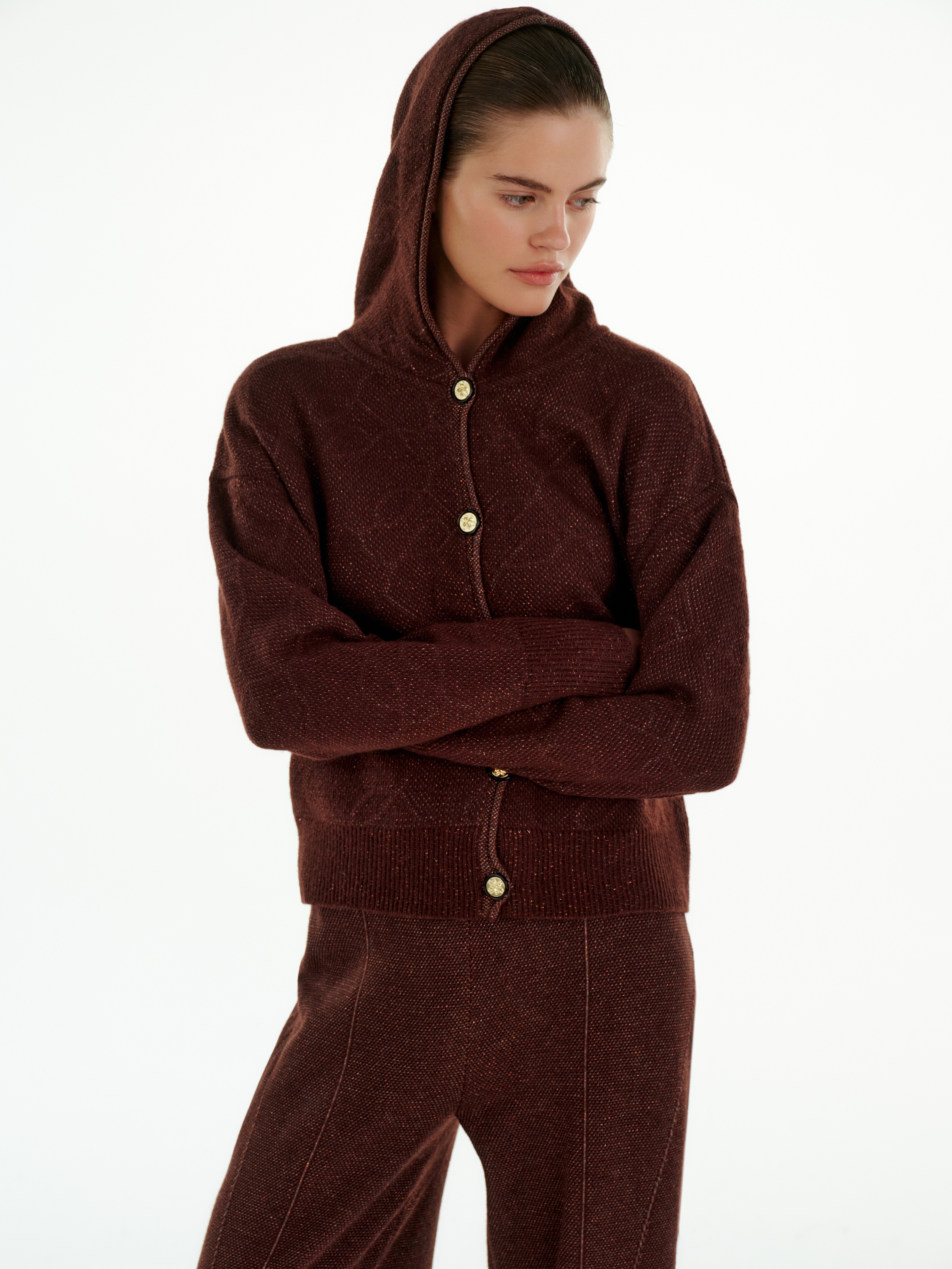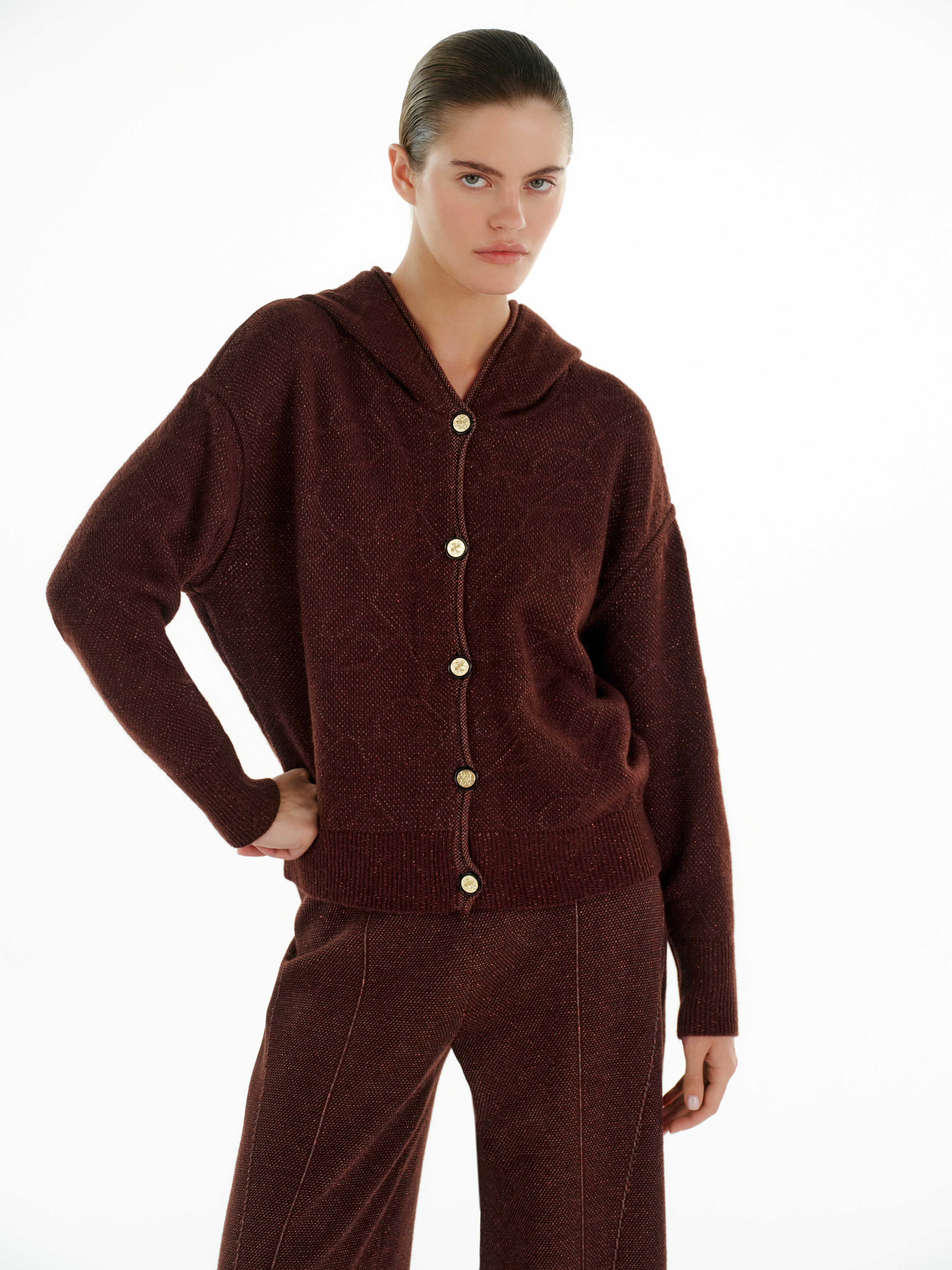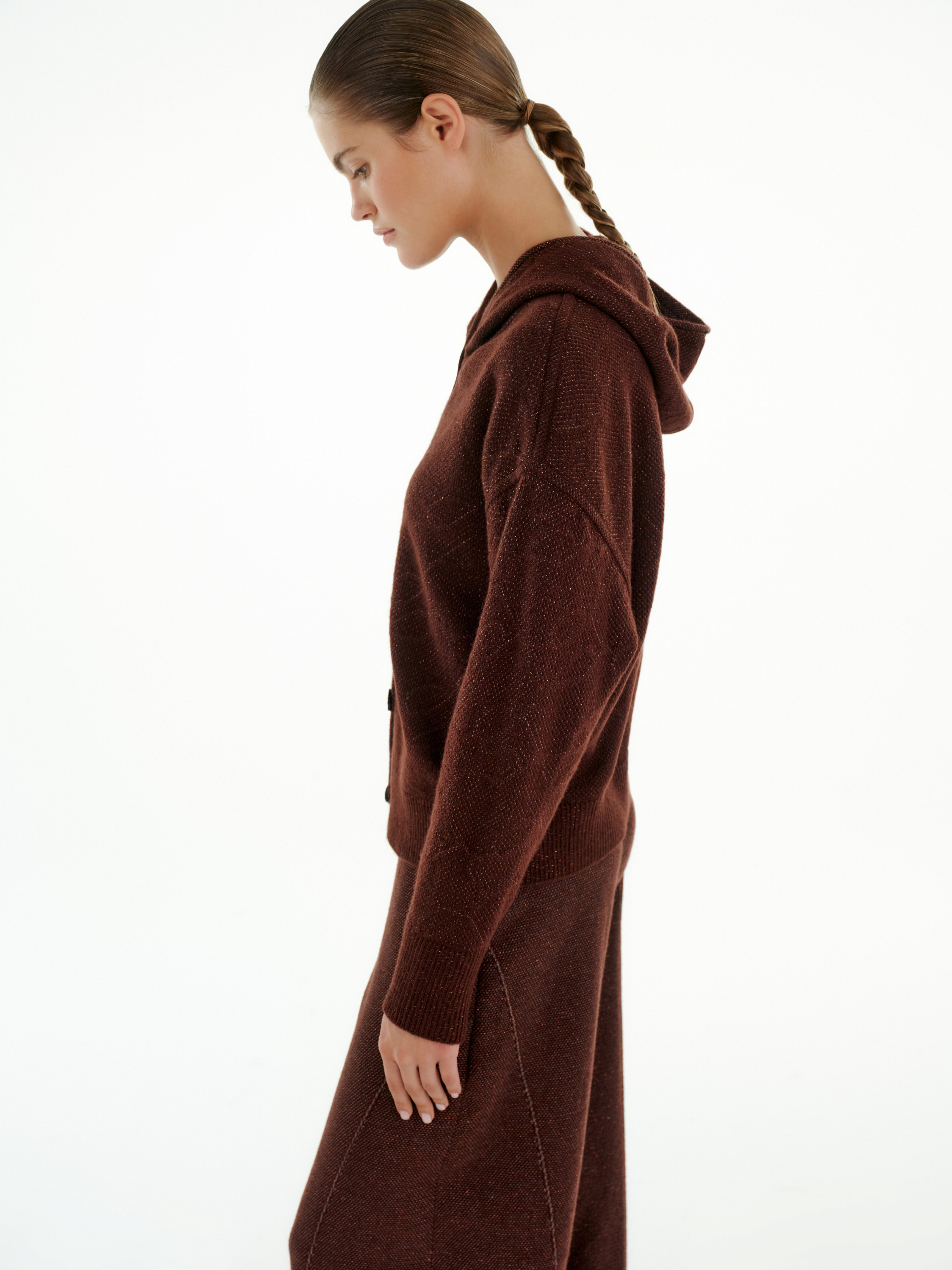Бомбер из мягкого кашемира с добавлением вискозы сочетает уют трикотажа и чёткость кроя. Теплая фактура подчёркивает глубину цвета, а лёгкий блеск пряжи добавляет деликатного объёма.