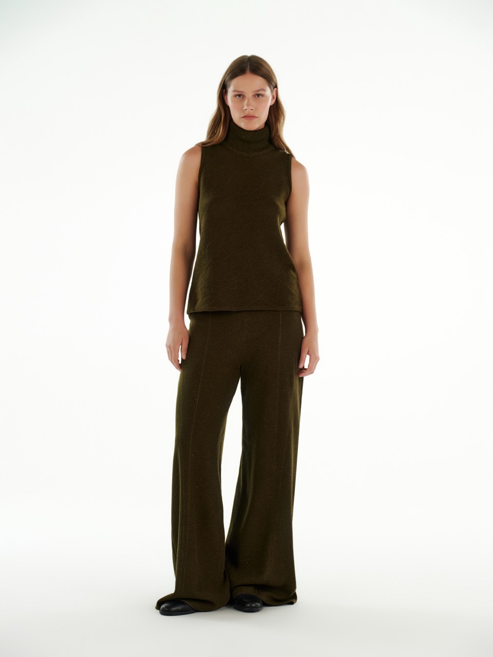 Топ из кашемира с высоким воротом — лаконичная интерпретация комфорта и строгости. Мягкий кашемир с добавлением вискозы создаёт плотную, но пластичную текстуру, которая красиво держит форму.