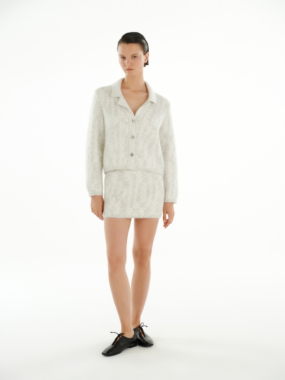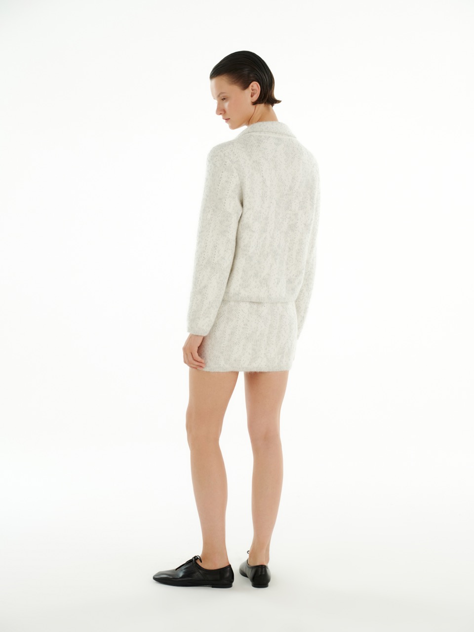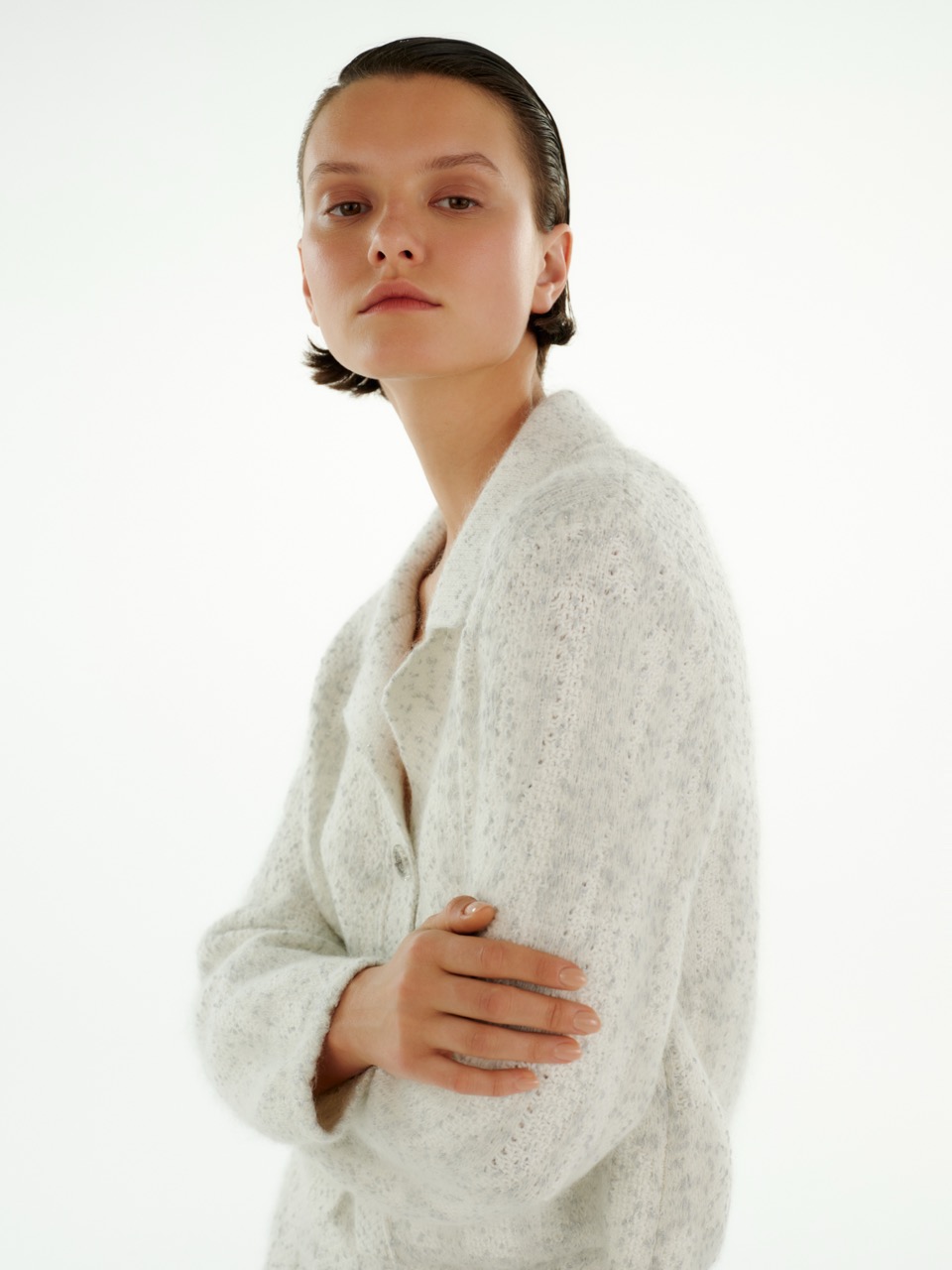 Жакет из воздушного superkid мохера с шерстью мериноса и хлопком отличается мягкой объемной фактурой и легким сиянием металлизированных нитей. Полотно пластичное и теплое, создаёт ощущение лёгкости при носке.