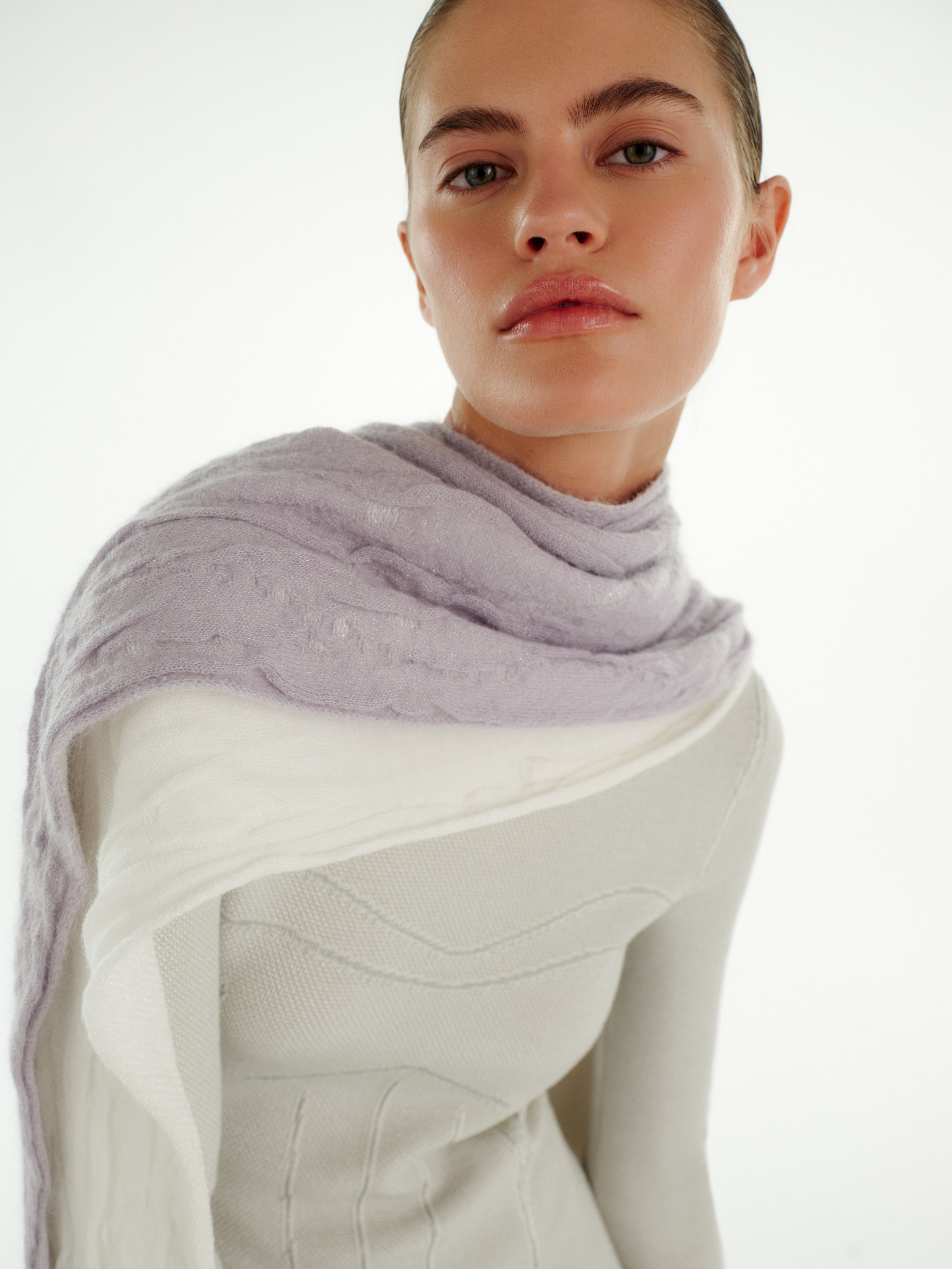 Объёмный шарф из мягкого трикотажа с содержанием superkid мохера и мериносовой шерсти. Лёгкая текстура подчёркивается добавлением вискозы и тонких металлизированных нитей, которые создают едва заметное свечение.