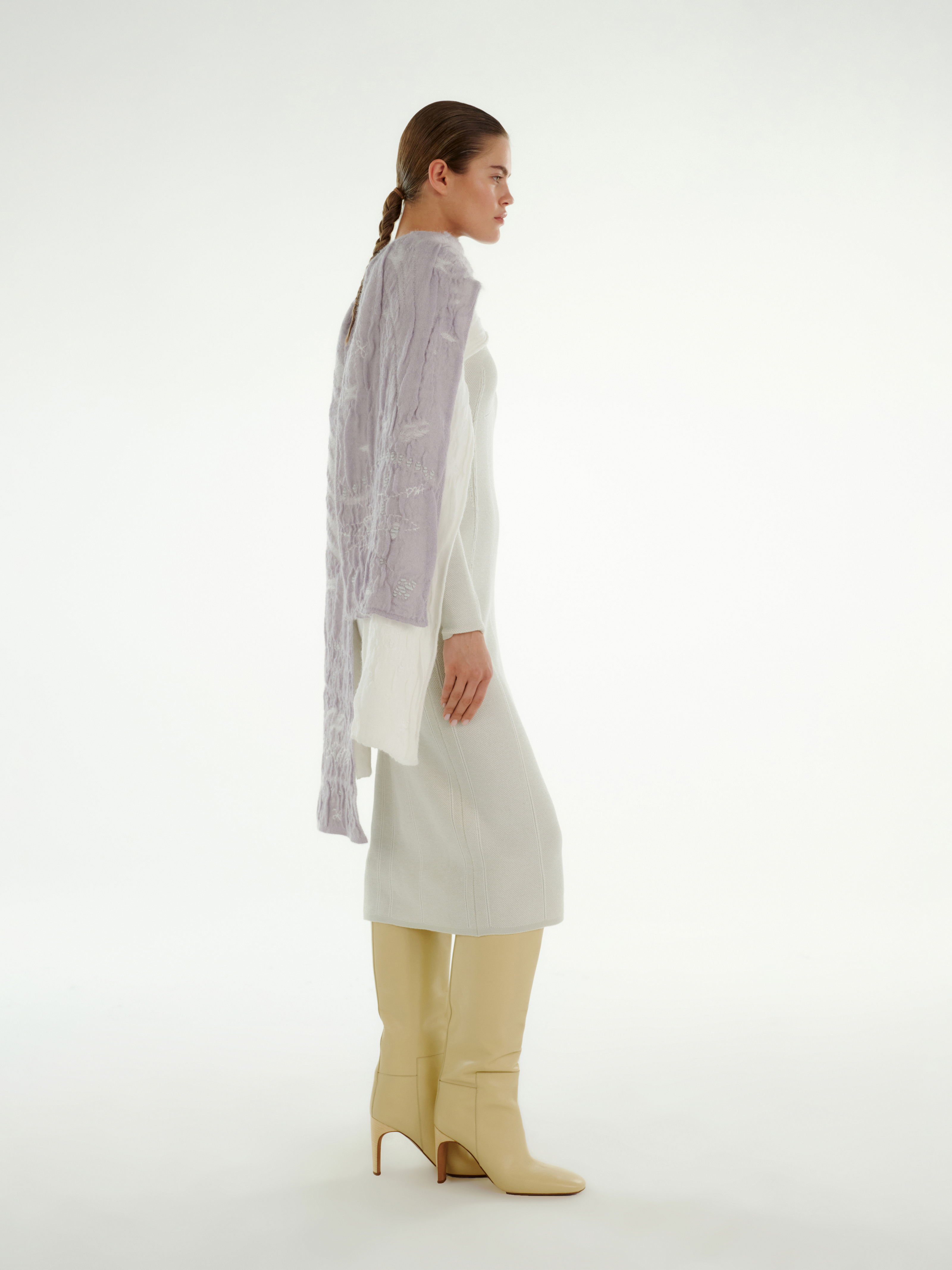Фактурная вязка делает аксессуар выразительным. Белый цвет добавляет чистоты и свежести. Шарф легко вписывается как в светлые монохромные ансамбли, так и в более насыщенные сочетания, оставаясь универсальной деталью для разных настроений.