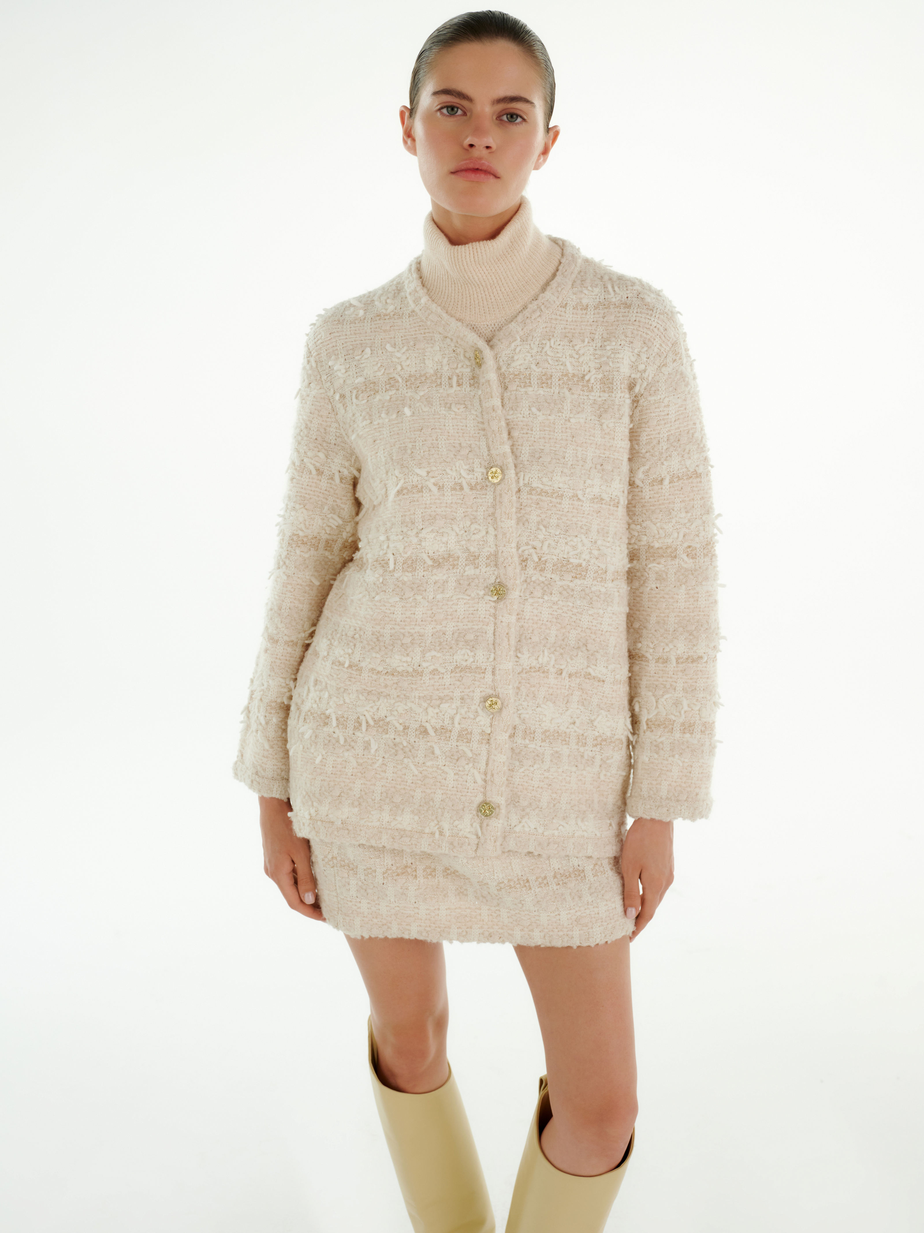 Юбка мини в бежевом цвете выполнена из фактурного трикотажа с мягким ворсом. Эластичный пояс обеспечивает комфортную посадку, а прямой силуэт делает модель универсальной и легко сочетаемой.