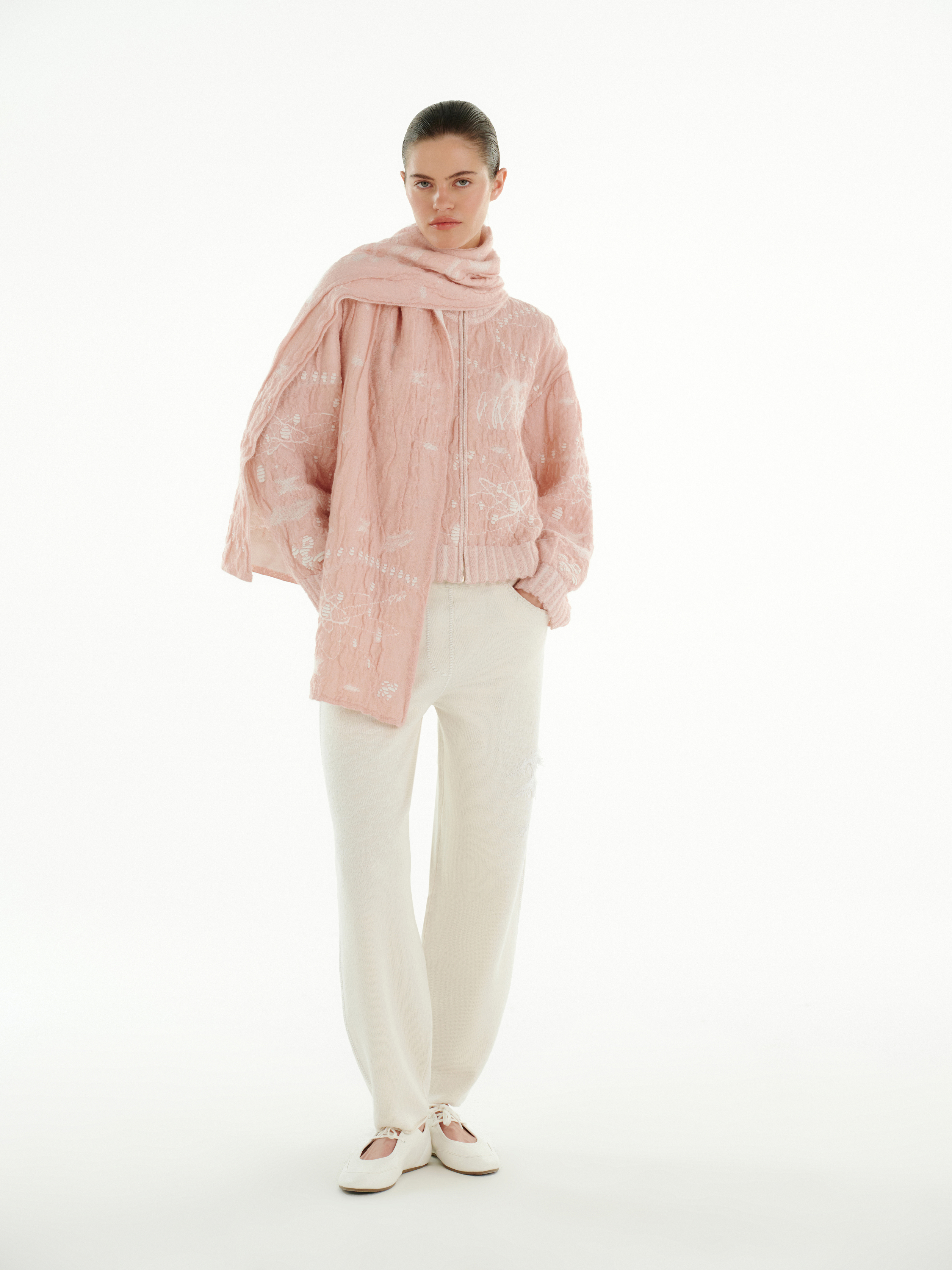 Объёмный бомбер из фактурного трикотажа в нежно розовом цвете. Мягкая смесь superkid мохера и мериноса делает полотно воздушным, при этом держит форму и тепло. Лёгкий блеск добавляет глубину и движение поверхности.