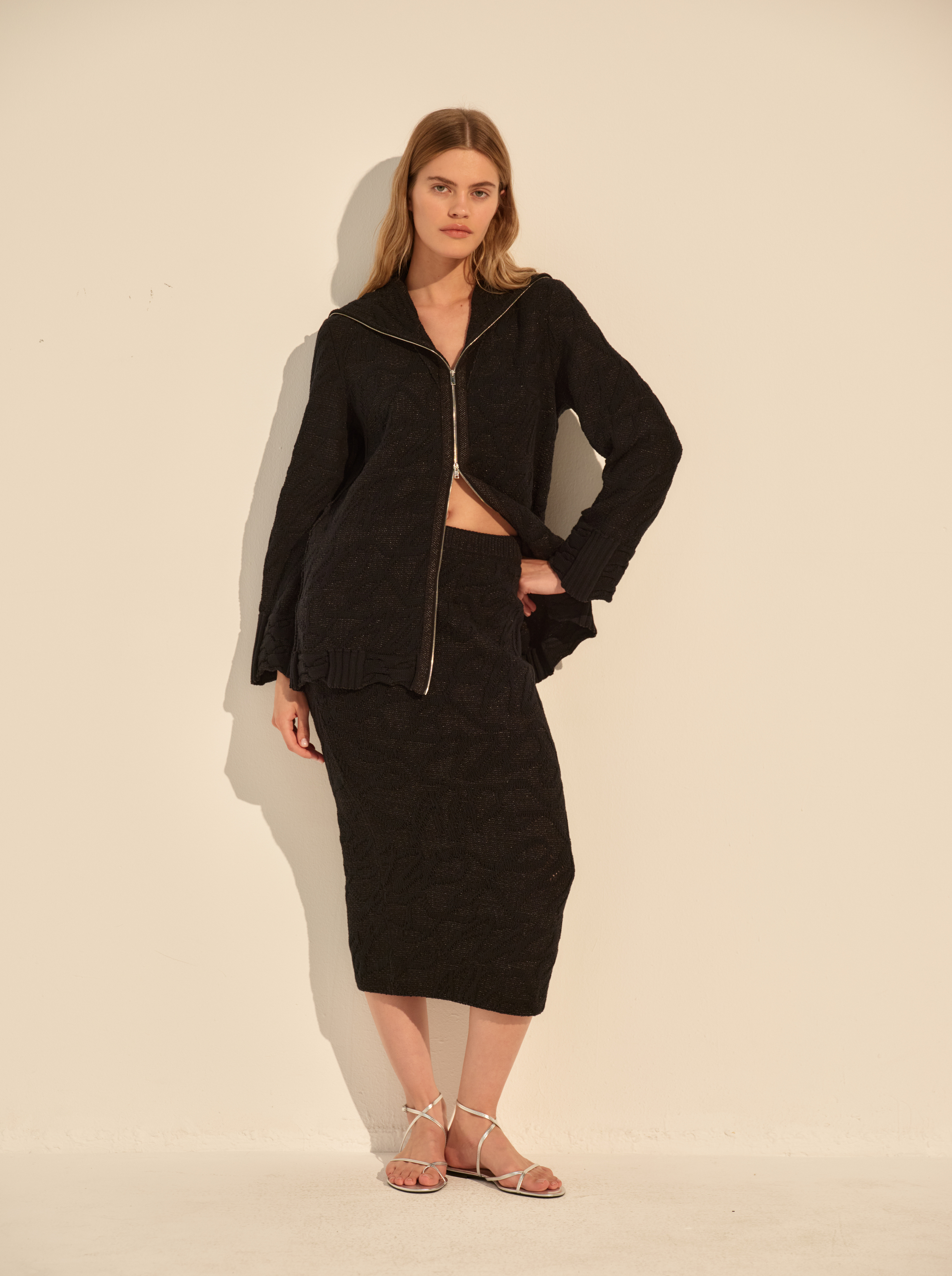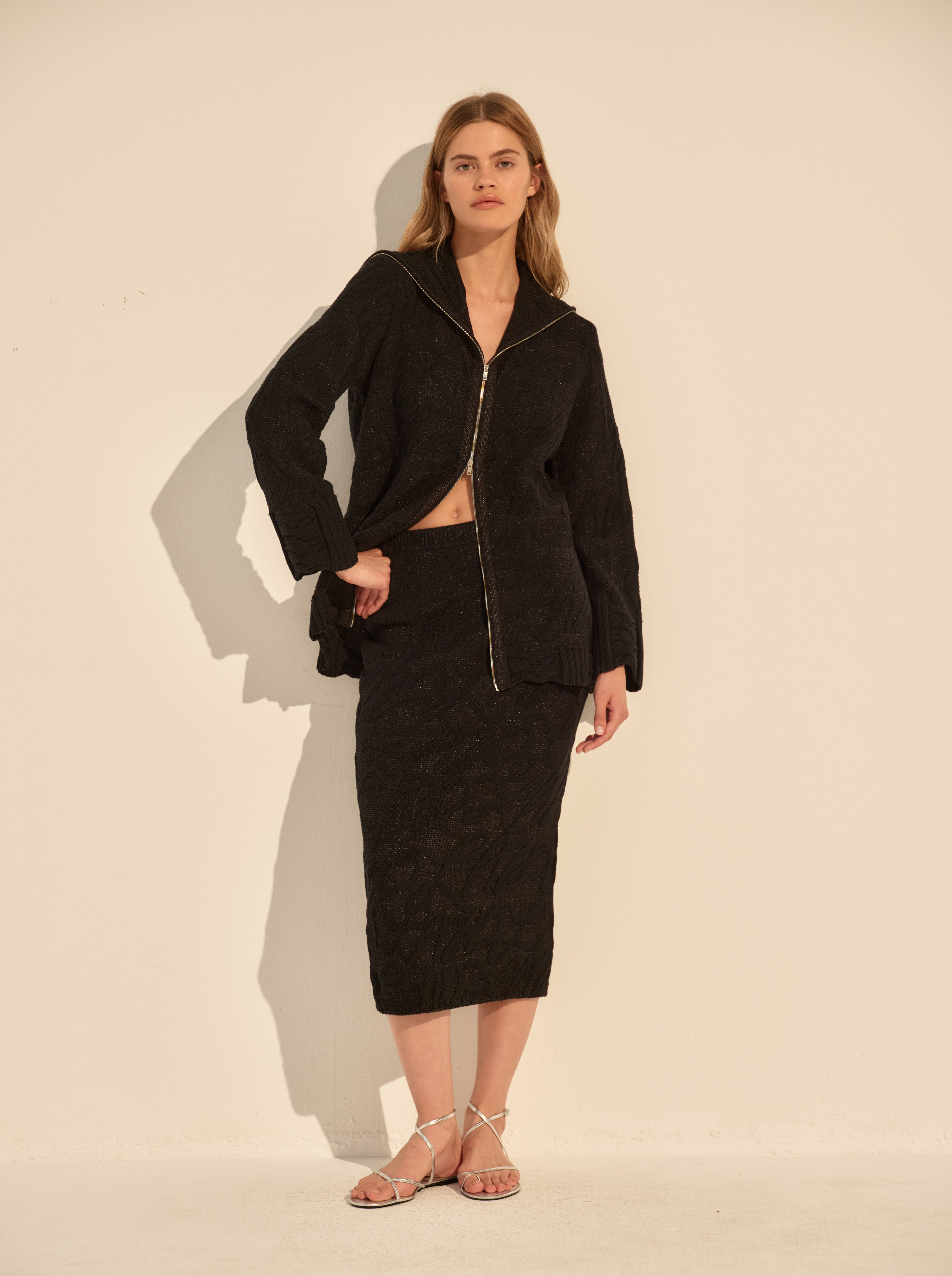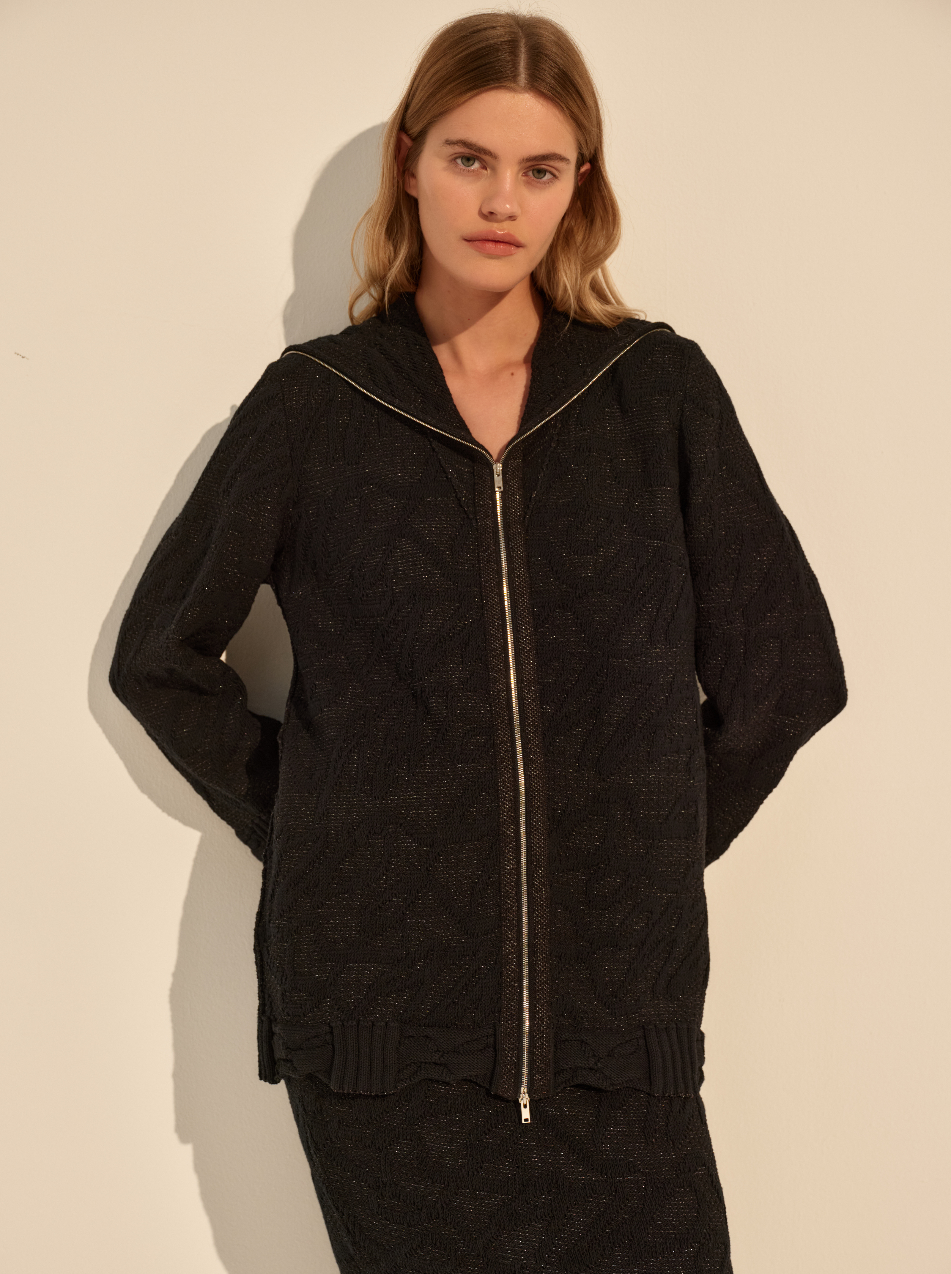 Фактура ненавязчива и раскрывается в движении, добавляя глубину чёрному цвету. Застёжка на молнию выстраивает чёткую вертикаль, а оформленный воротник смещает модель в сторону расслабленной, современной классики.