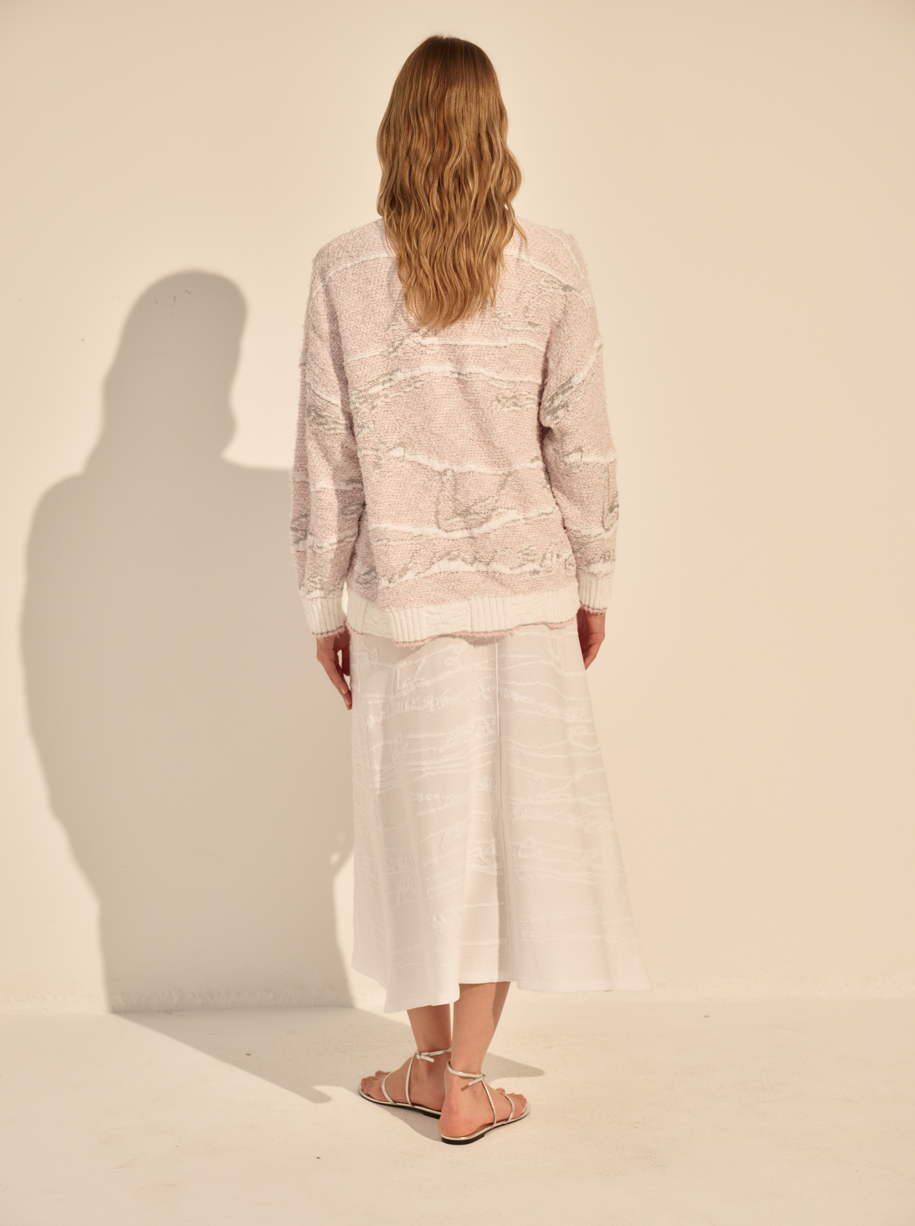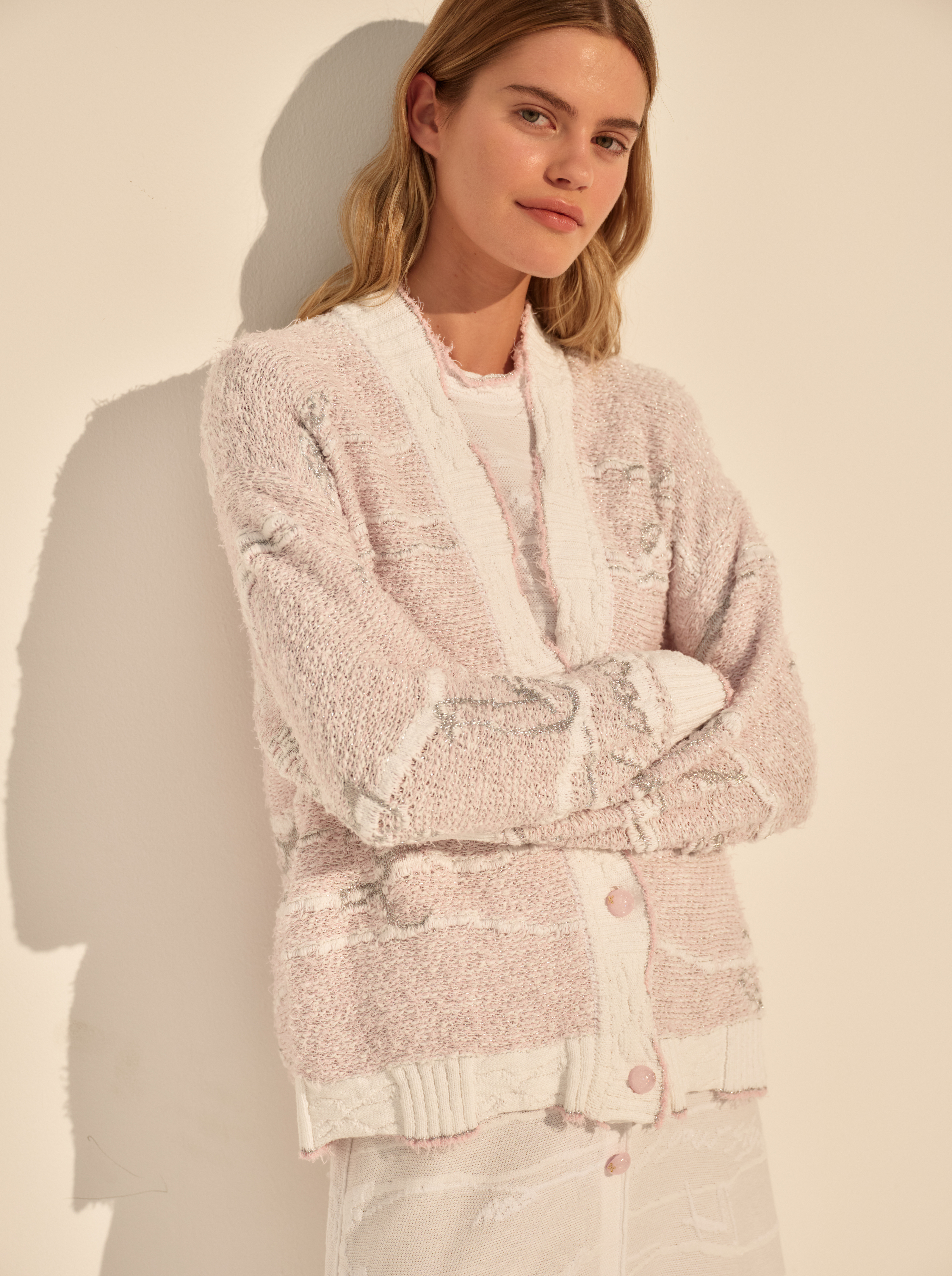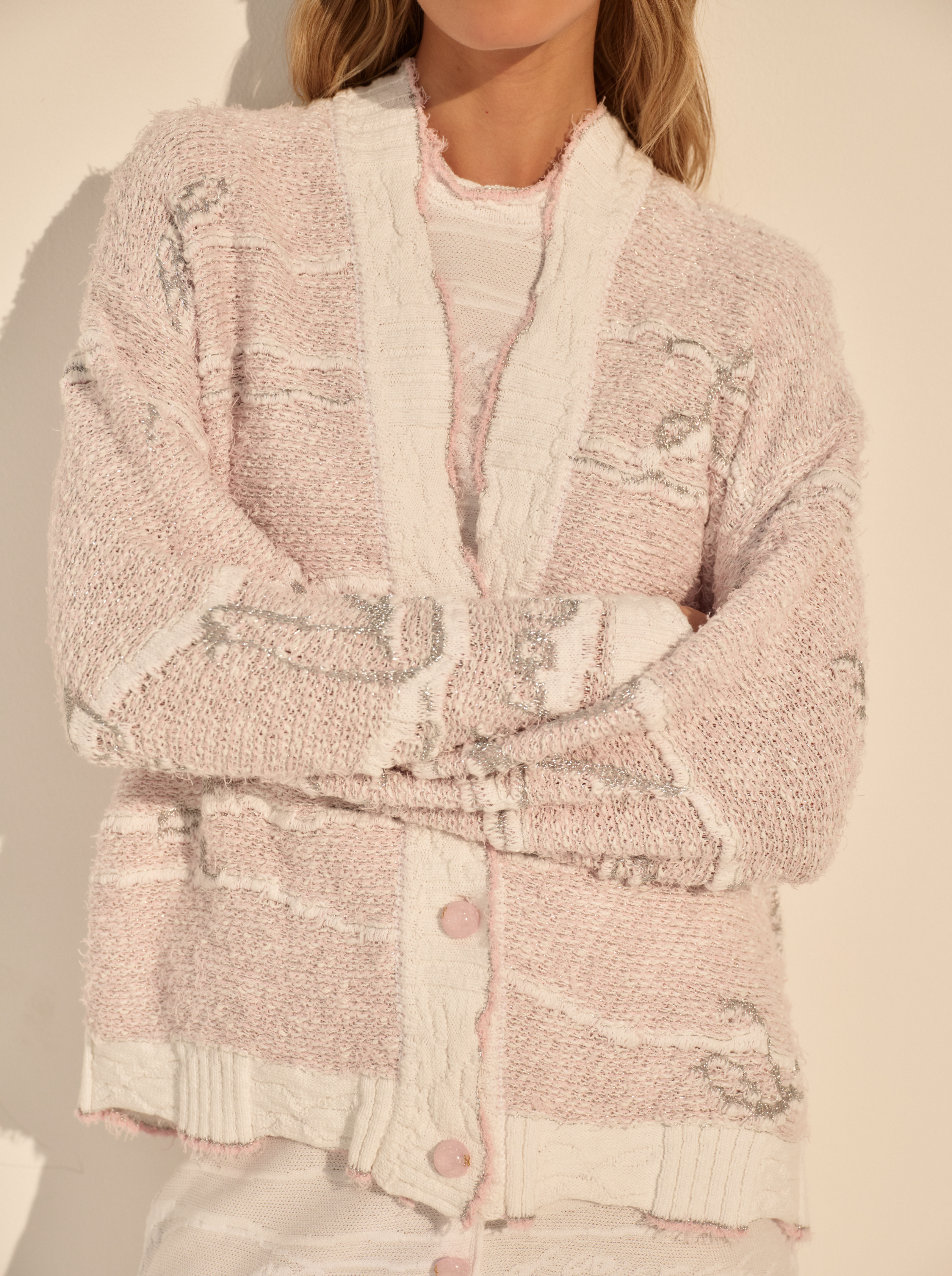 Вязка с мягкими переходами оттенков и деликатным блеском создаёт живую, слегка винтажную фактуру. Контрастная планка и манжеты собирают форму, а застёжка на пуговицы добавляет ритм и завершённость.