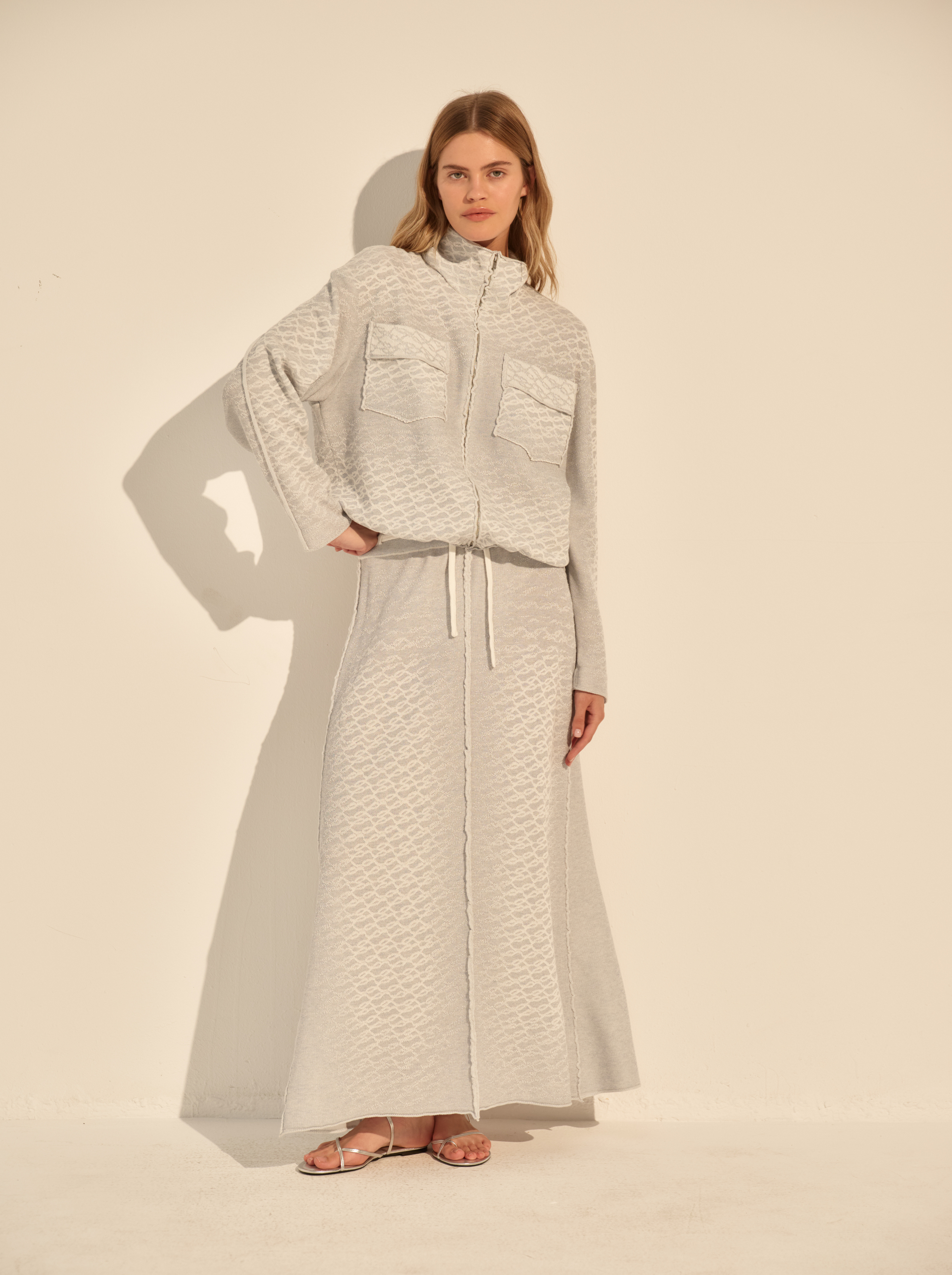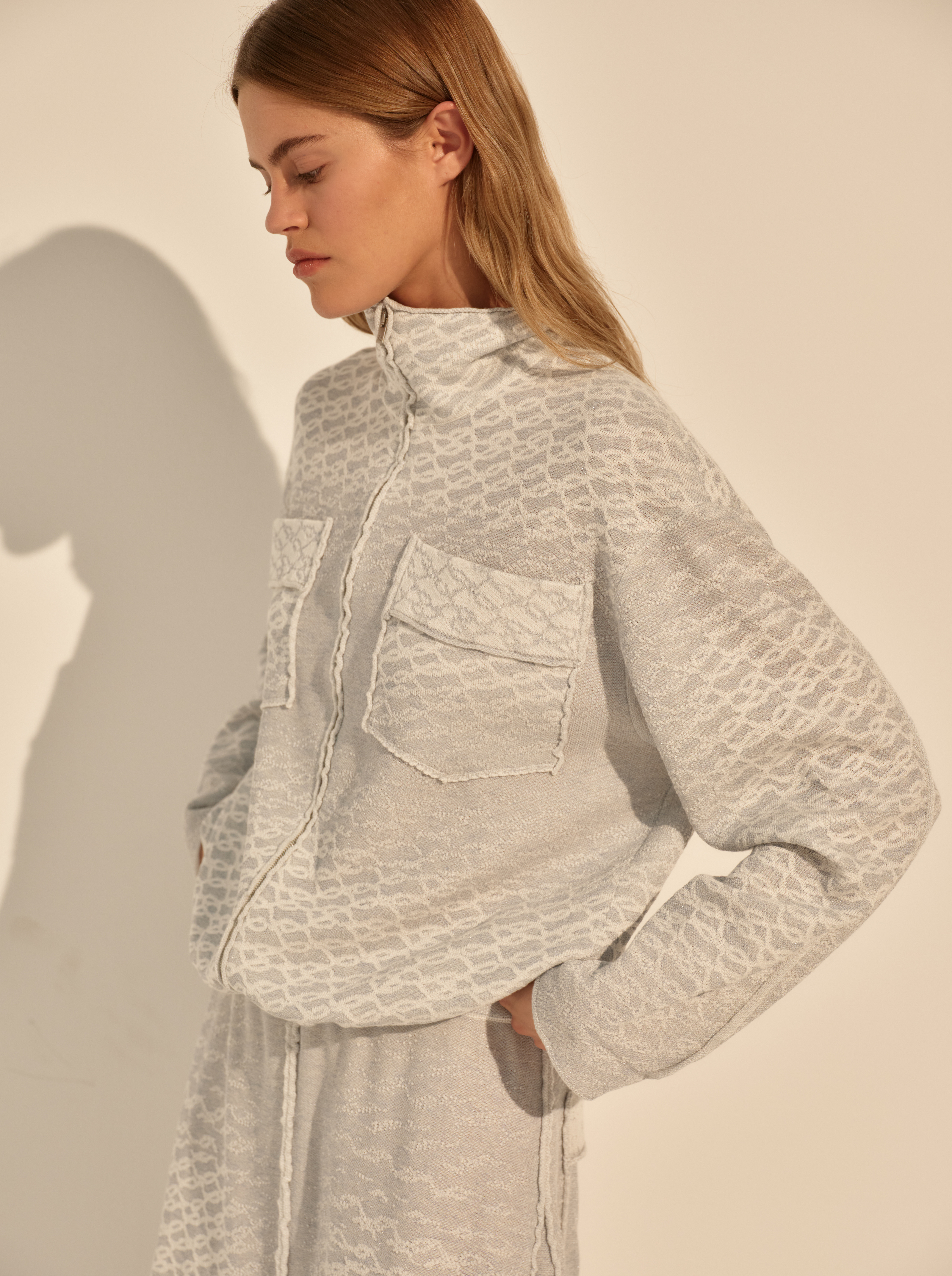 Фактурный трикотаж с деликатным узором делает поверхность живой и добавляет визуальную глубину. Застёжка на молнию и аккуратный отложной воротник создают собранный, функциональный акцент, уравновешивая мягкость ткани.