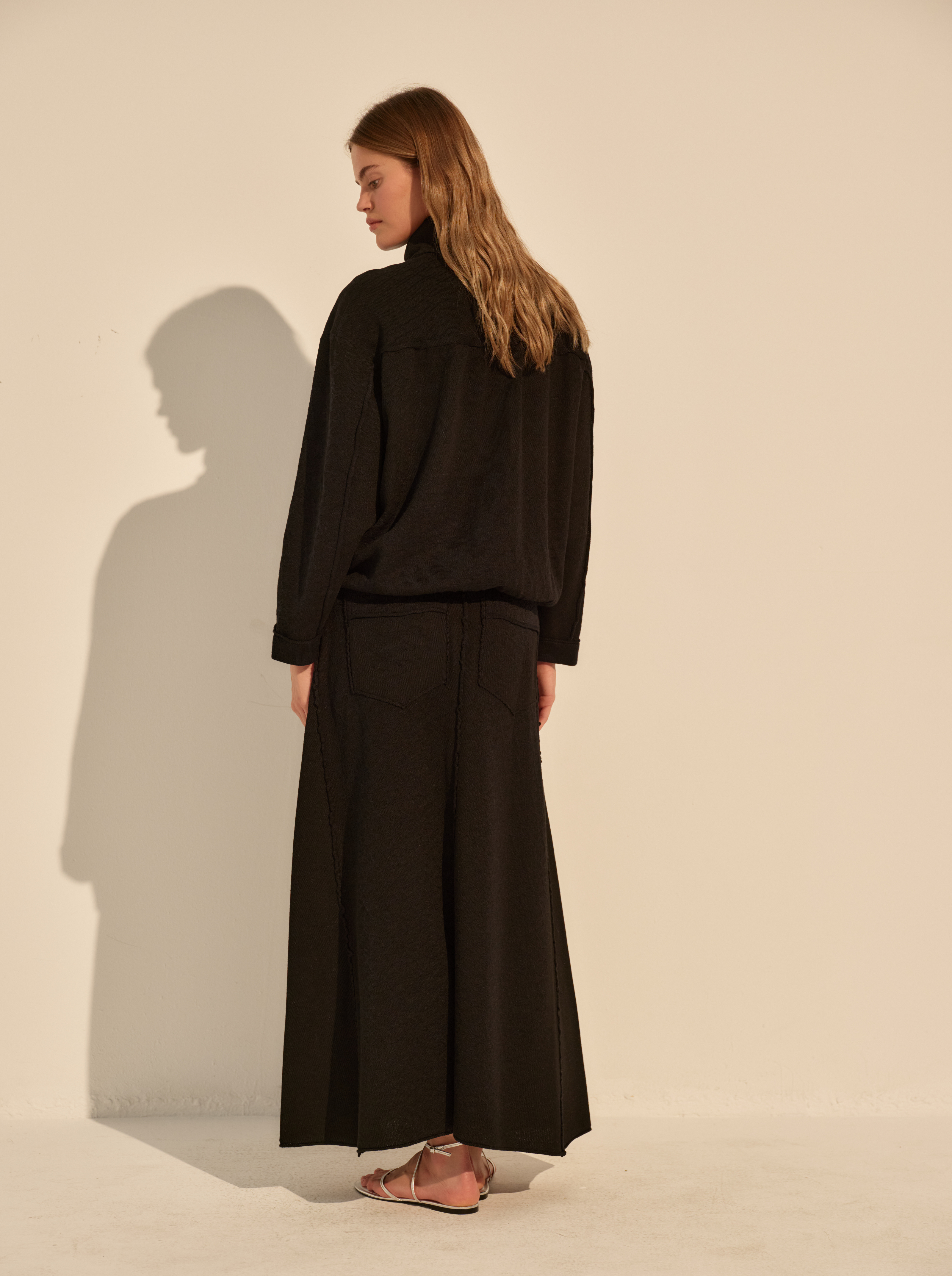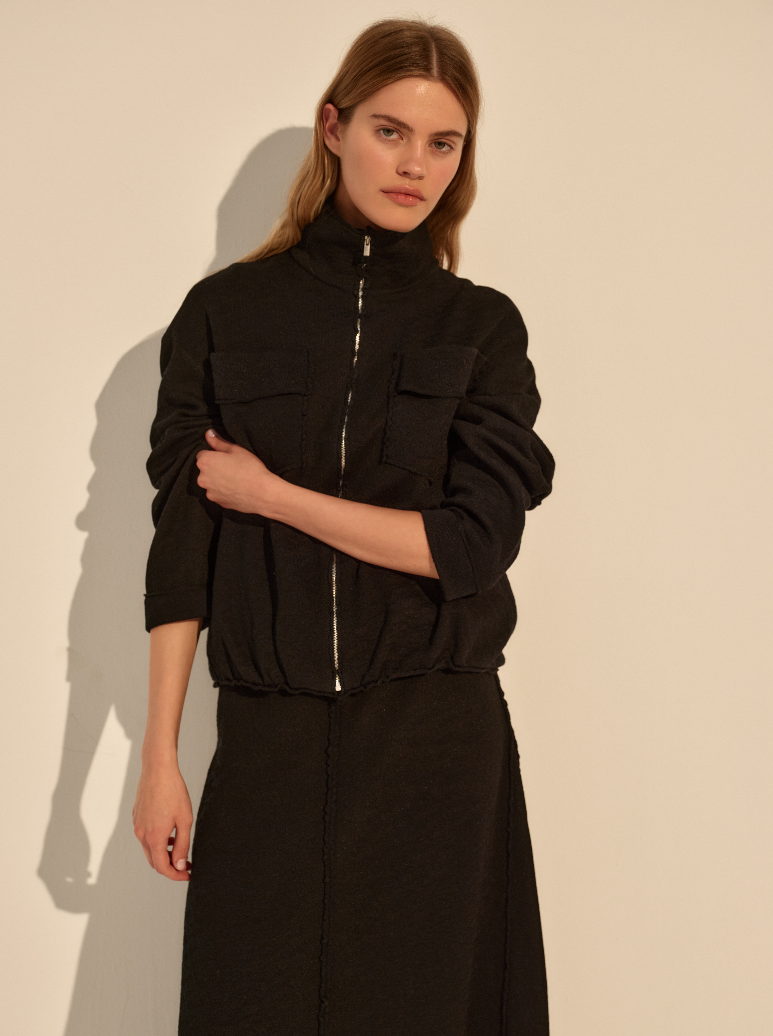 Фактурный трикотаж с деликатным узором делает поверхность живой и добавляет визуальную глубину. Застёжка на молнию и аккуратный отложной воротник создают собранный, функциональный акцент, уравновешивая мягкость ткани.