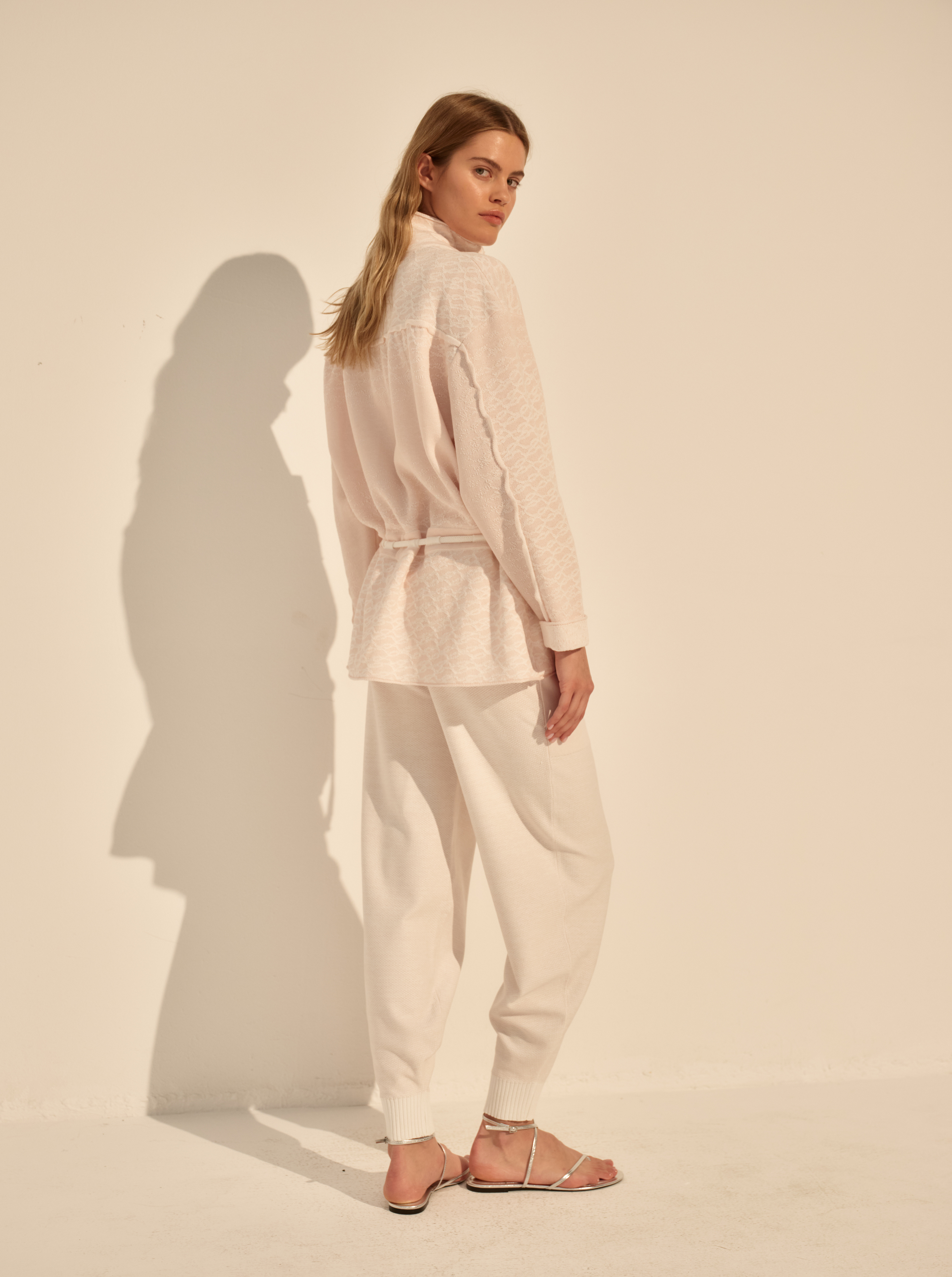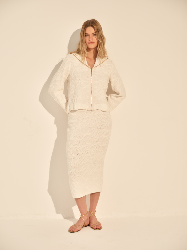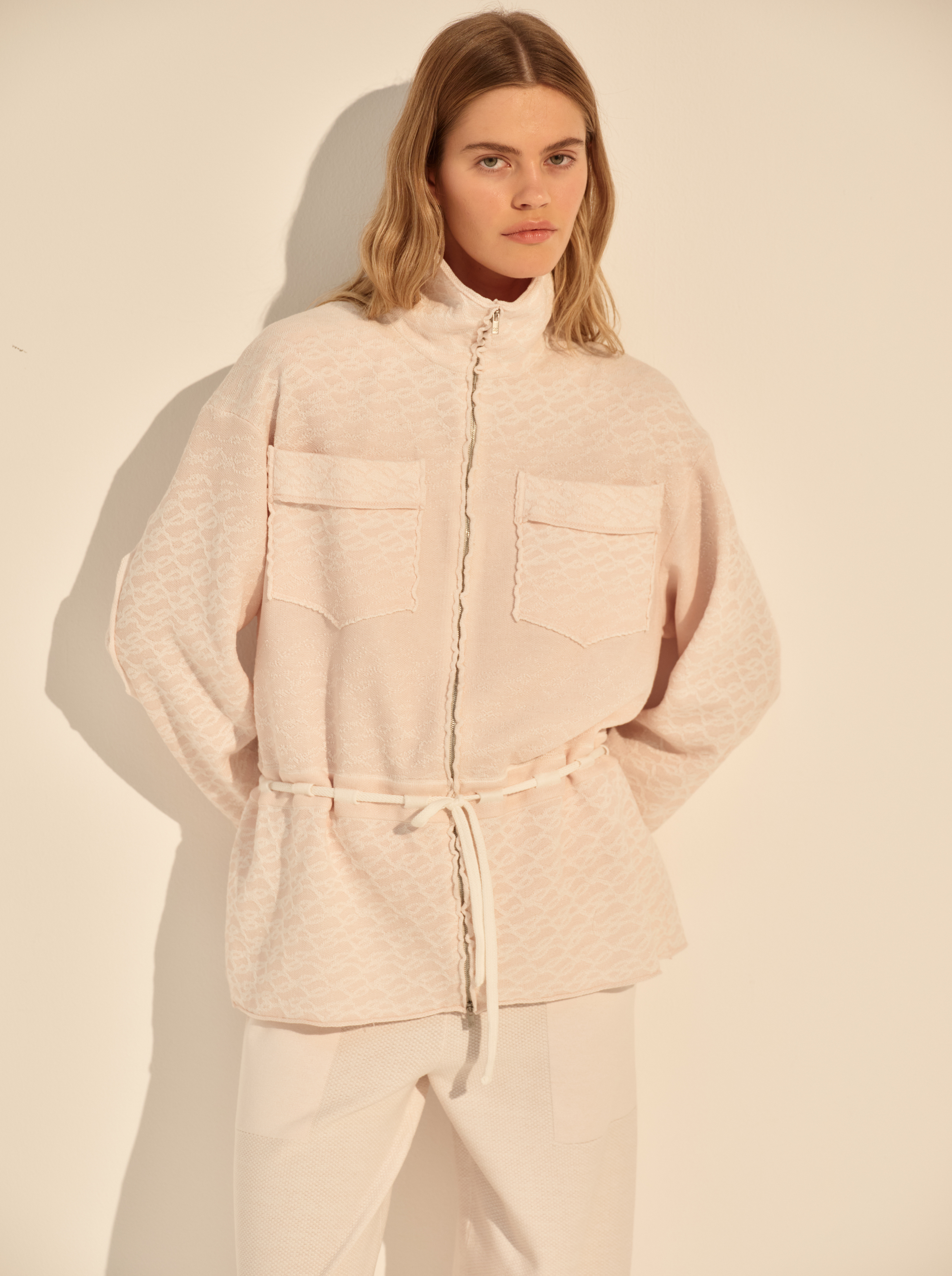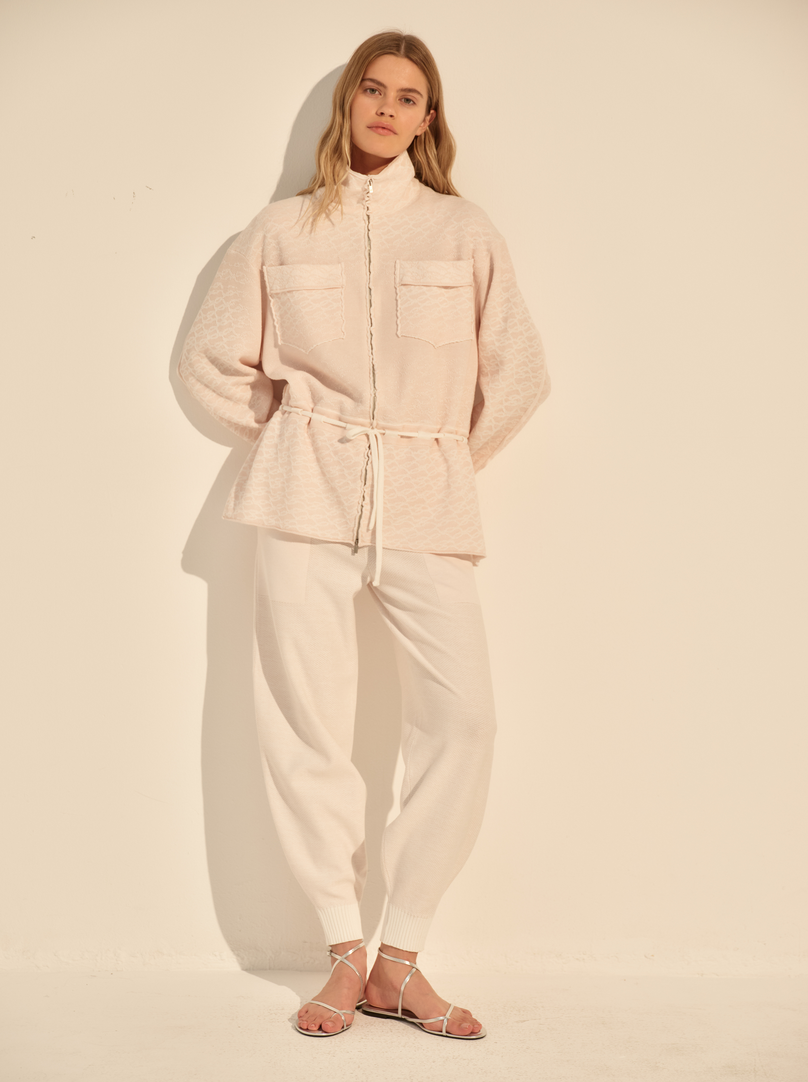 Фактурная вязка с деликатным узором добавляет глубину и делает поверхность визуально интересной, оставаясь спокойной. Застёжка на молнию и высокий воротник формируют чёткую вертикаль и добавляют модели функциональности.