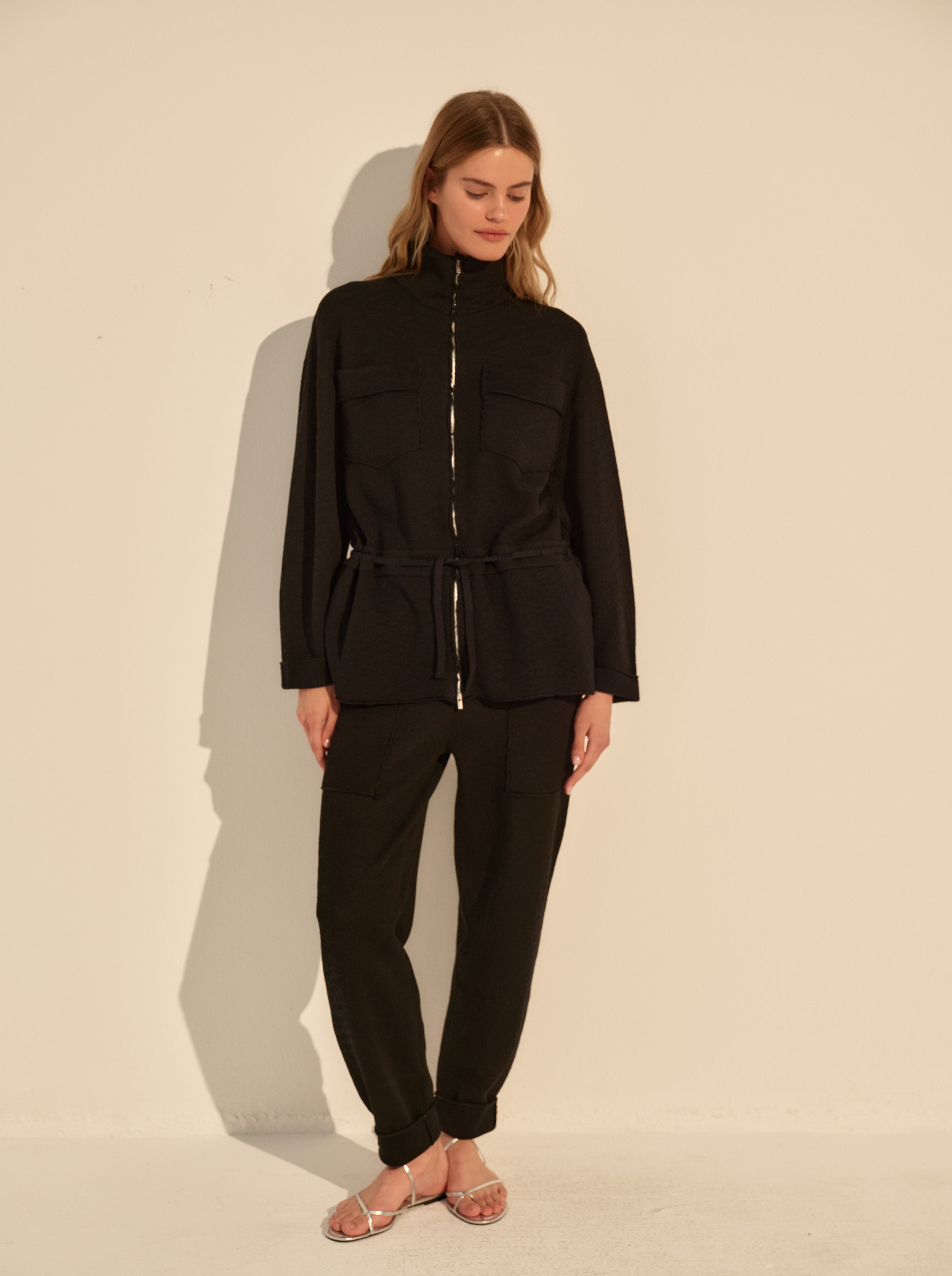 Фактурная вязка с деликатным узором добавляет глубину и делает поверхность визуально интересной, оставаясь спокойной. Застёжка на молнию и высокий воротник формируют чёткую вертикаль и добавляют модели функциональности.