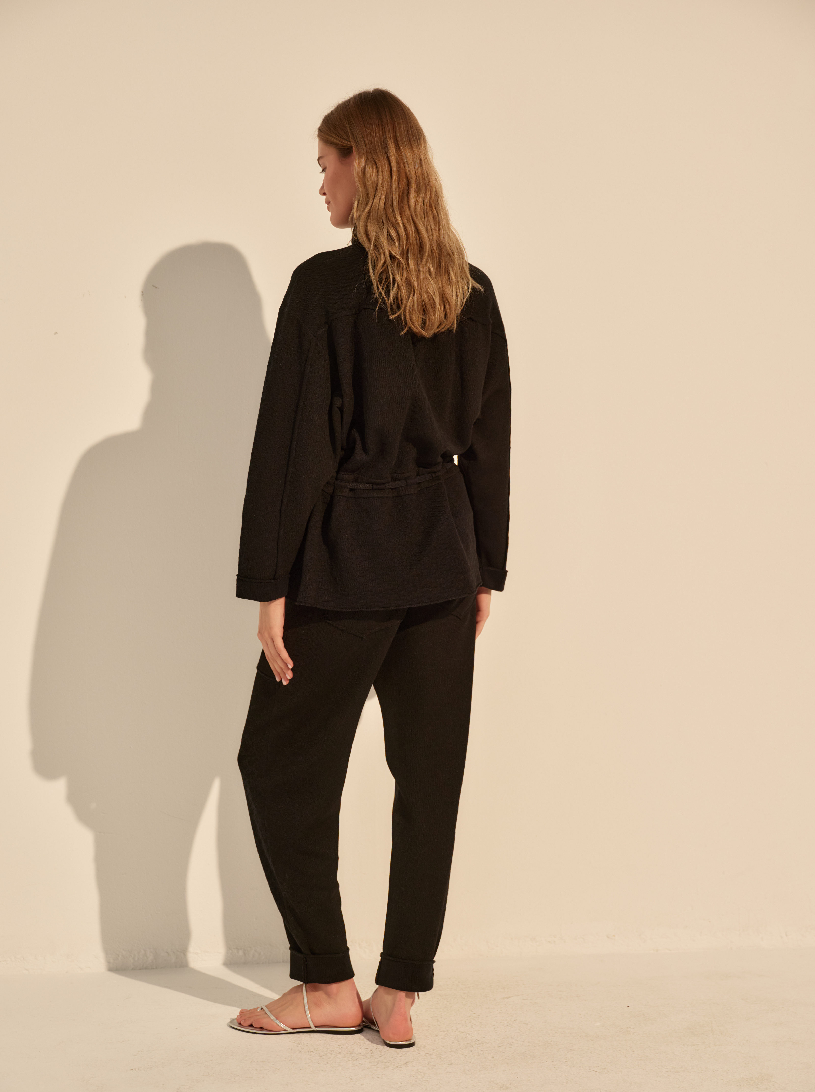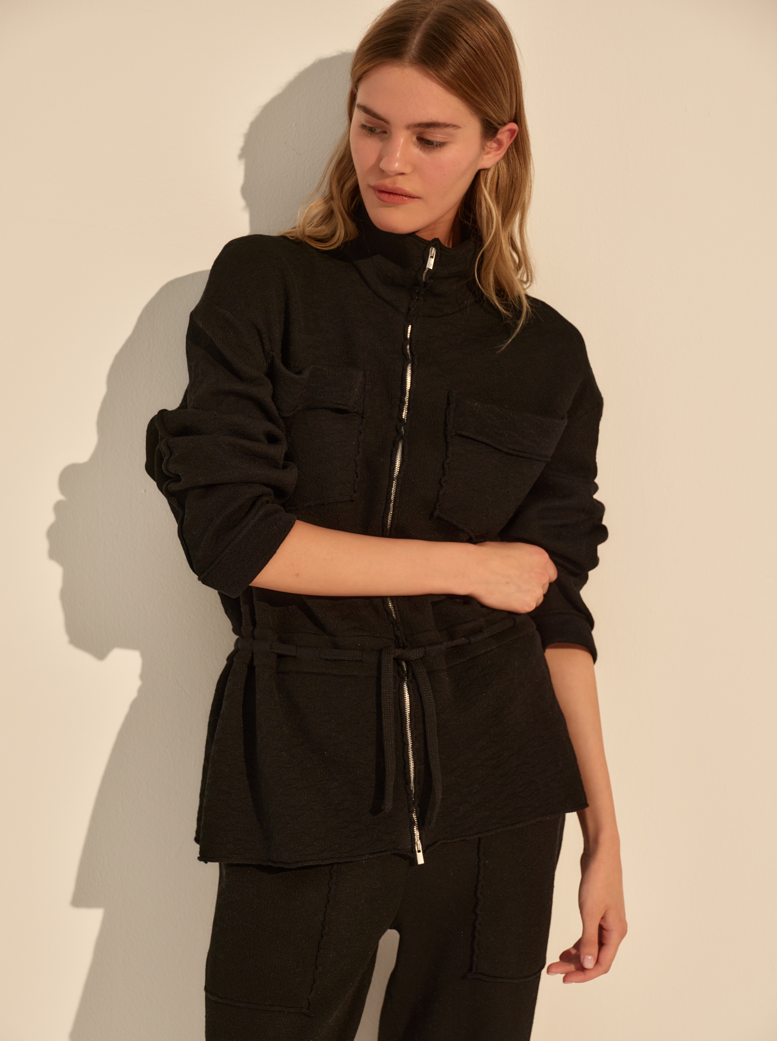 Бомбер выполнен из смыслового хлопка — материал мягкий, пластичный и комфортный для повседневной носки. Свободный силуэт выстраивает расслабленную форму, а кулиска на поясе позволяет регулировать посадку и менять объём по настроению.