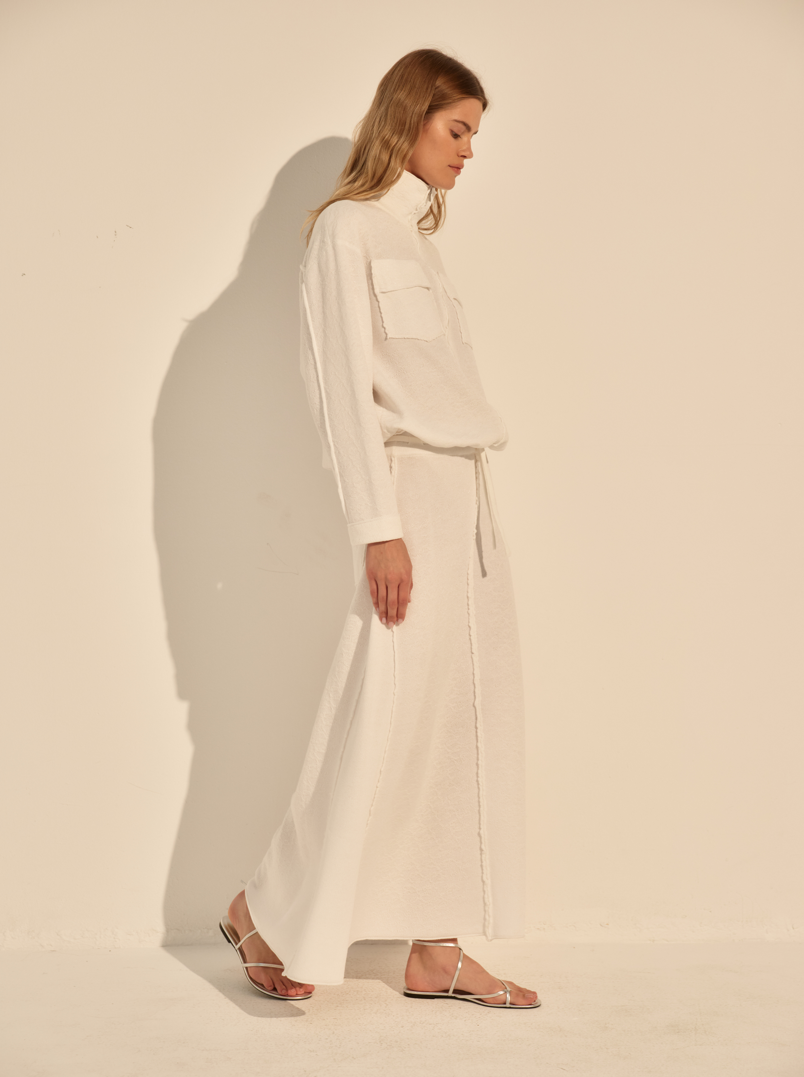 Длина макси и слегка расширенный силуэт создают спокойную, вытянутую линию. Вертикальные швы визуально структурируют модель и подчёркивают движение ткани.