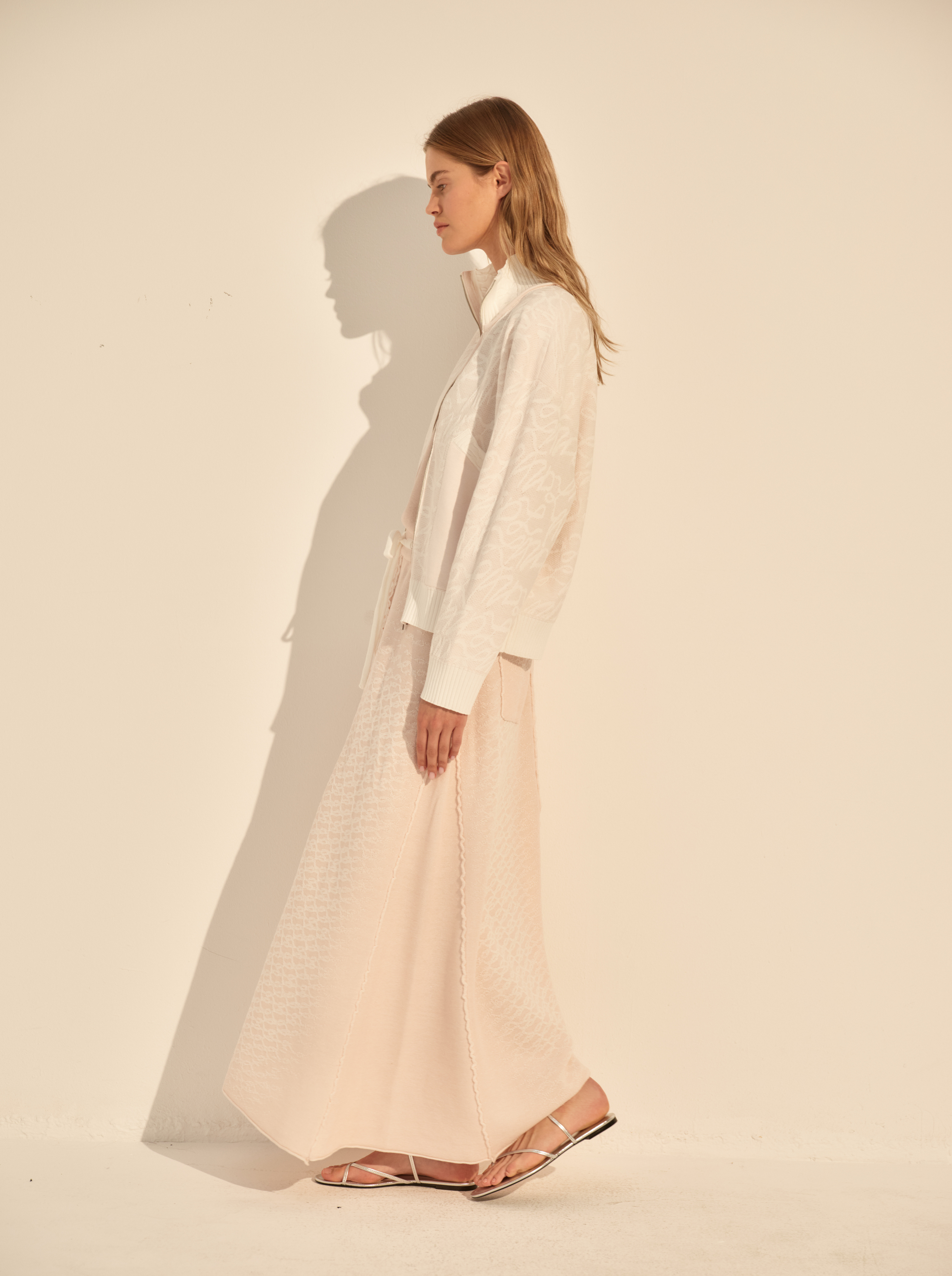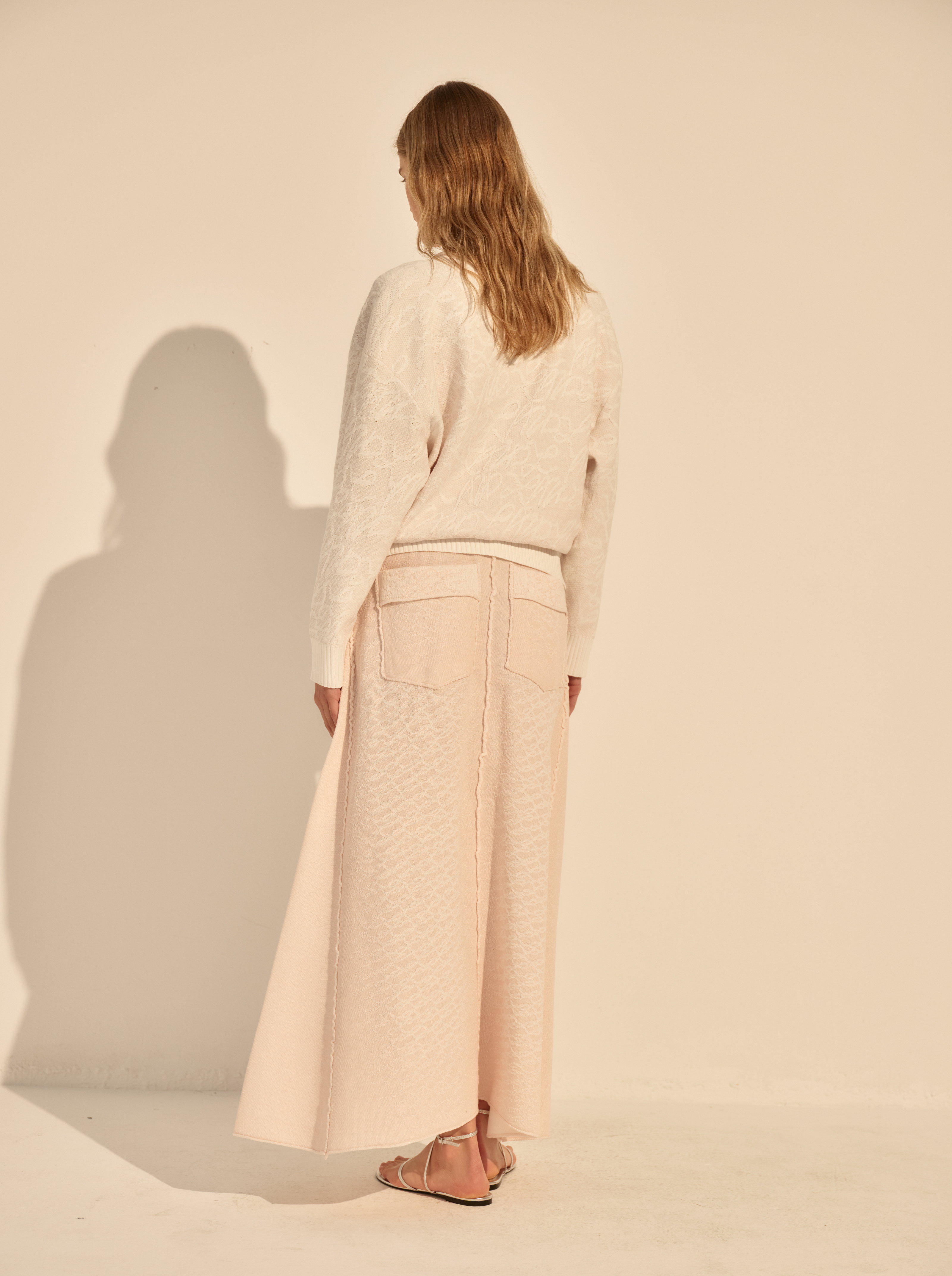 Длина макси и слегка расширенный силуэт создают спокойную, вытянутую линию. Вертикальные швы визуально структурируют модель и подчёркивают движение ткани.