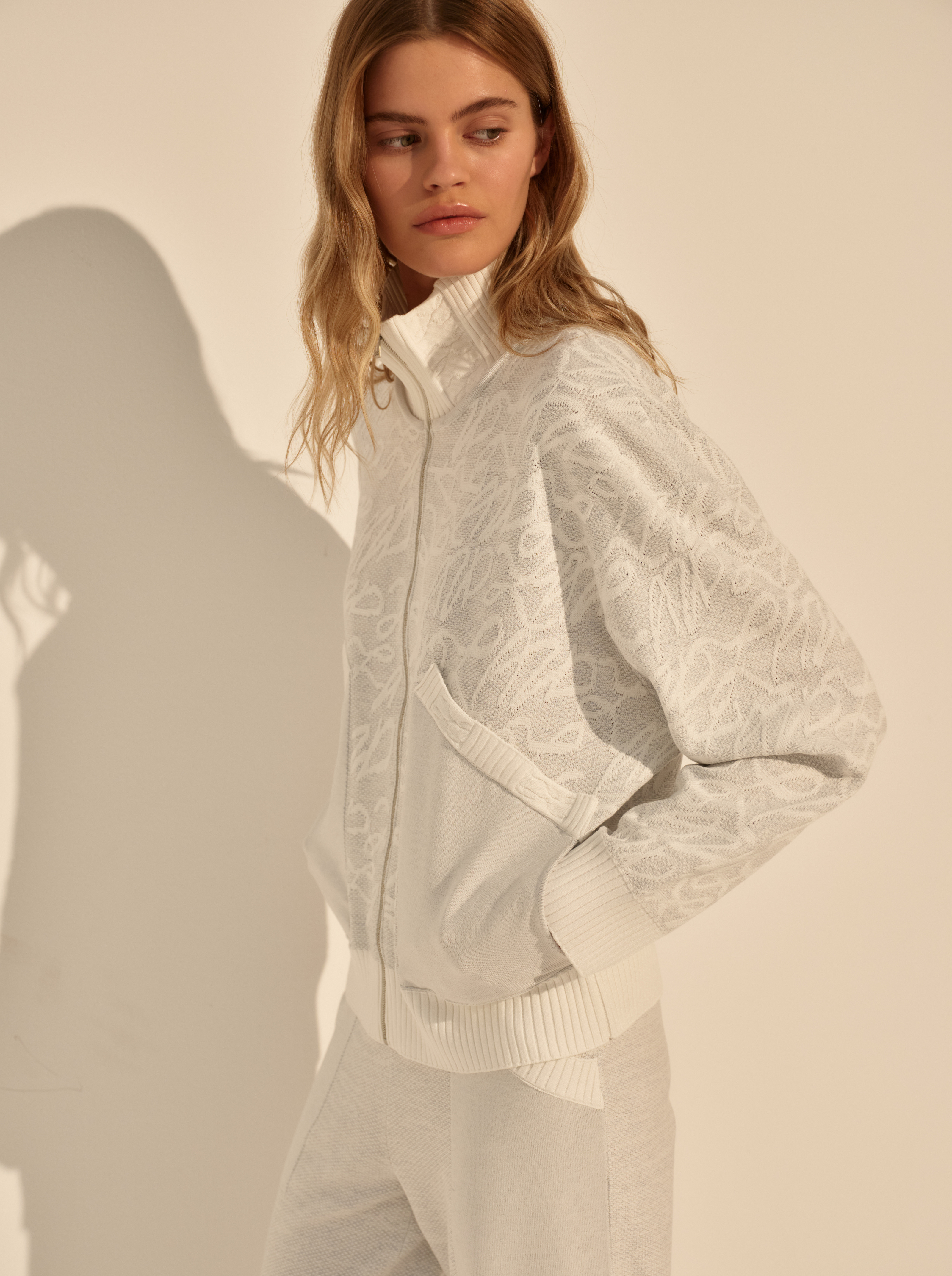 Фактурный трикотаж добавляет глубину. Высокий воротник-стойка и застёжка на молнию формируют чёткую вертикаль и подчёркивают функциональный характер модели.