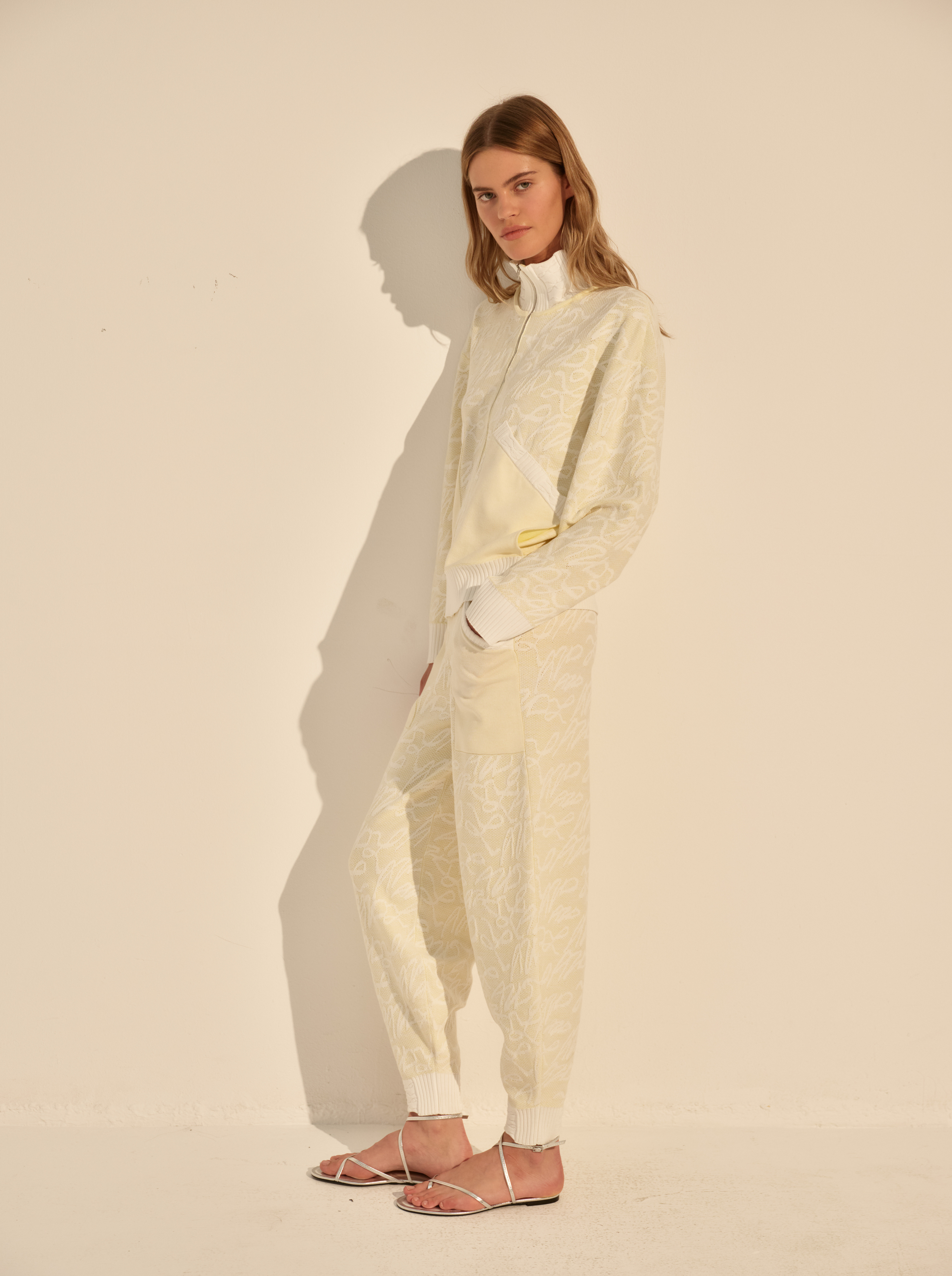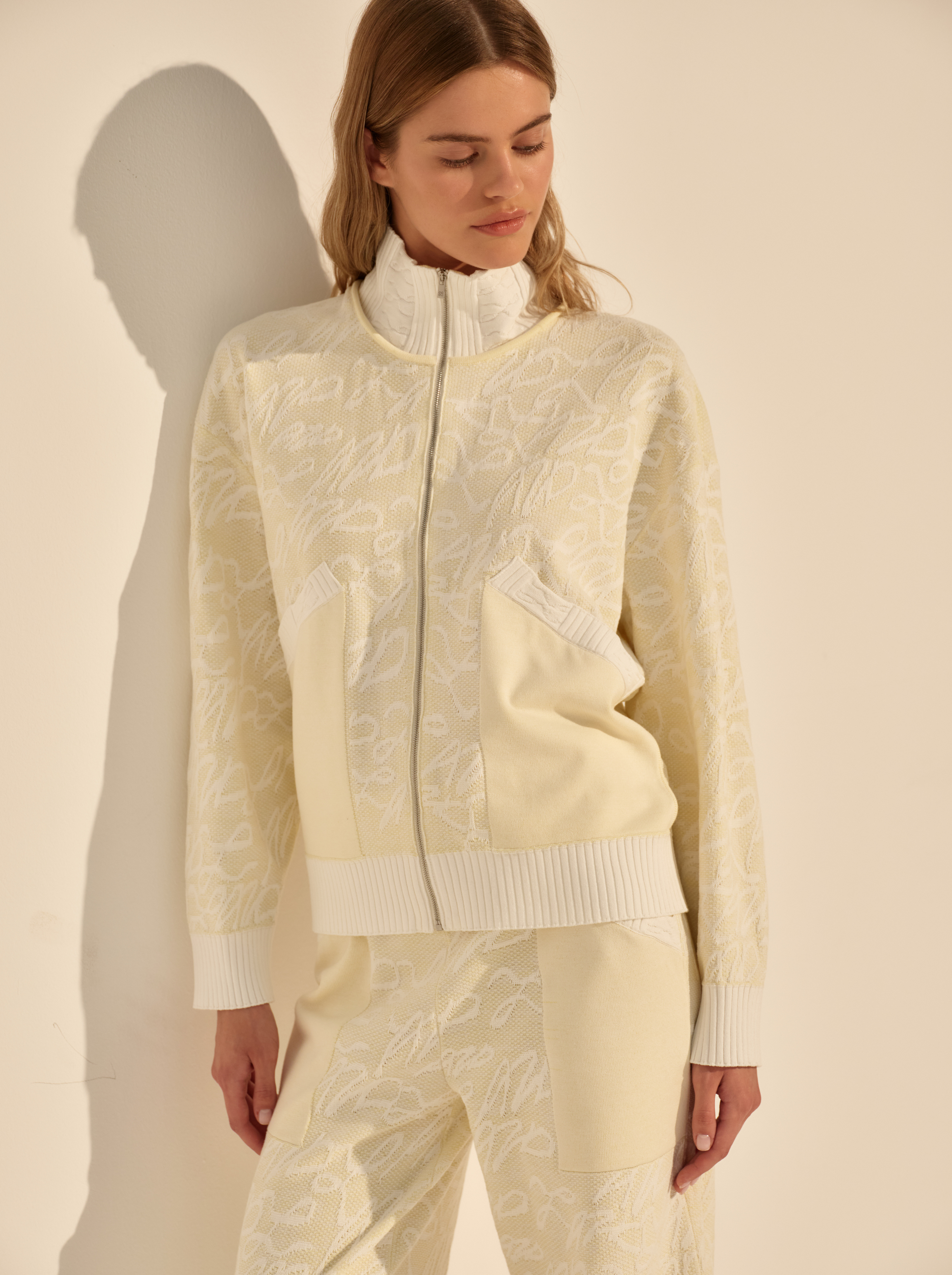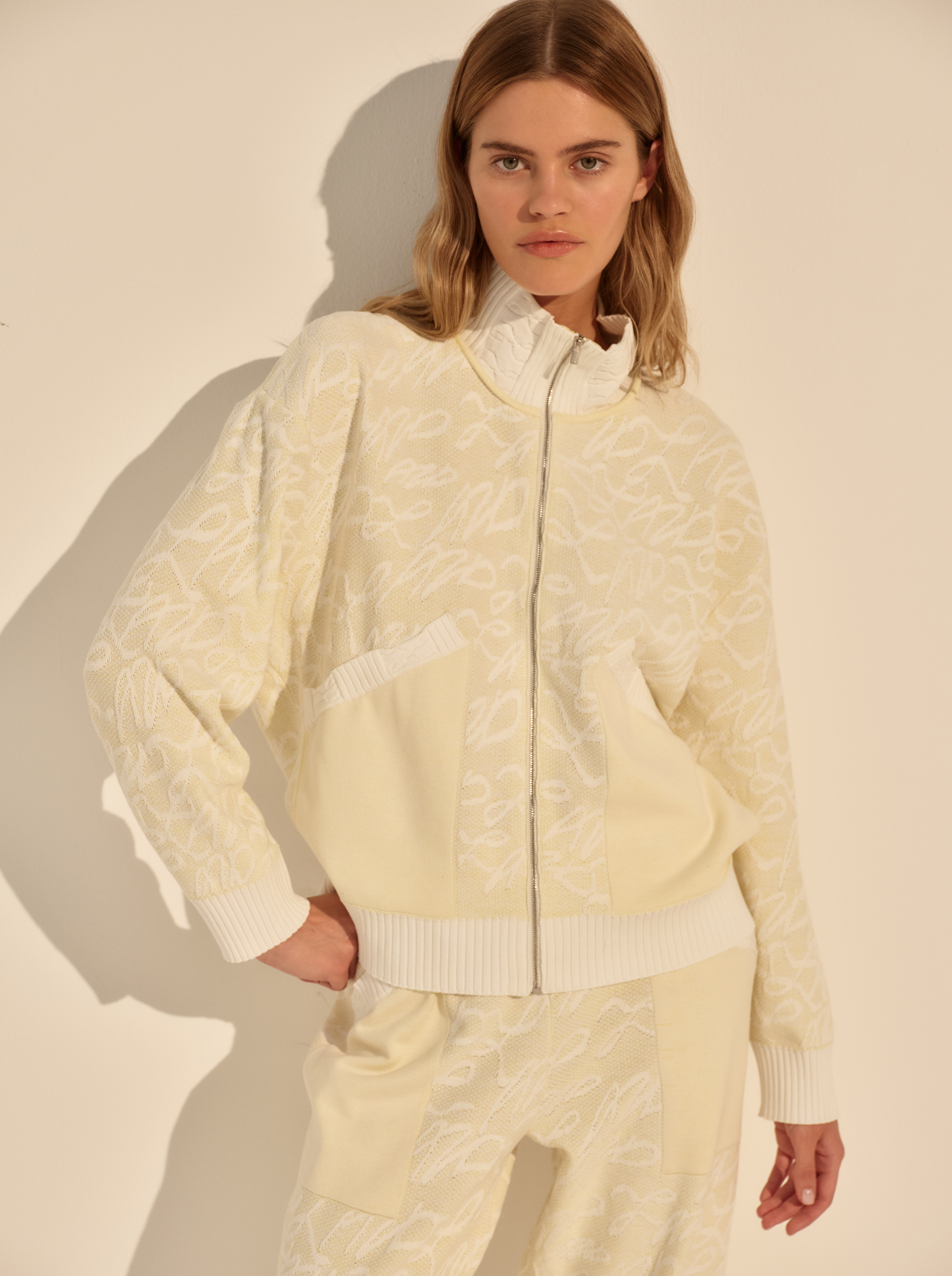 Фактурный трикотаж добавляет глубину. Высокий воротник-стойка и застёжка на молнию формируют чёткую вертикаль и подчёркивают функциональный характер модели.