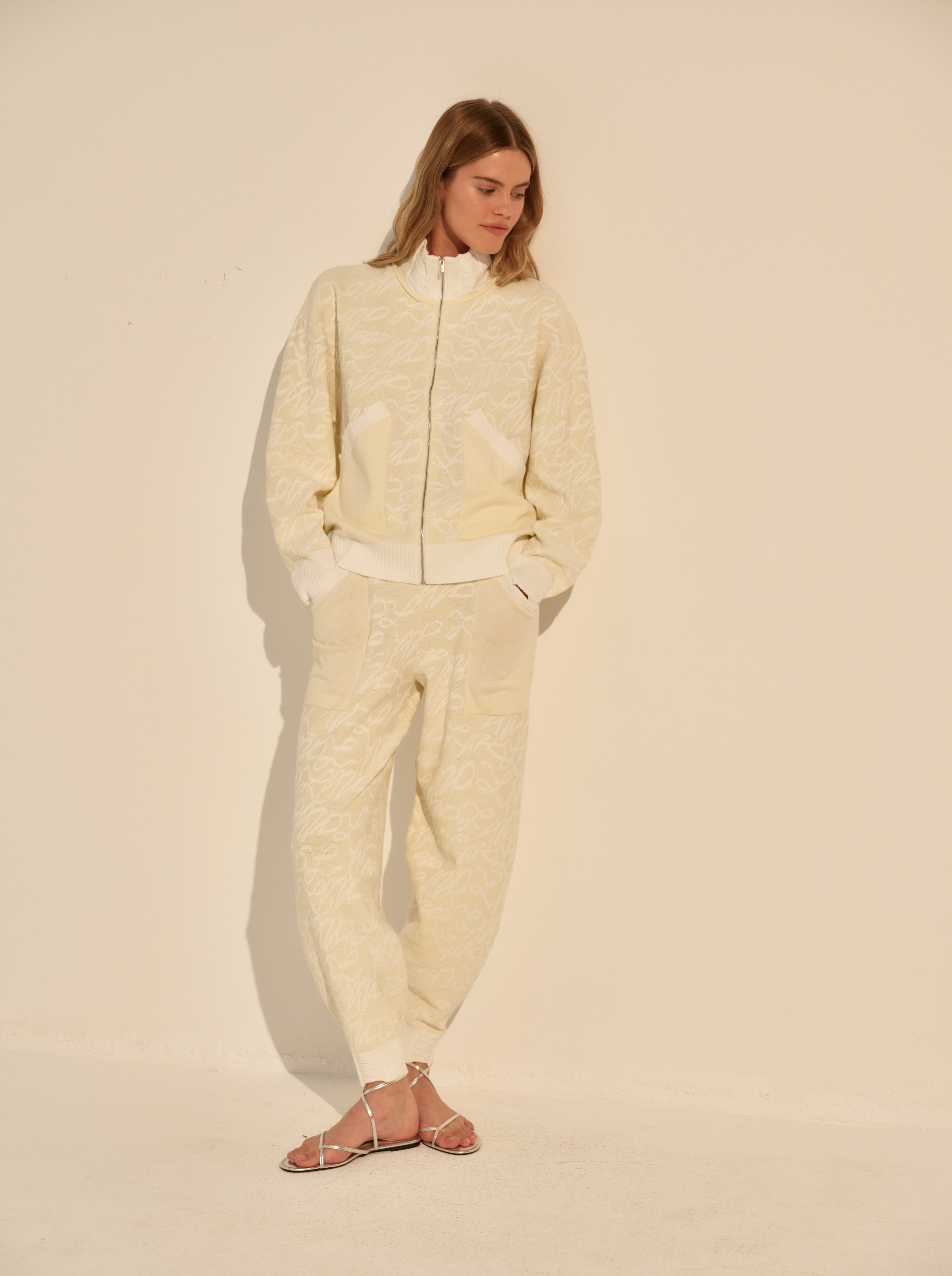 Брюки Chiffre выполнены из вискозы с небольшим добавлением полиэстера — материал мягкий, гладкий и пластичный, приятно ложится по фигуре. Поверхность ткани с деликатным узором создаёт спокойный визуальный ритм и добавляет глубины светлому оттенку.