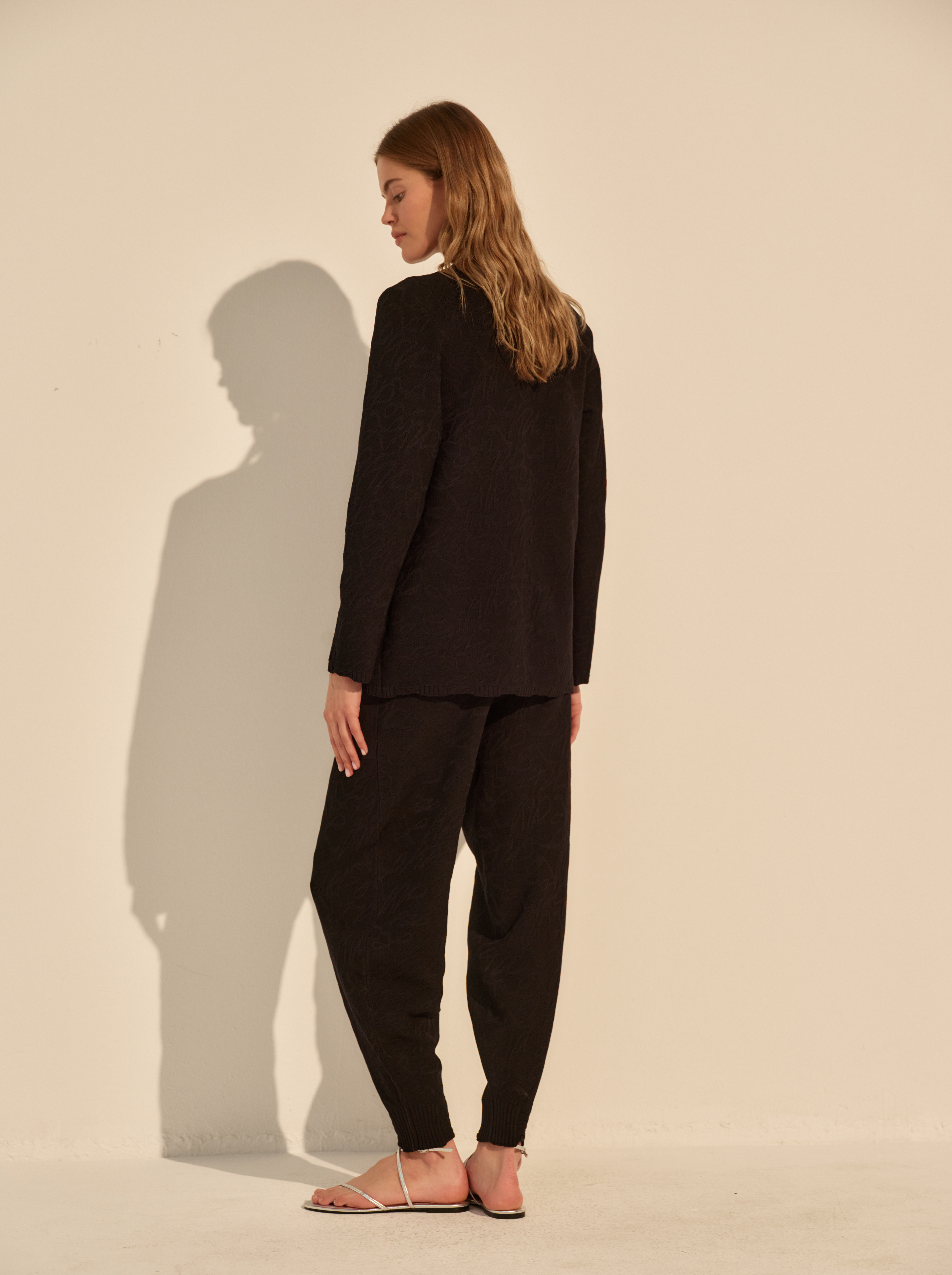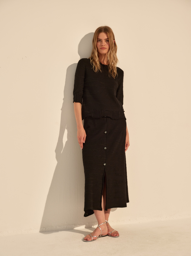 Глубокий вырез открывает зону декольте и задаёт более вытянутую, уверенную линию. Фактура трикотажа создаёт спокойную игру поверхности, заметную только при движении и свете.