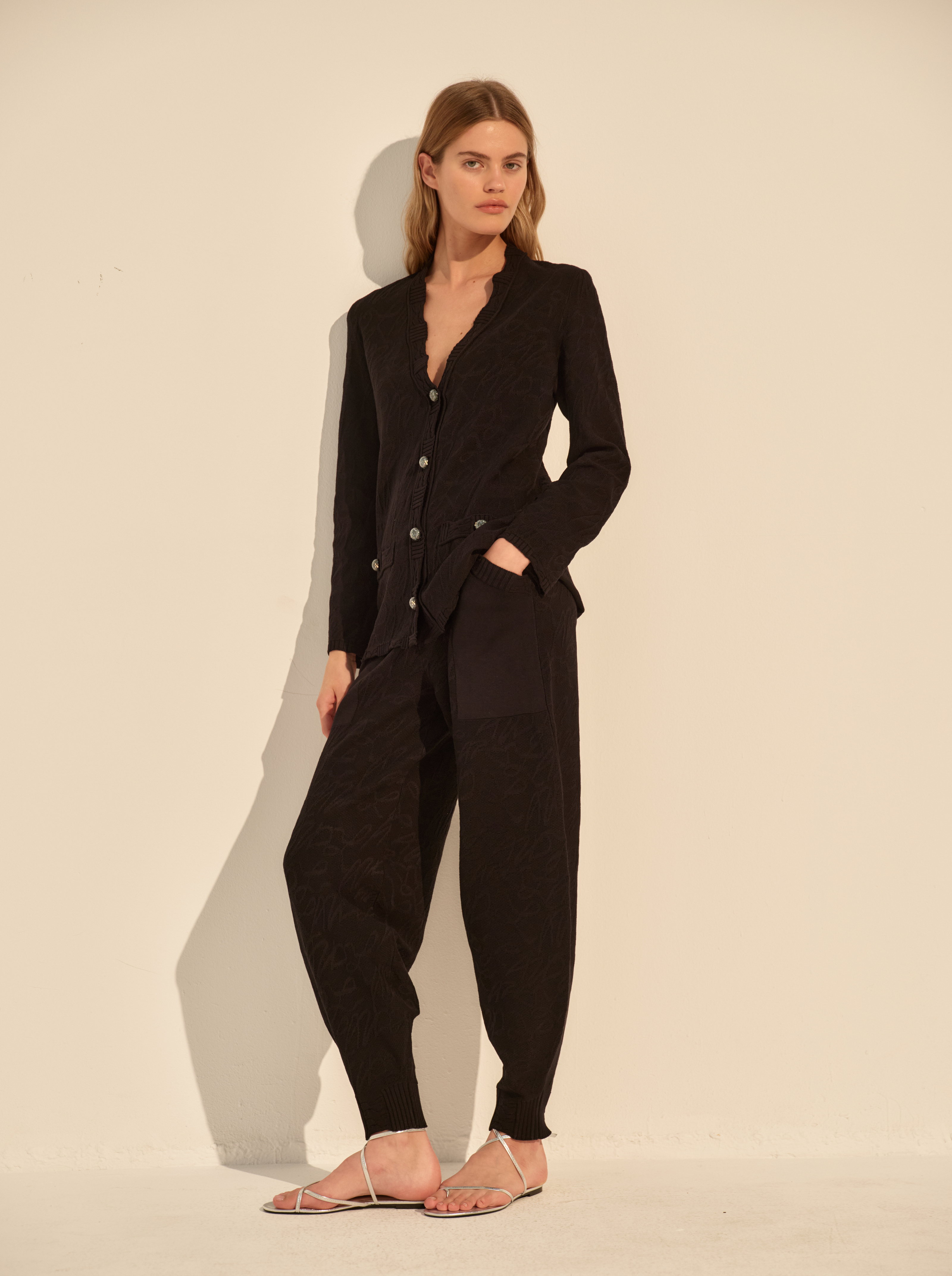 Декоративные пуговицы и аккуратные карманы добавляют ритм и балансируют глубину выреза. Кардиган хорошо работает как самостоятельная вещь или в сочетании с минималистичными топами.
