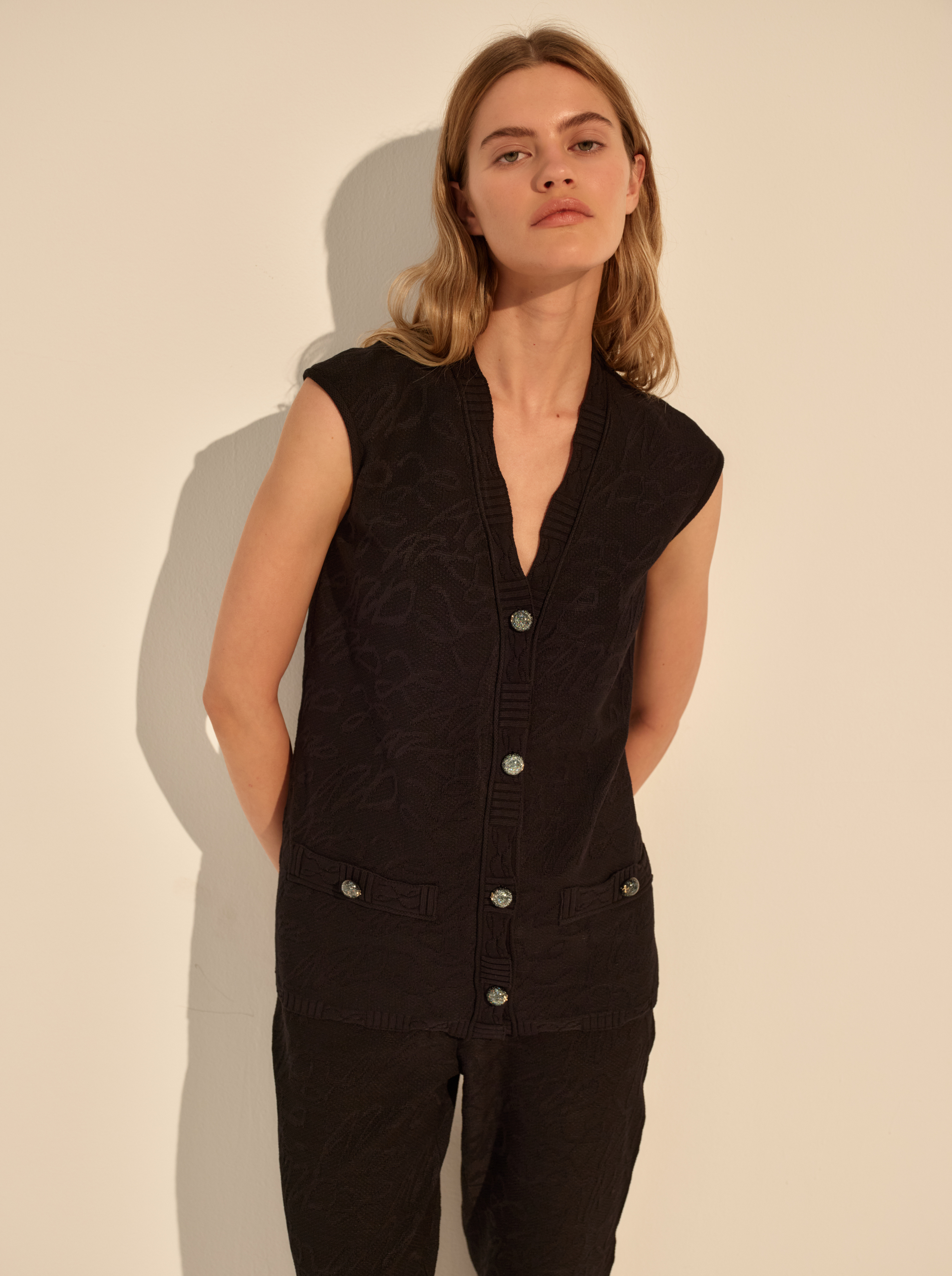 Фактура добавляет глубину светлой поверхности. Брюки могут быть частью комплекта и отдельно — для расслабленных, но продуманных повседневных сочетаний.
