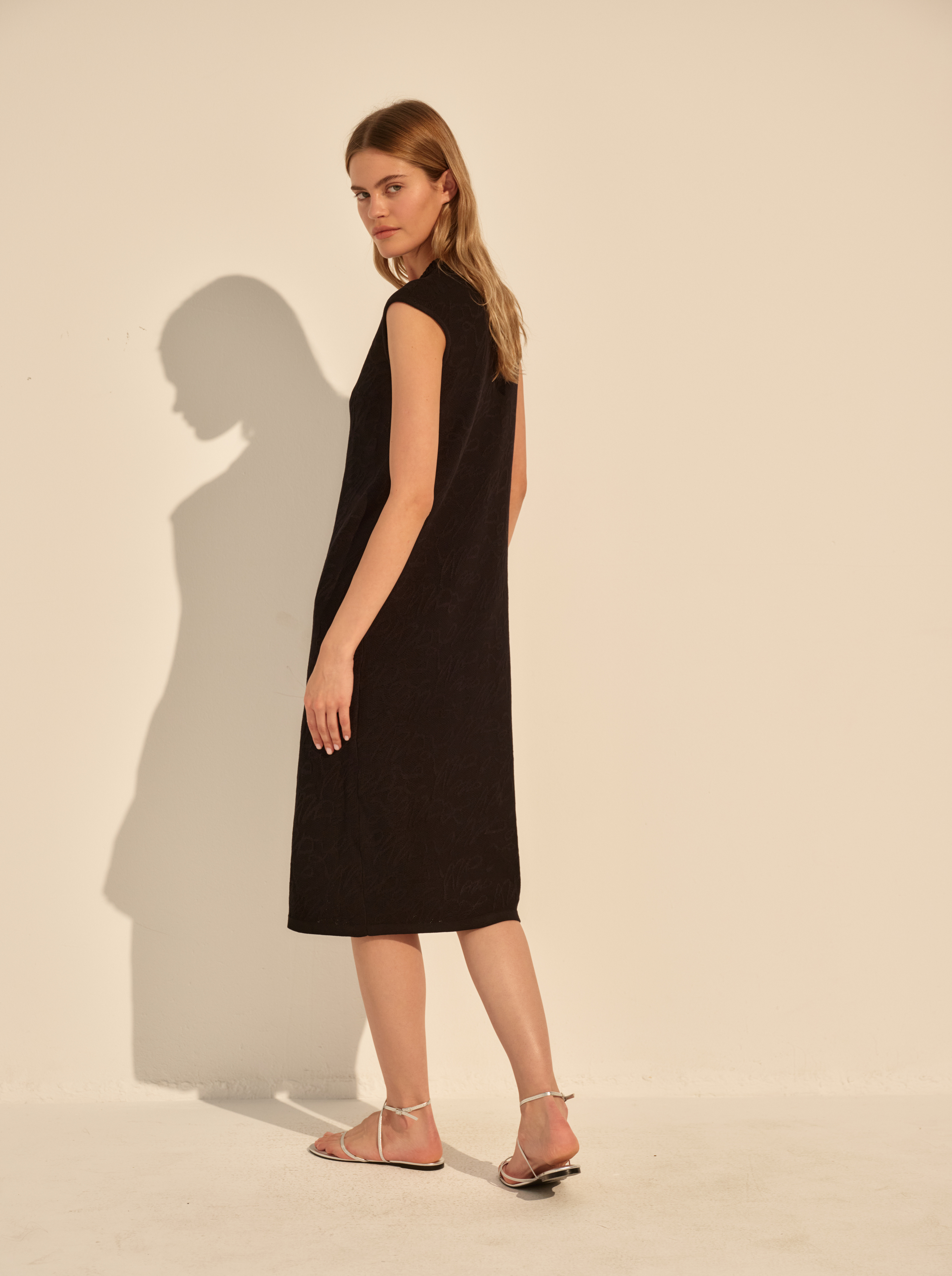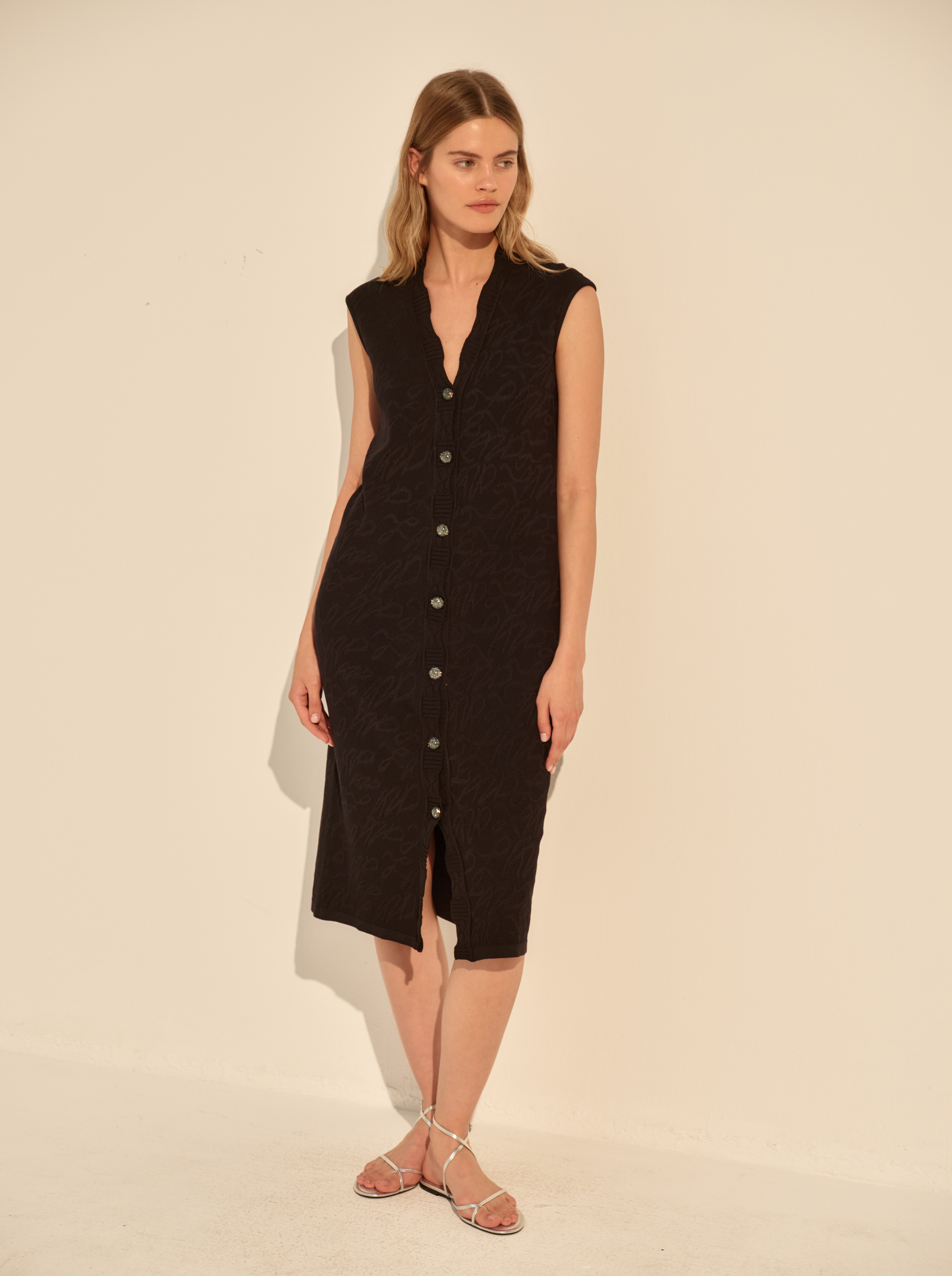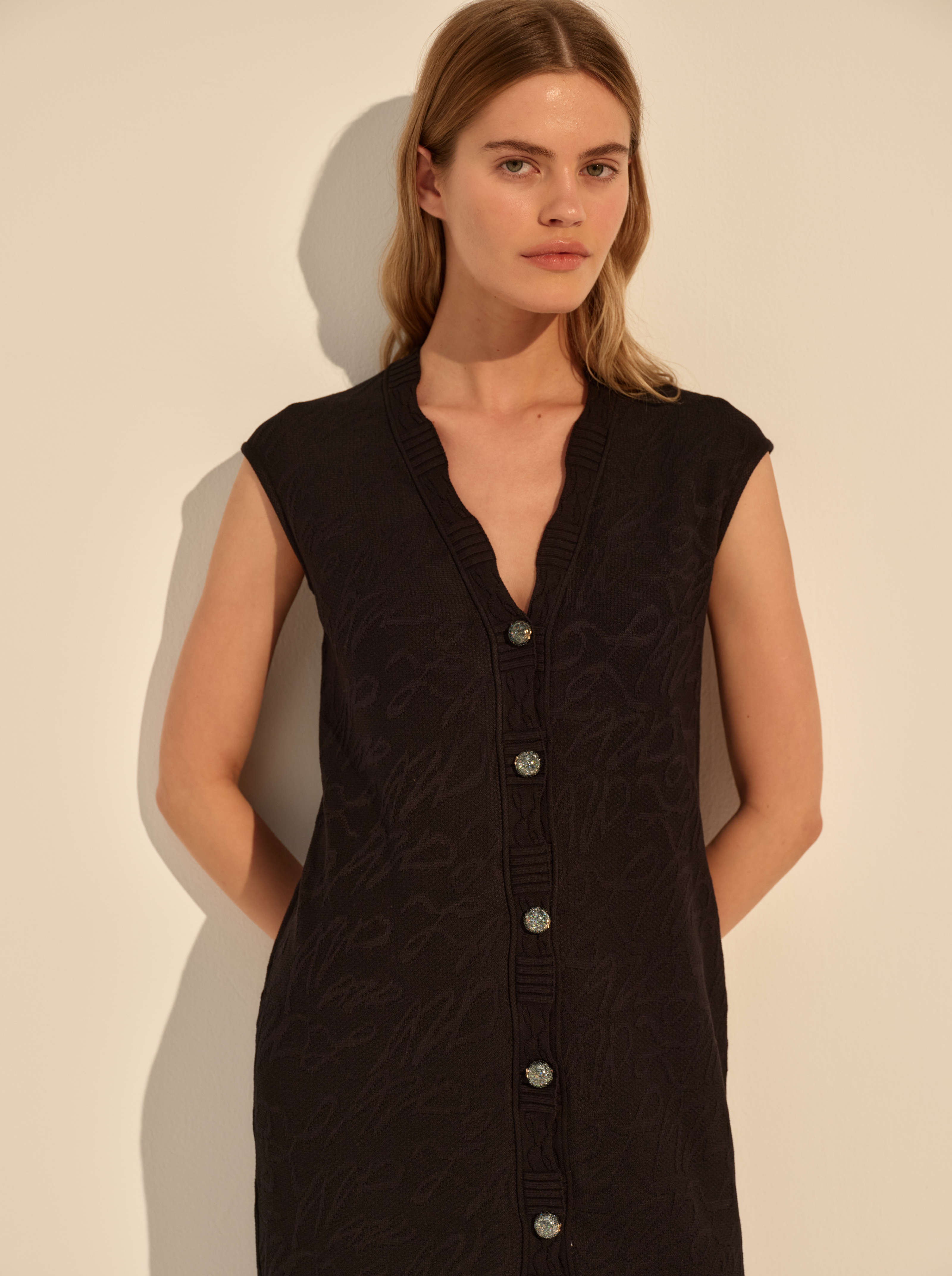 Прямой силуэт дополнен глубоким вырезом и функциональной застёжкой на пуговицы, которые можно расстёгивать, регулируя глубину выреза и разрез по низу. Отсутствие рукавов подчёркивает линию плеч, застежка на пуговицы визуально вытягивает фигуру.