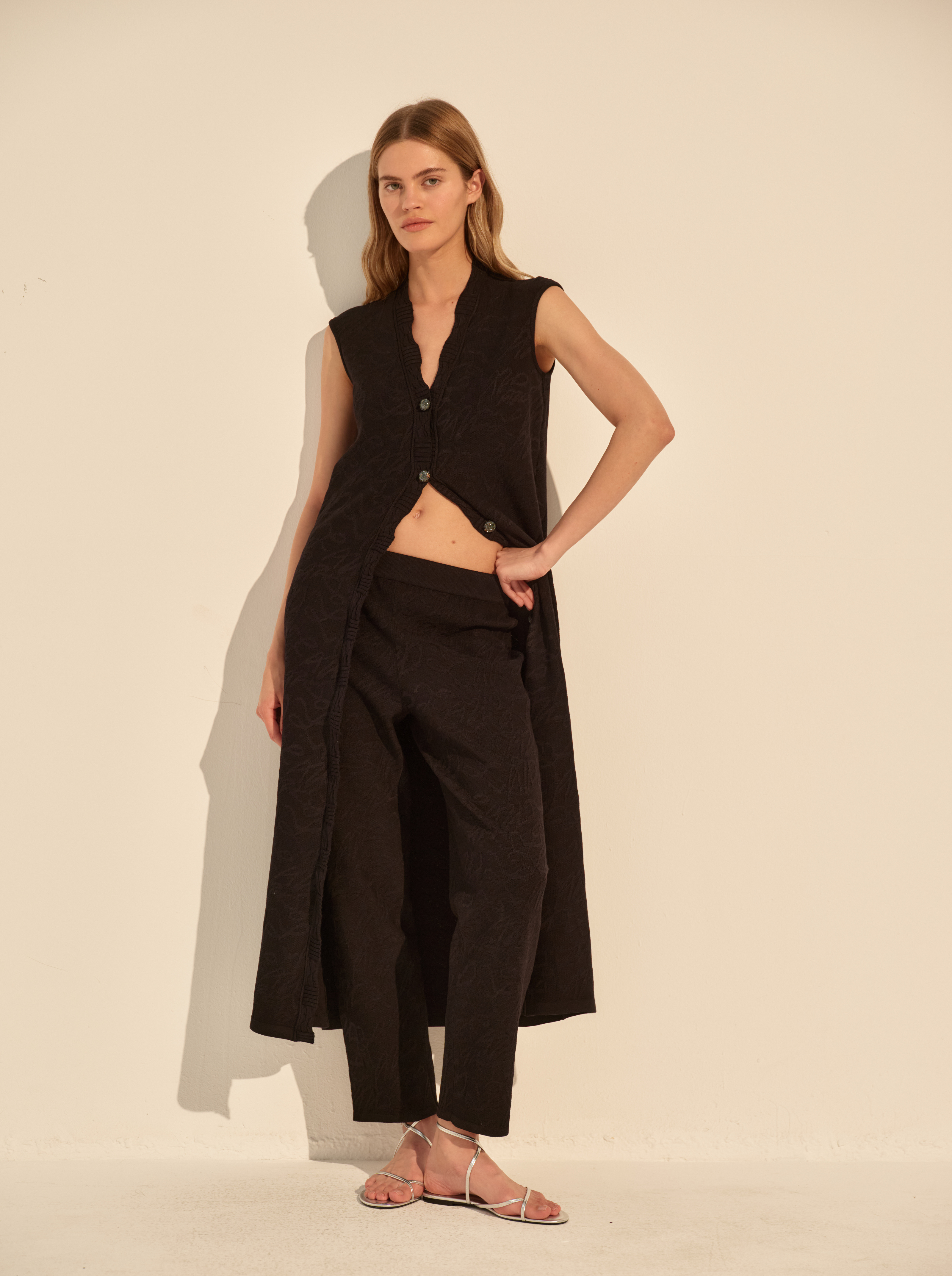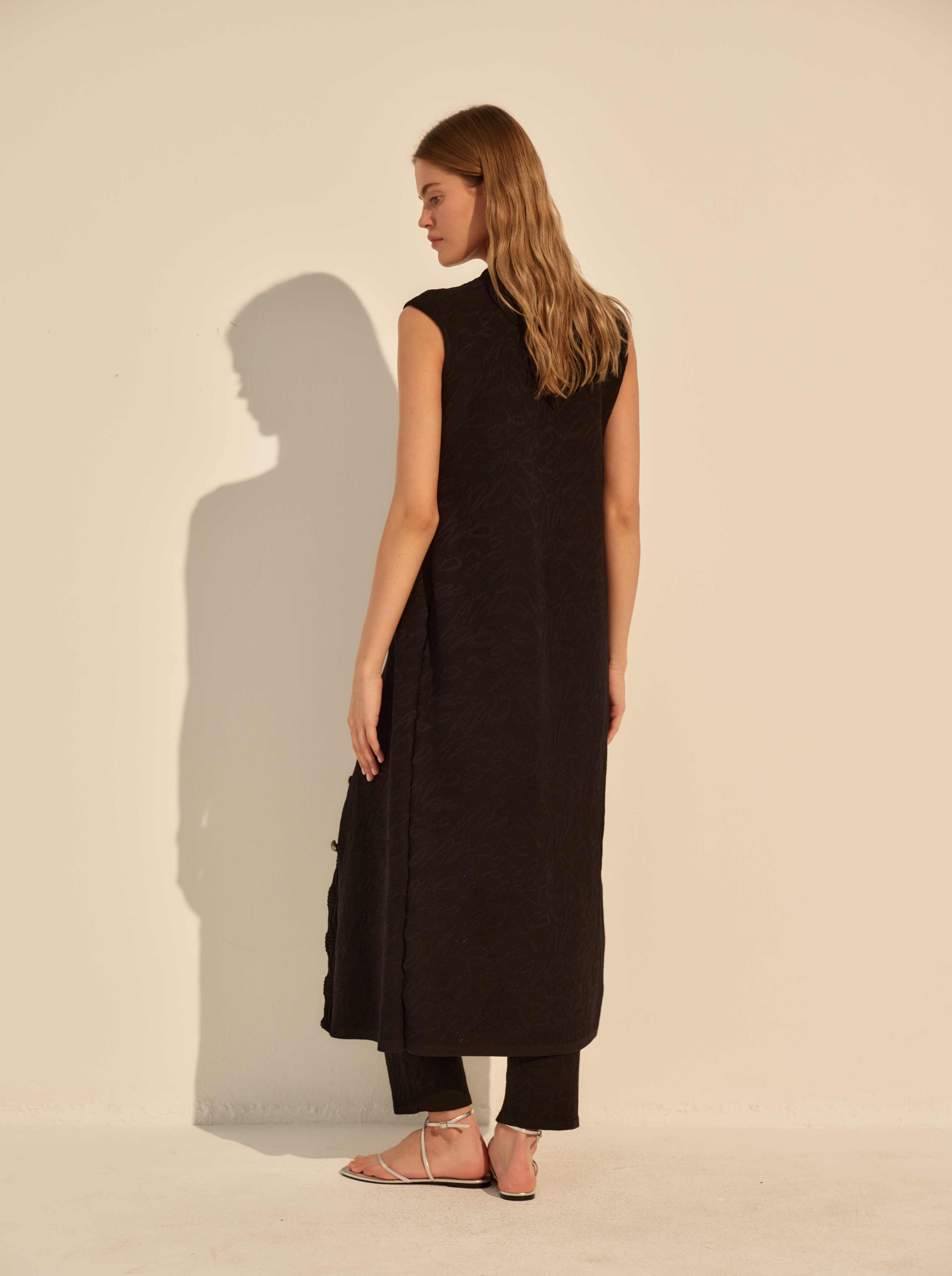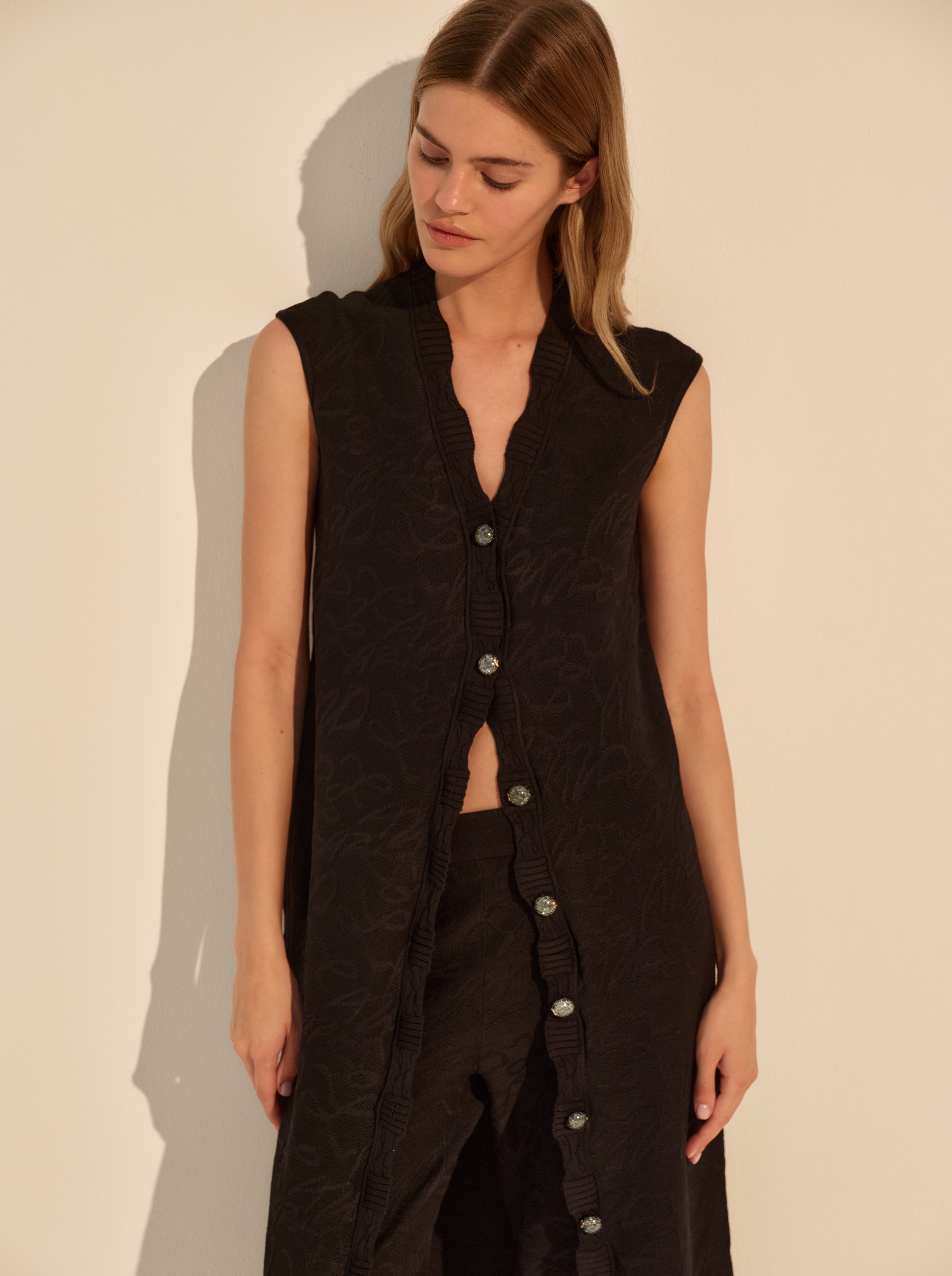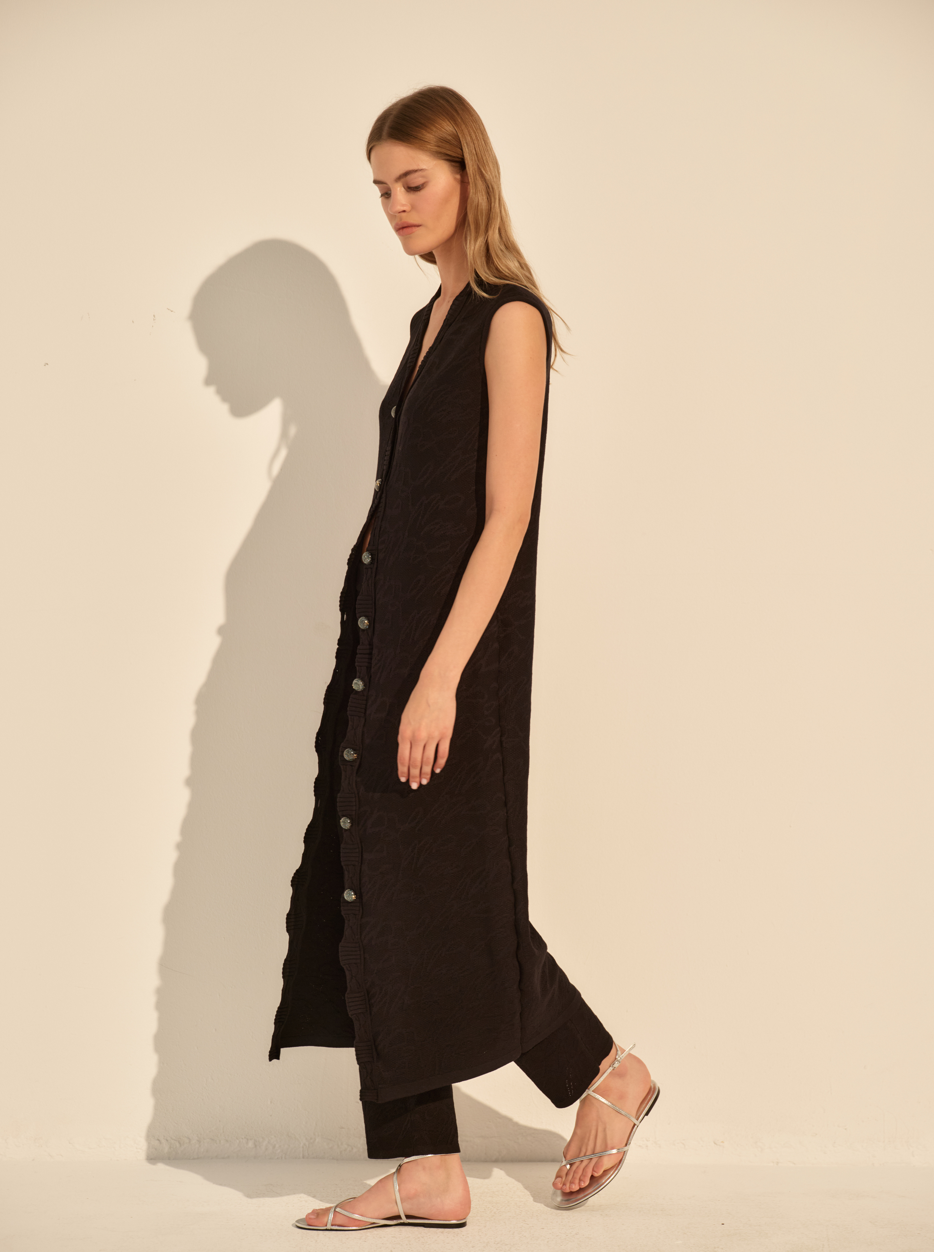 Прямой силуэт дополнен глубоким вырезом и функциональной застёжкой на пуговицы, которые можно расстёгивать, регулируя глубину выреза и разрез по низу. Отсутствие рукавов подчёркивает линию плеч, застежка на пуговицы визуально вытягивает фигуру.