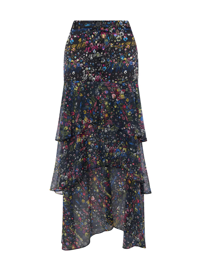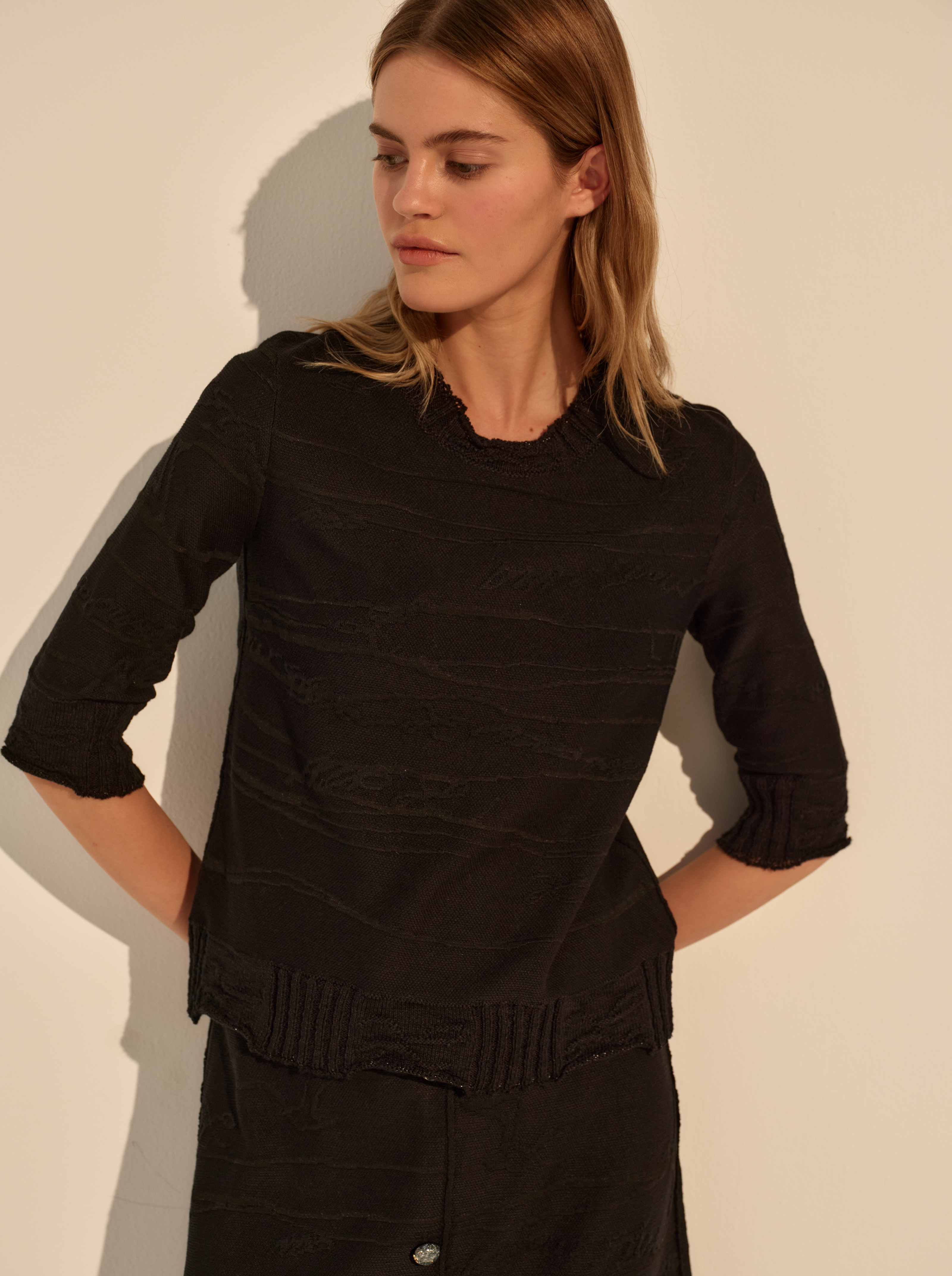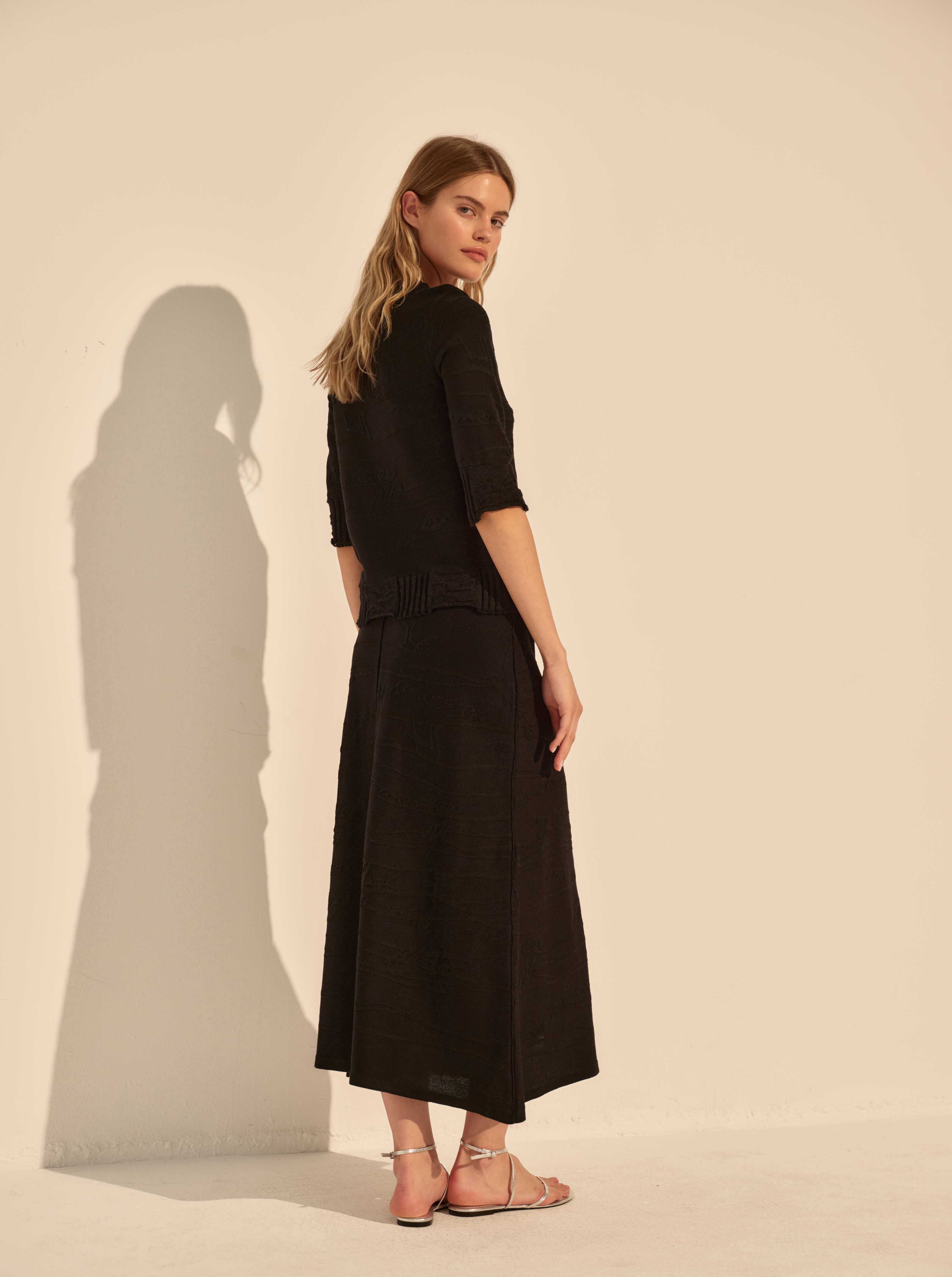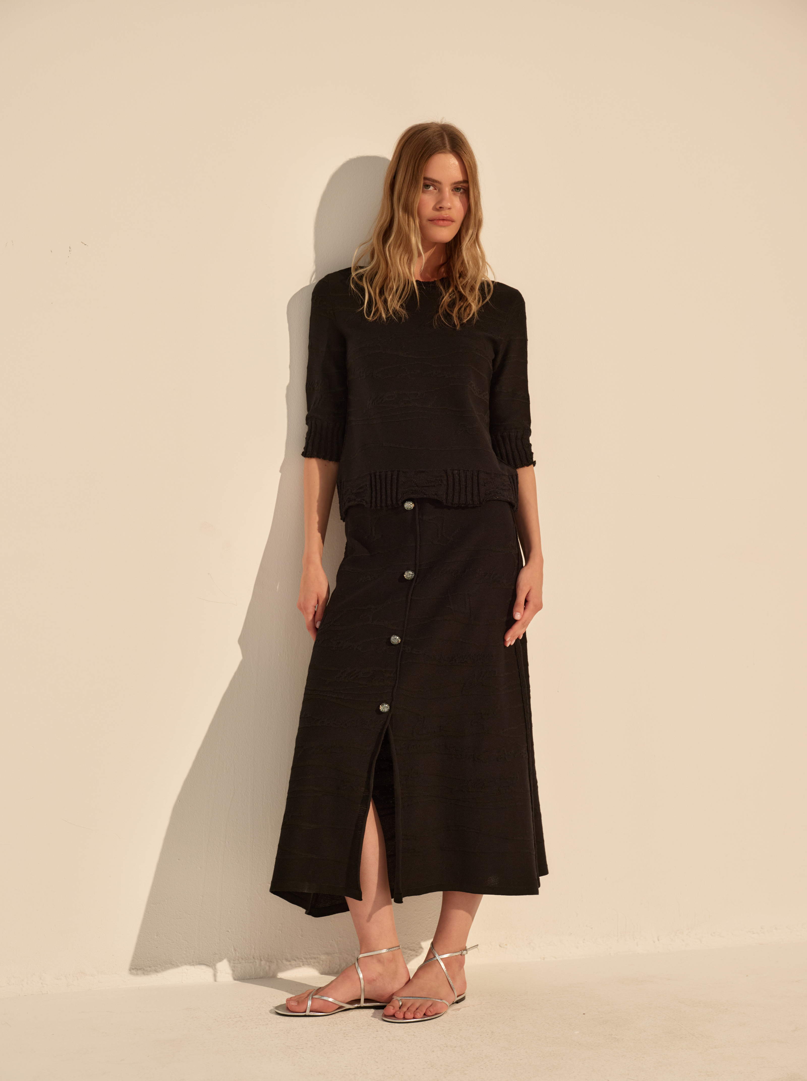 Фактура ненавязчиво проявляется на полотне, создавая ощущение глубины. Юбка легко комбинируется с трикотажными топами и джемперами и работает как база в летнем и межсезонном гардеробе.