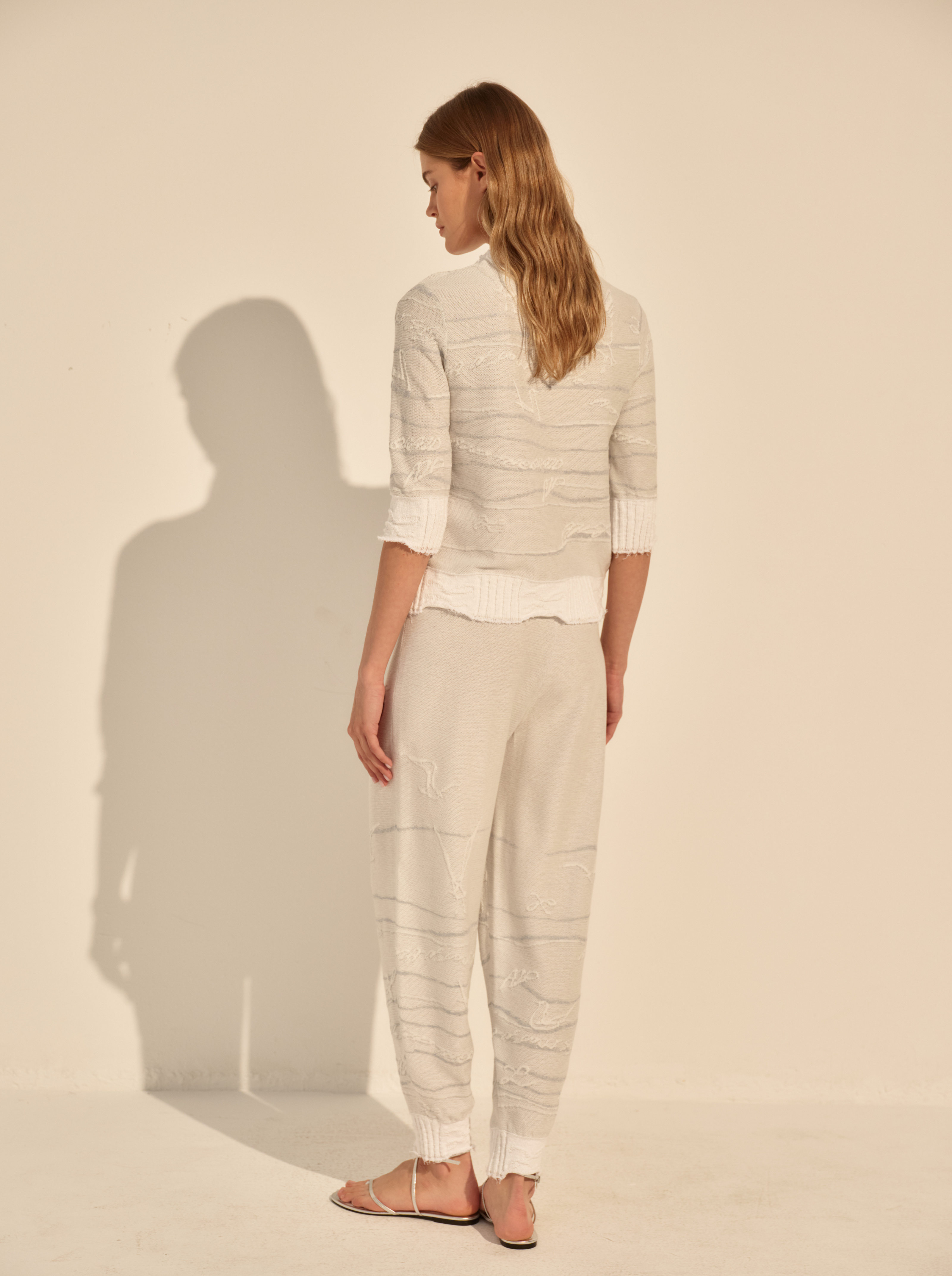 Фактурный рисунок добавляет глубину и делает модель визуально живой, не перегружая её деталями. Контрастная отделка по низу, манжетам и горловине подчёркивает структуру и придаёт образу завершённость.