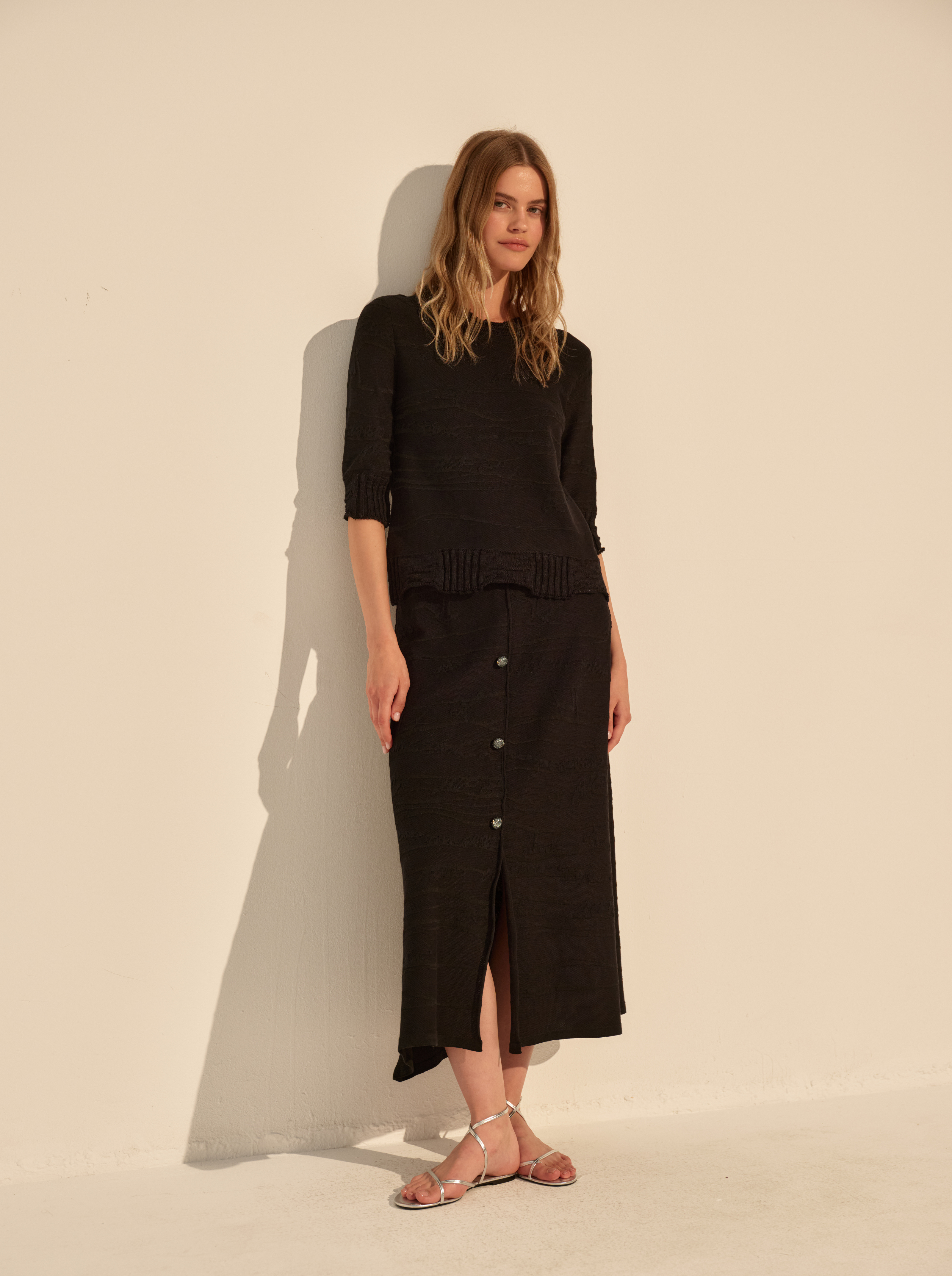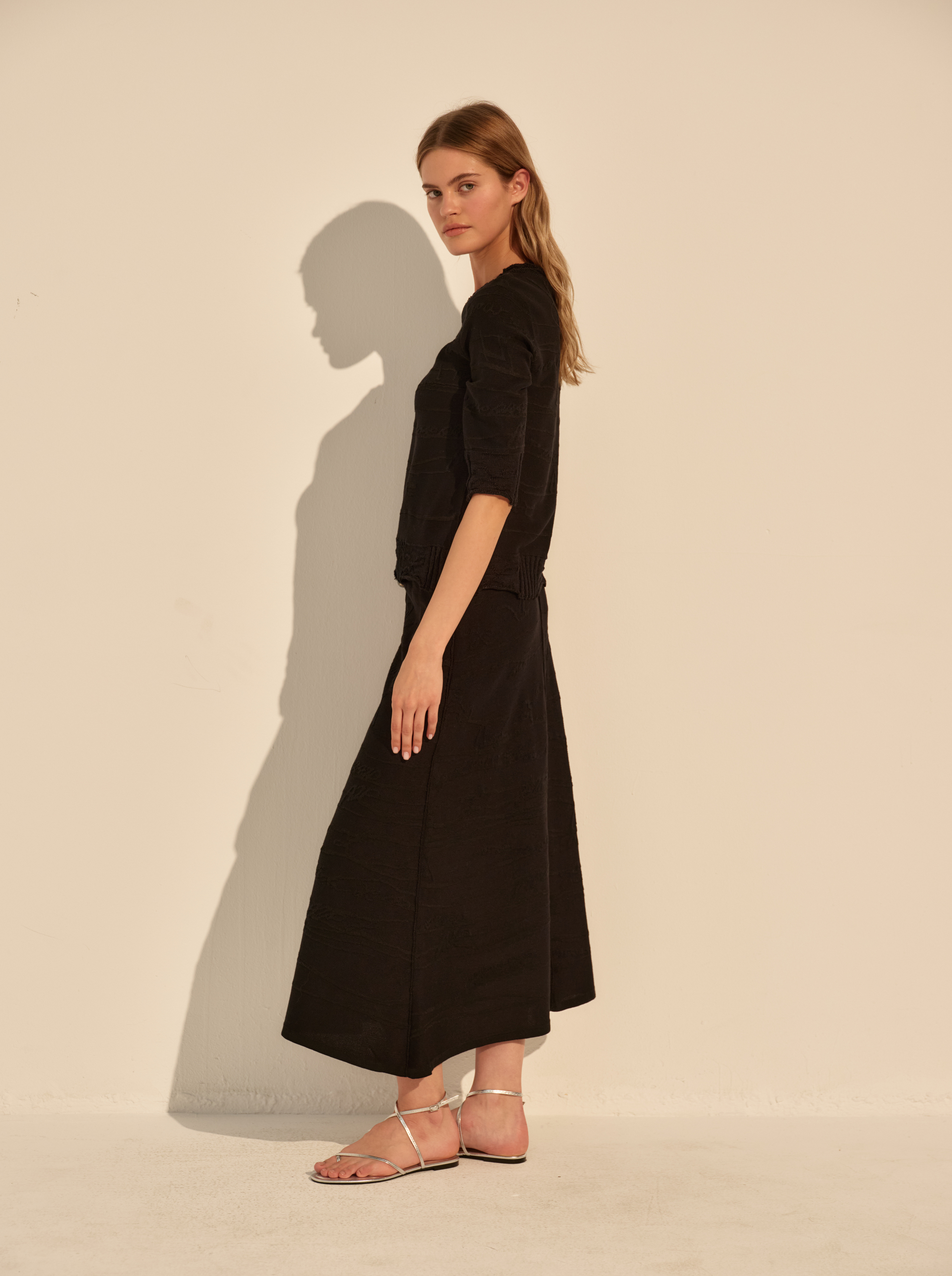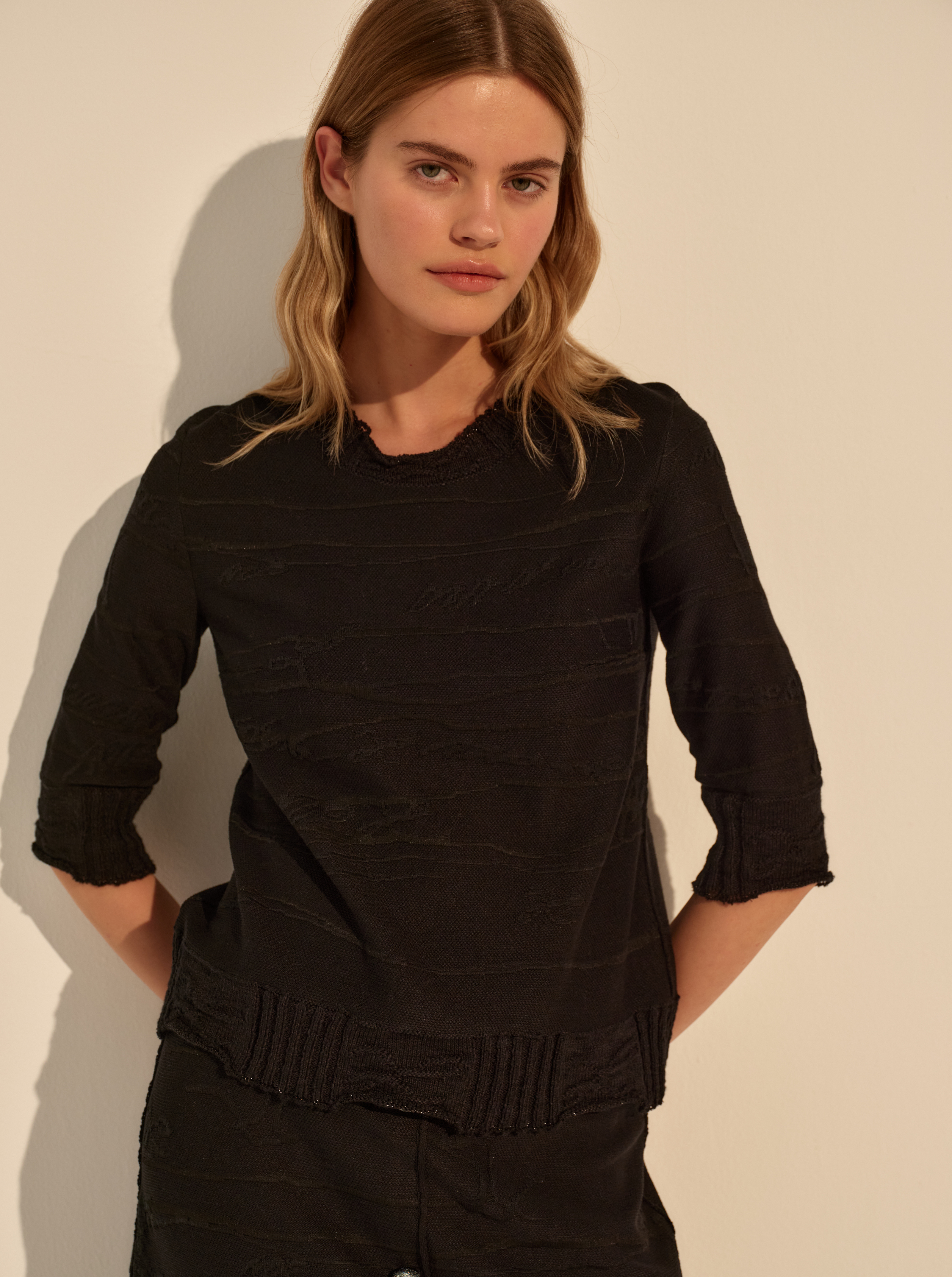 Полуприлегающий силуэт и аккуратная посадка подчёркивают фигуру, сохраняя свободу движений. Рукав 3/4 и фактурная поверхность с рельефным рисунком добавляют глубину и делают модель визуально интересной без лишних деталей.