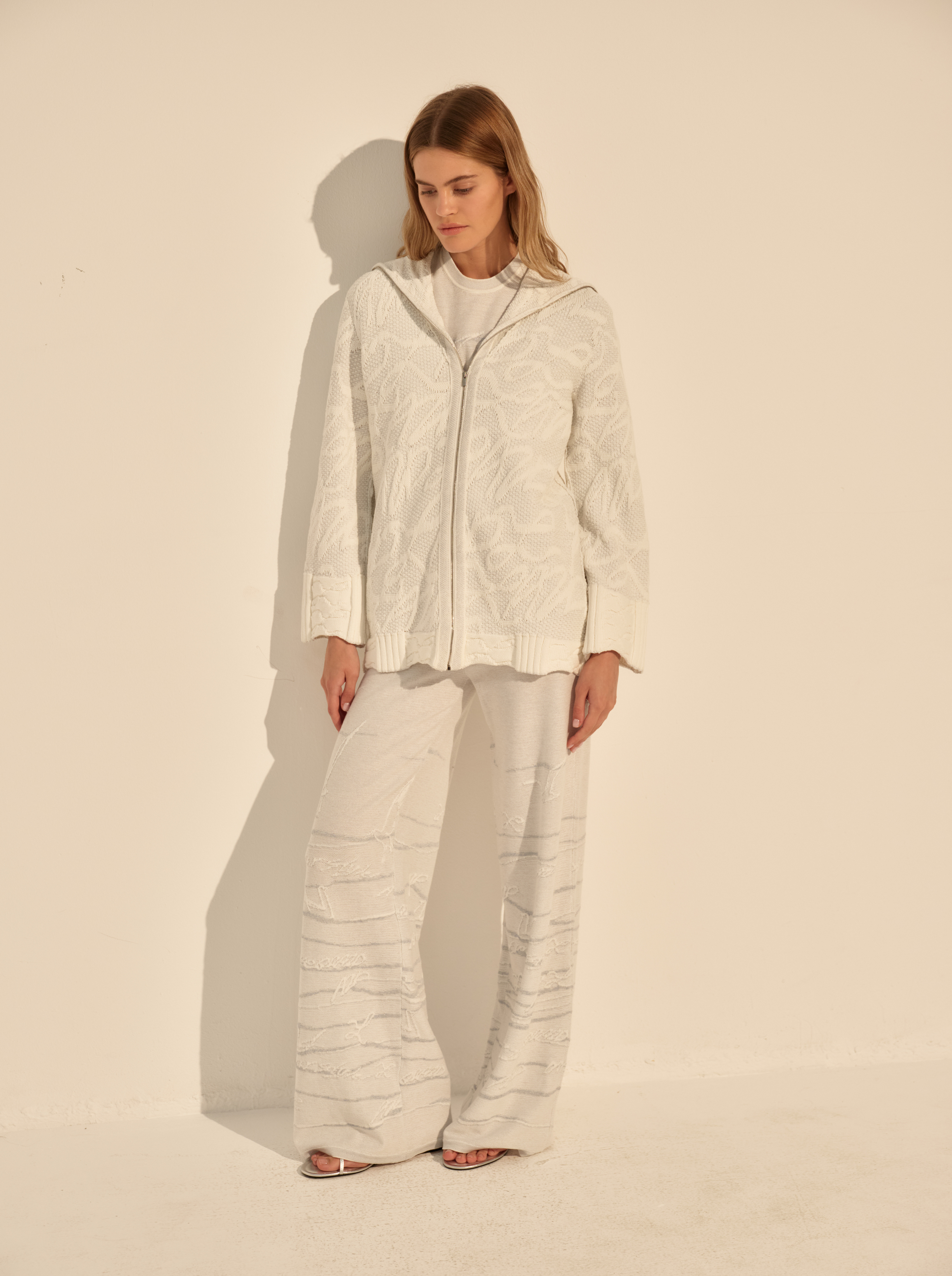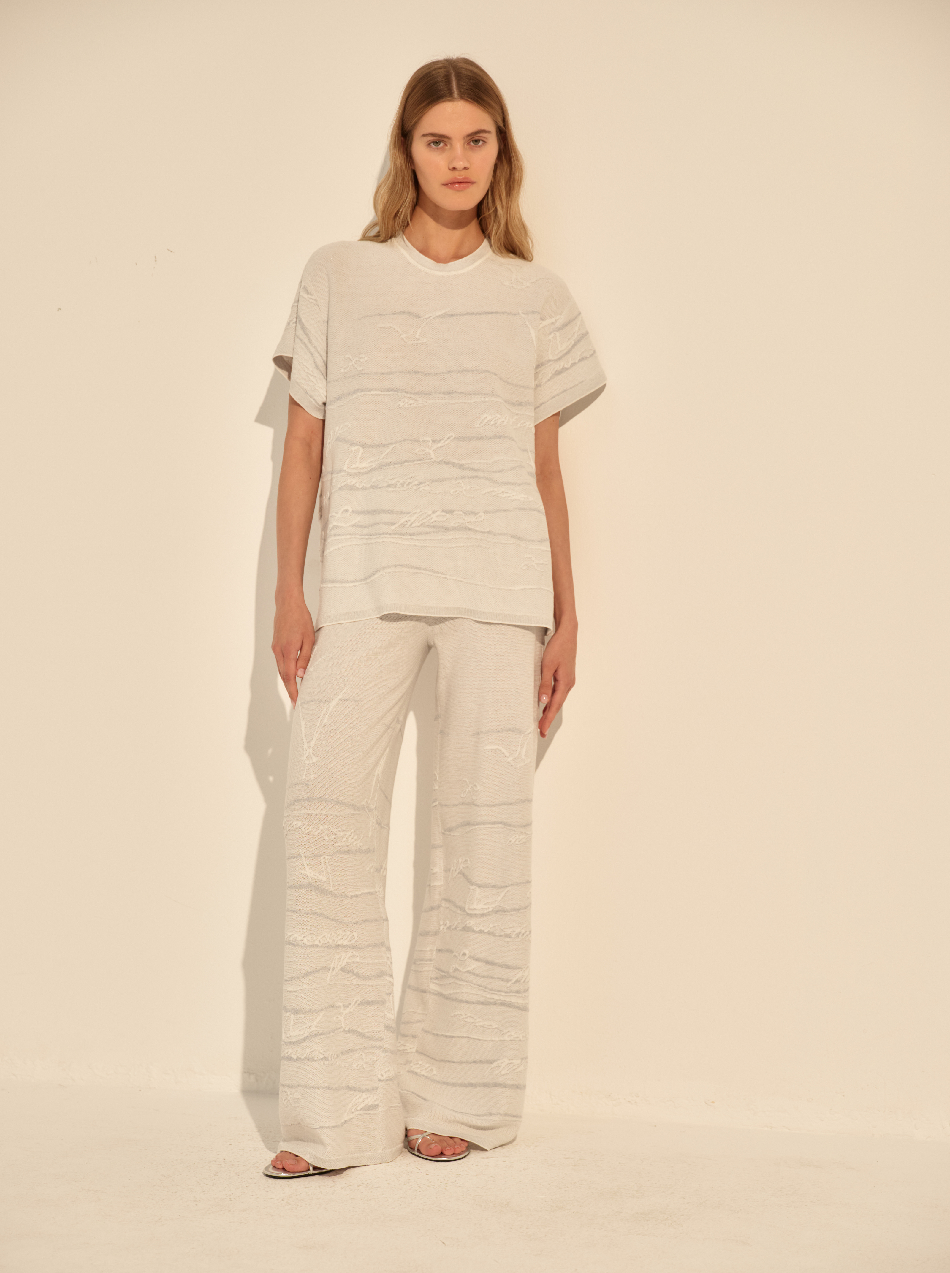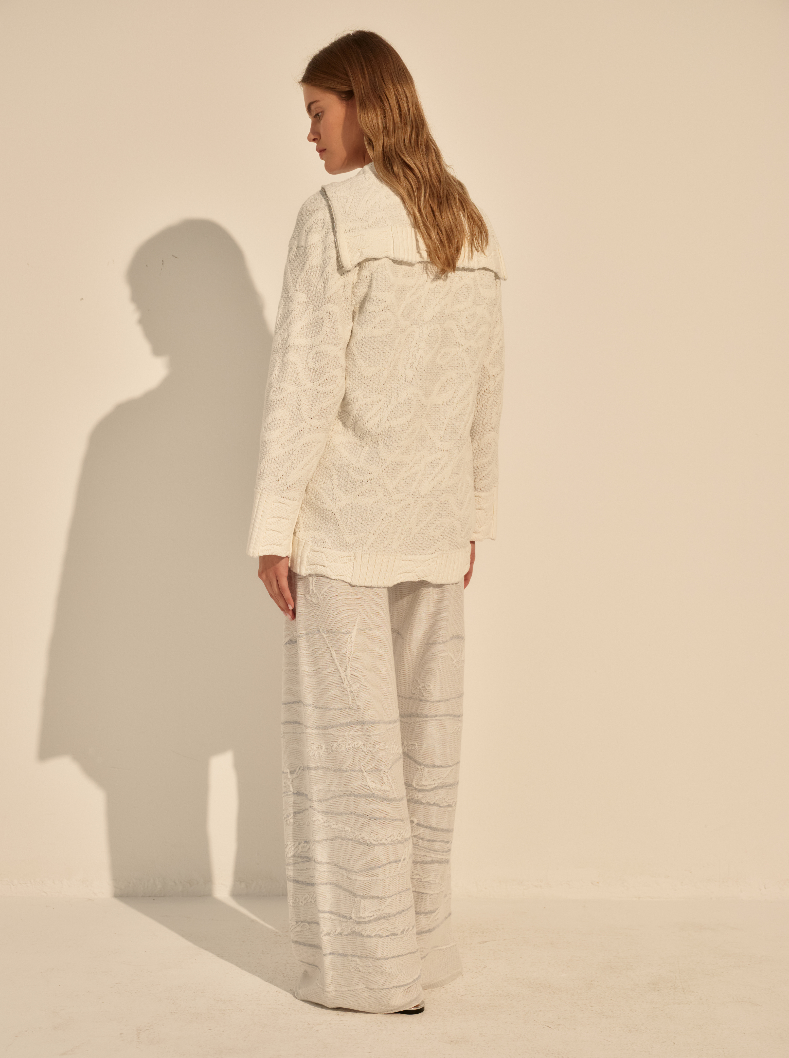 Легкая фактура добавляет глубину образу, оставаясь в рамках сдержанной эстетики. Брюки органично сочетаются с трикотажными топами и джемперами, создавая цельный и спокойный комплект.