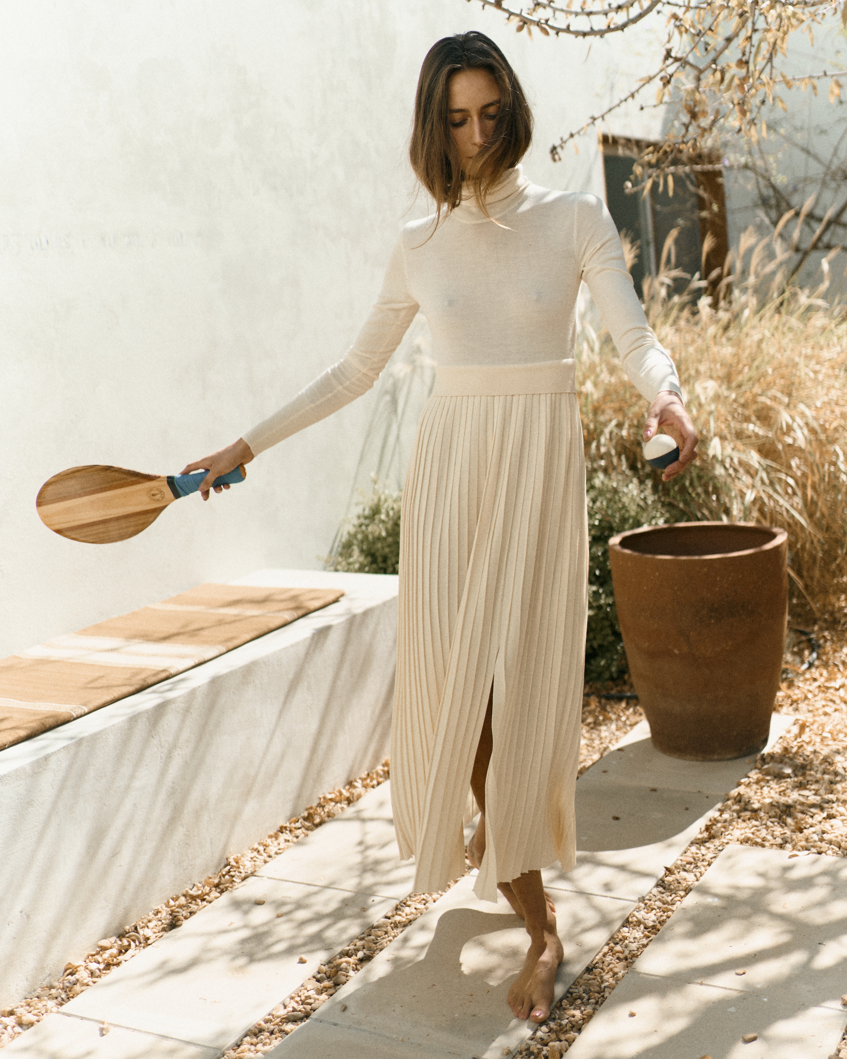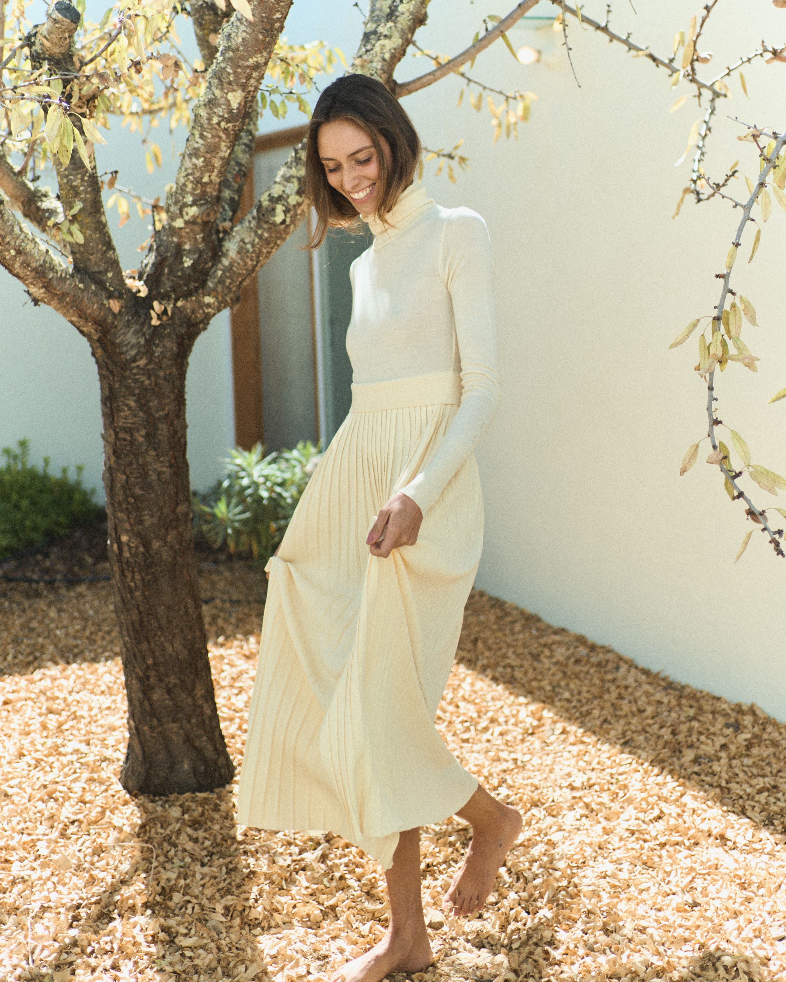 Платье из шерсти мериноса с плиссировкой, высоким воротом и разрезом. Мягкое полотно подчёркивает движения, сохраняя чёткий силуэт и чистоту линии.