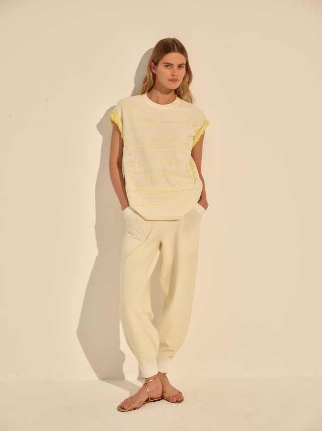 Эластичный пояс обеспечивает удобную посадку и свободу движения, а боковые карманы добавляют функциональности, не утяжеляя общий вид. Лаконичные линии подчёркивают чистоту формы и делают модель универсальной для сочетаний с трикотажным верхом и кардиганами.