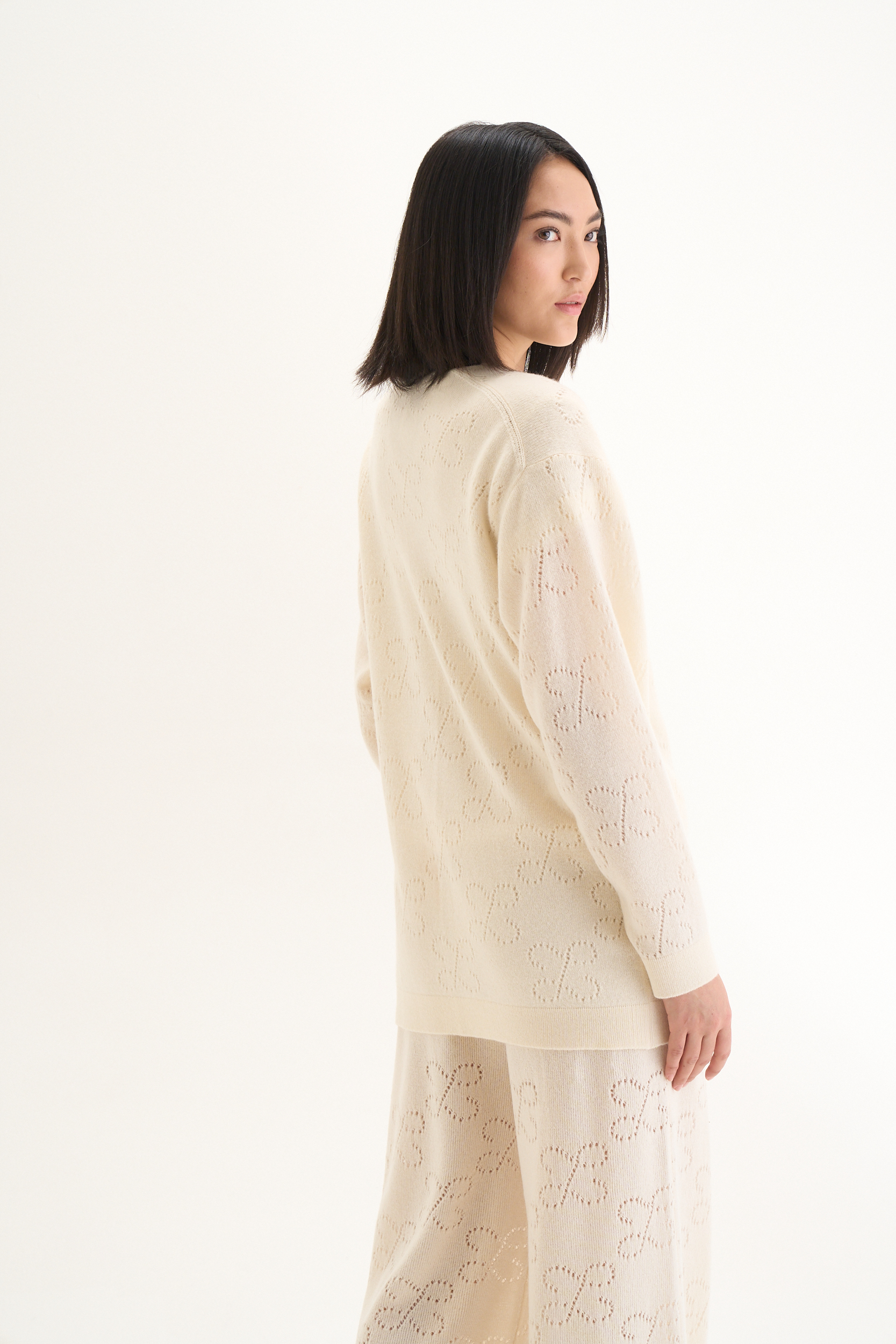 Кардиган из кашемира с ажурным эффектом выполнен в свободном силуэте, который мягко драпируется и не утяжеляет образ. Рукав реглан подчёркивает расслабленную посадку и обеспечивает комфорт в движении.