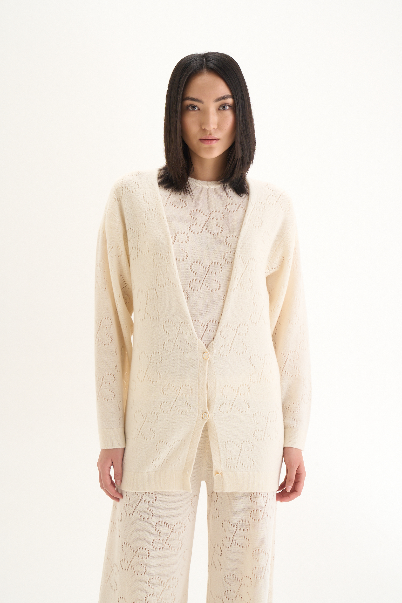 Глубокий вырез формирует открытую, вытянутую линию и позволяет легко варьировать образы — носить кардиган нараспашку или застёгнутым. Ажурное плетение добавляет изделию выразительность и тонкую визуальную игру, оставаясь сдержанной и ненавязчивой. Застёжка на пуговицы завершает модель и делает её удобной для повседневной носки.