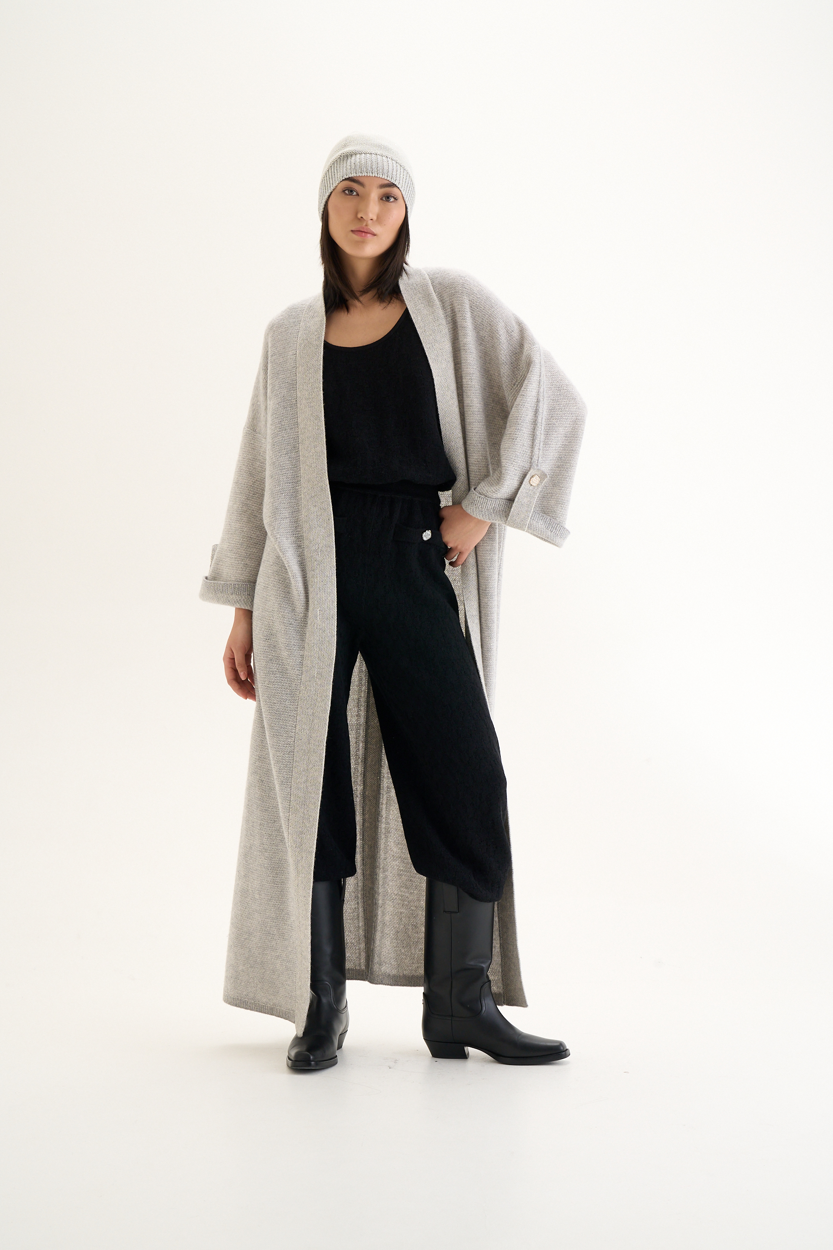 Свободный силуэт формирует расслабленную вертикаль и позволяет кардигану легко наслаиваться на разные образы. Рукав 7/8 открывает линию запястья и сохраняет ощущение лёгкости, несмотря на длину изделия. Отсутствие застёжек подчёркивает минимализм конструкции и даёт возможность носить кардиган в открытом, текучем формате.