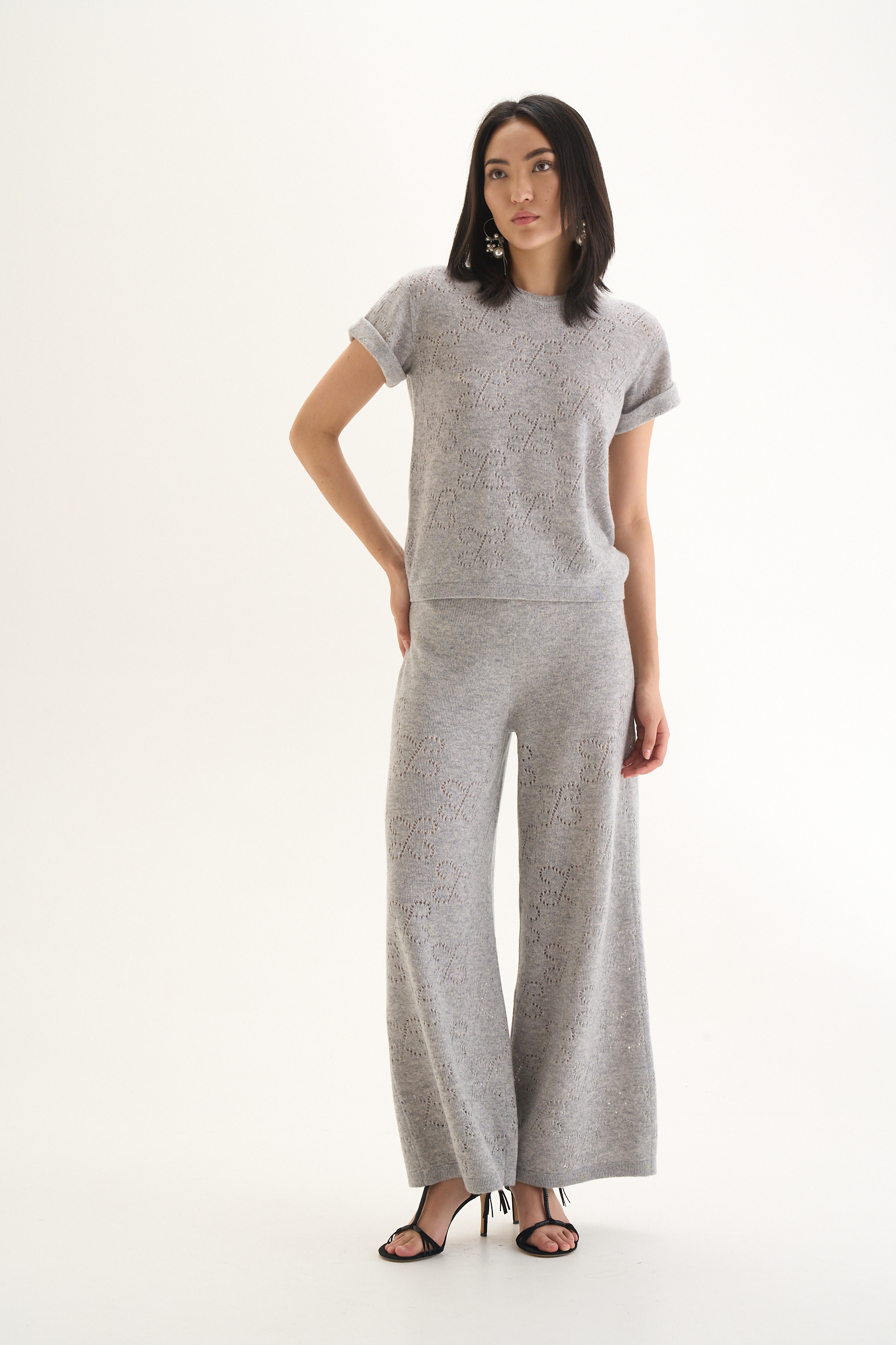 Брюки из кашемира с ажурным эффектом подчёркивают глубину фактуры и делают узор сдержанно выразительным. Ажурное переплетение создаёт лёгкую игру света и добавляет поверхности визуальный ритм, оставаясь тактильно комфортным.