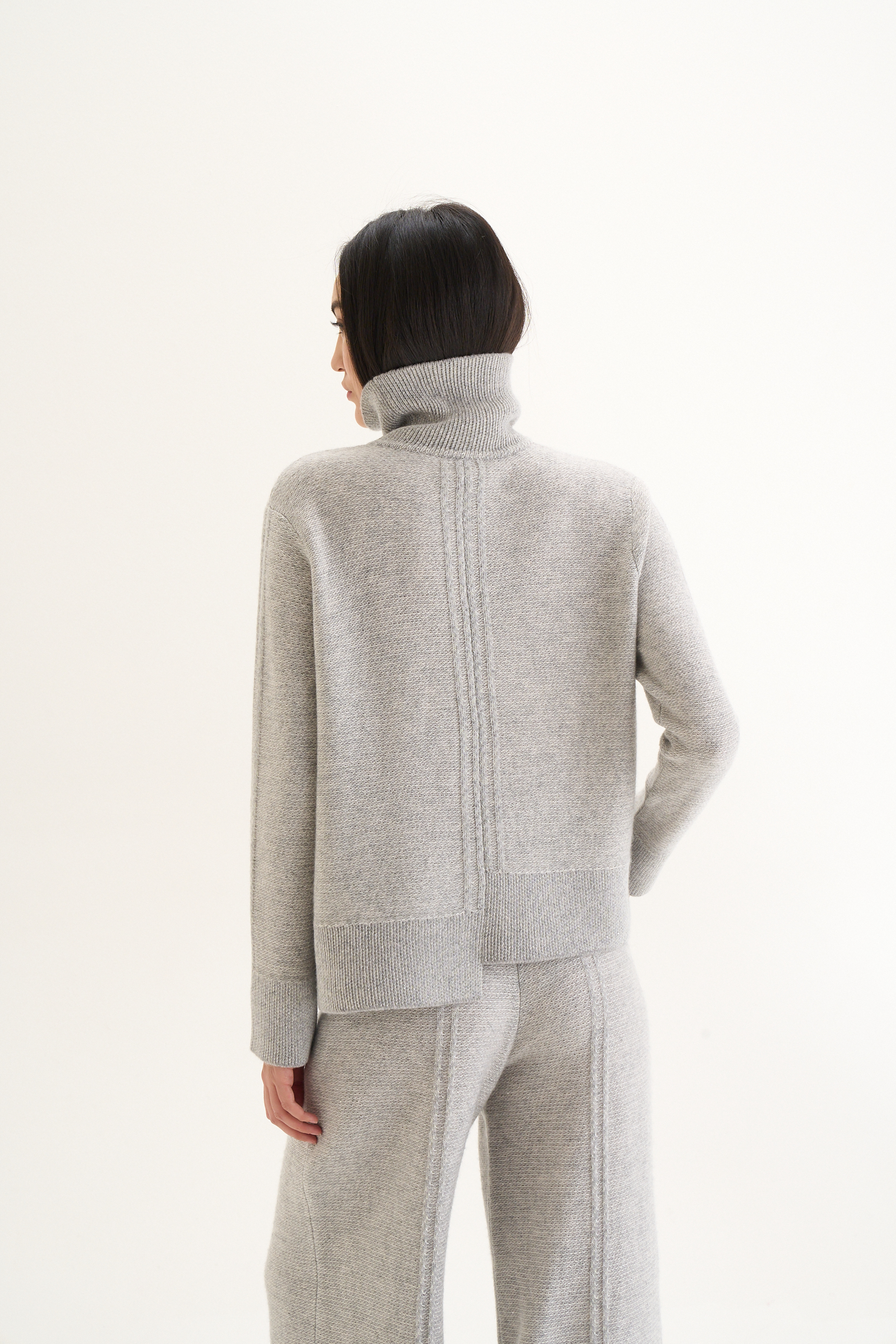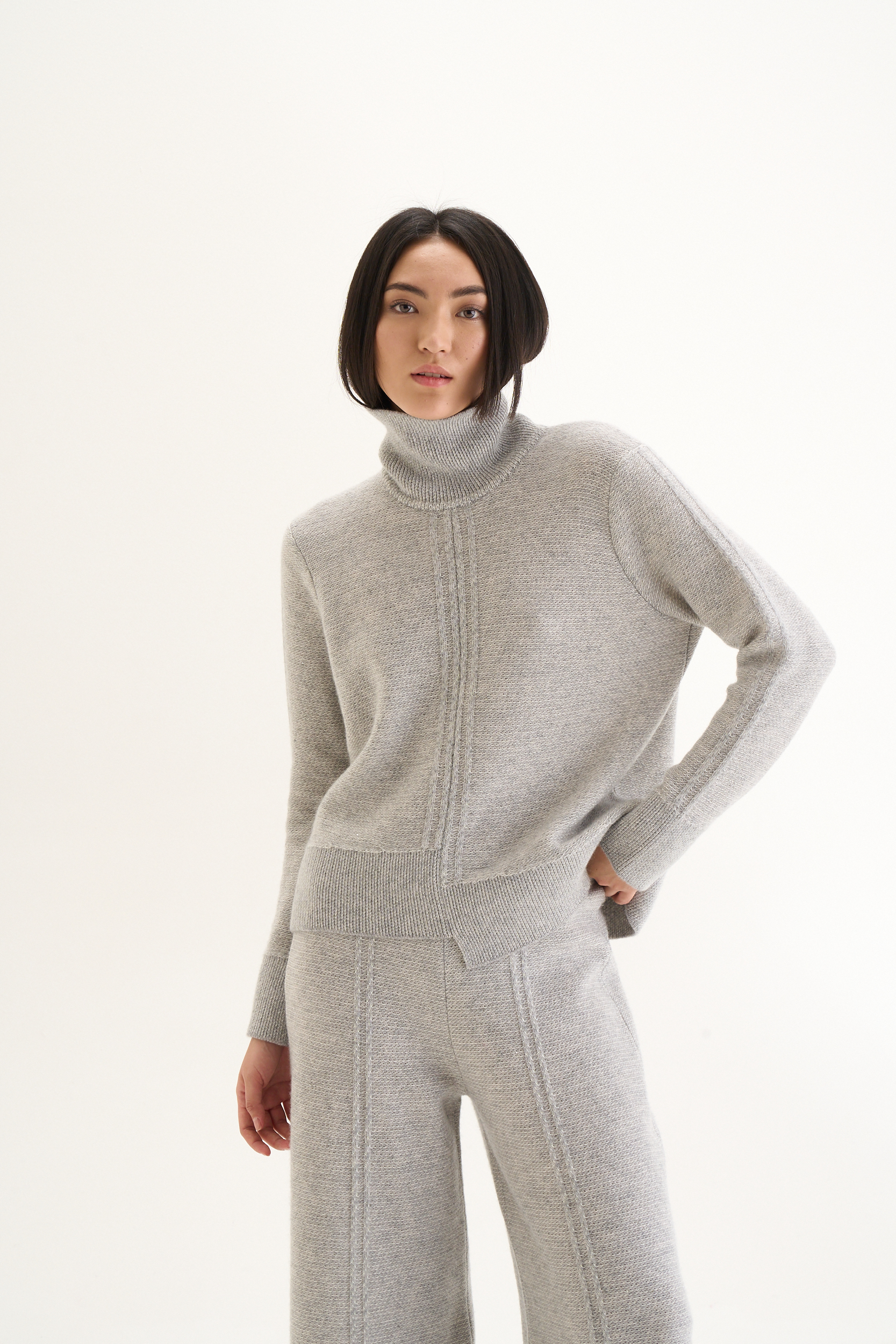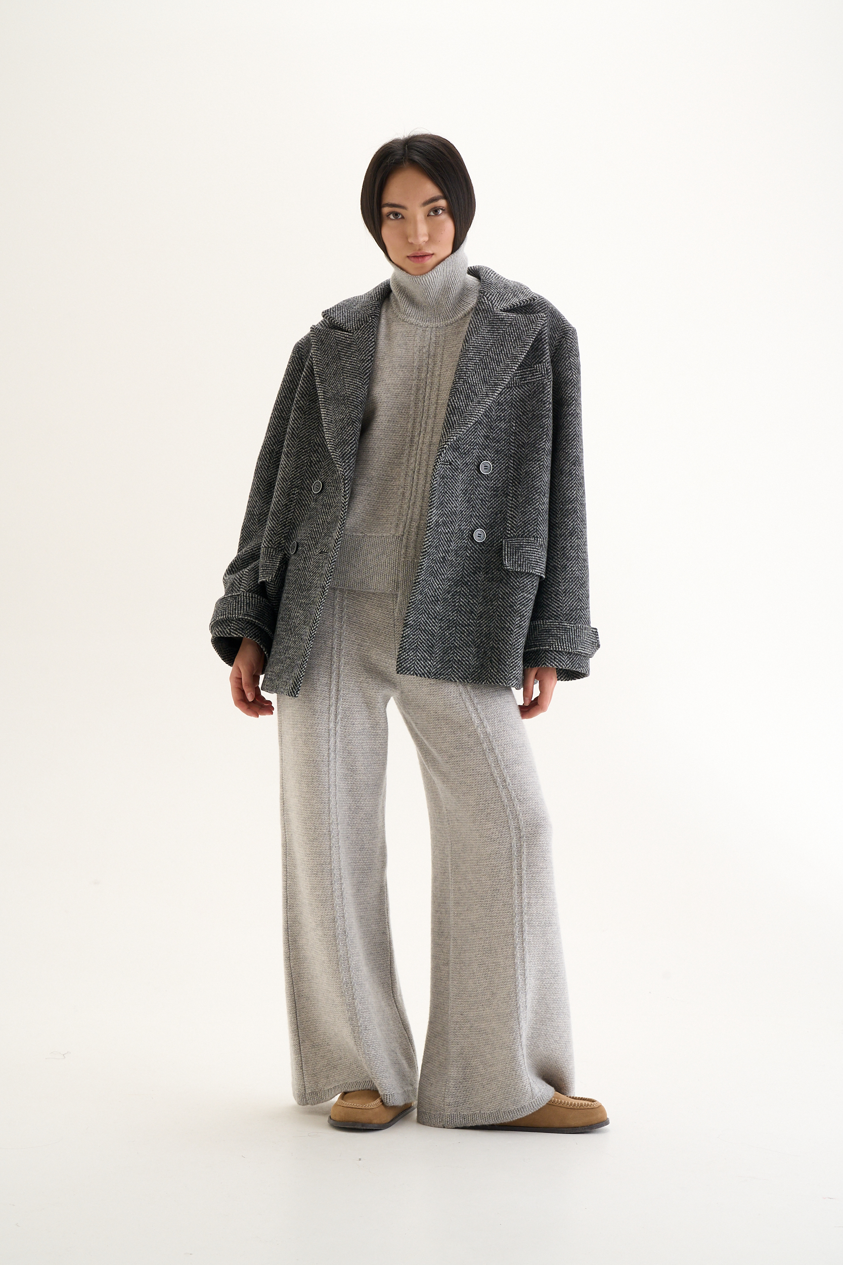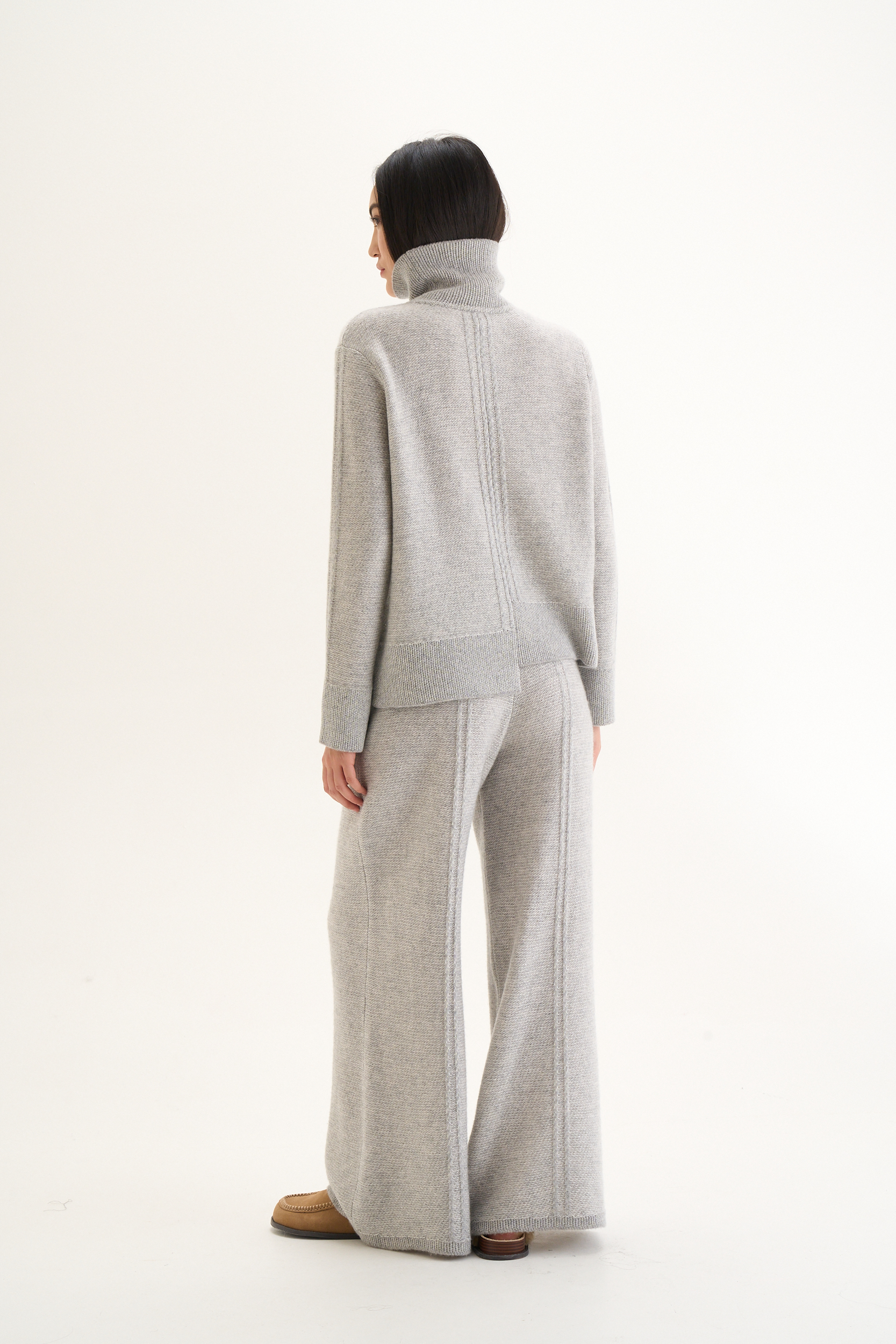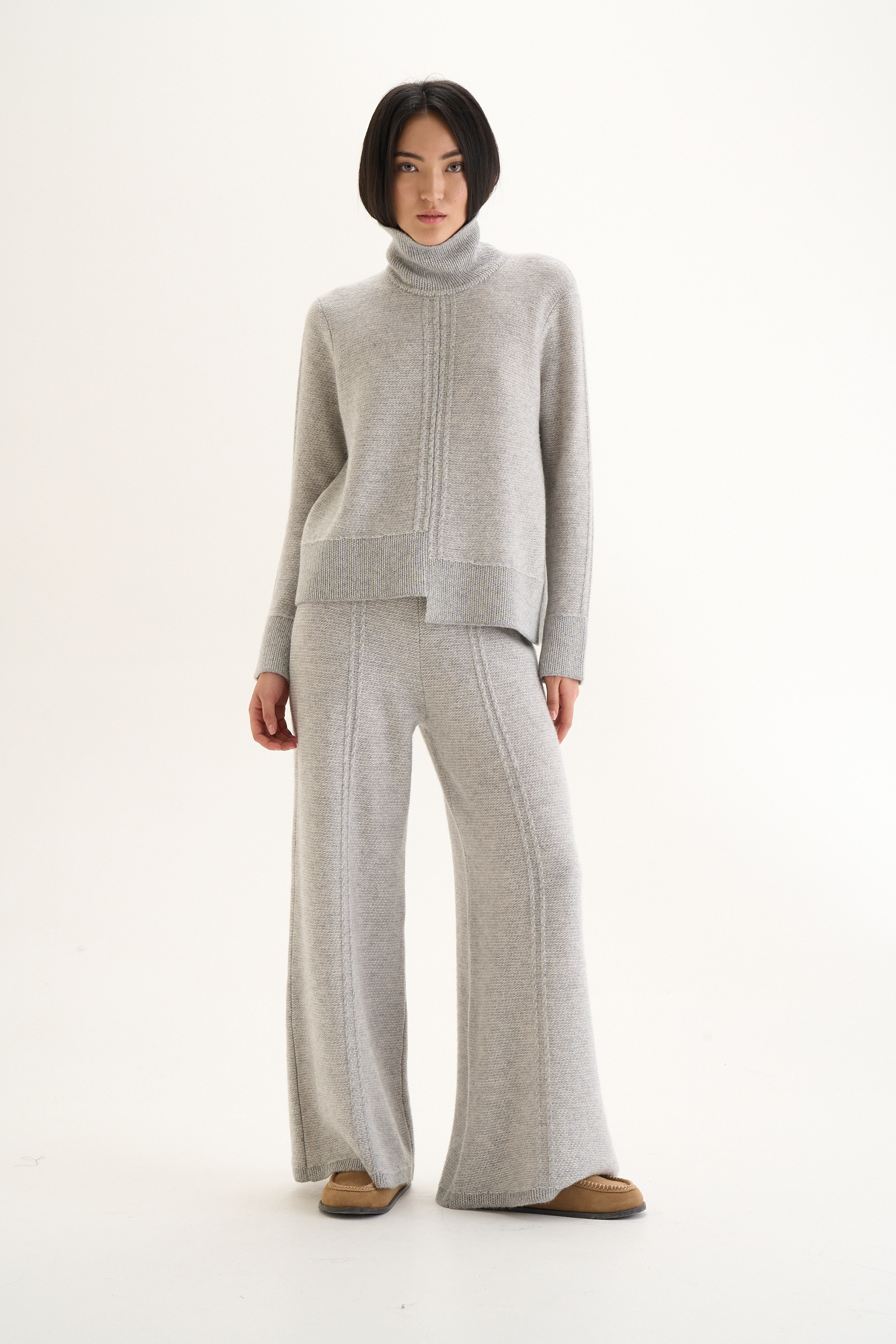 Брюки из кашемира с микропайетками, который подчёркивает мягкость материала и делает мерцание особенно деликатным. Микропайетки вплетены в полотно равномерно и дают тонкий световой эффект, заметный в движении и при разном освещении.
